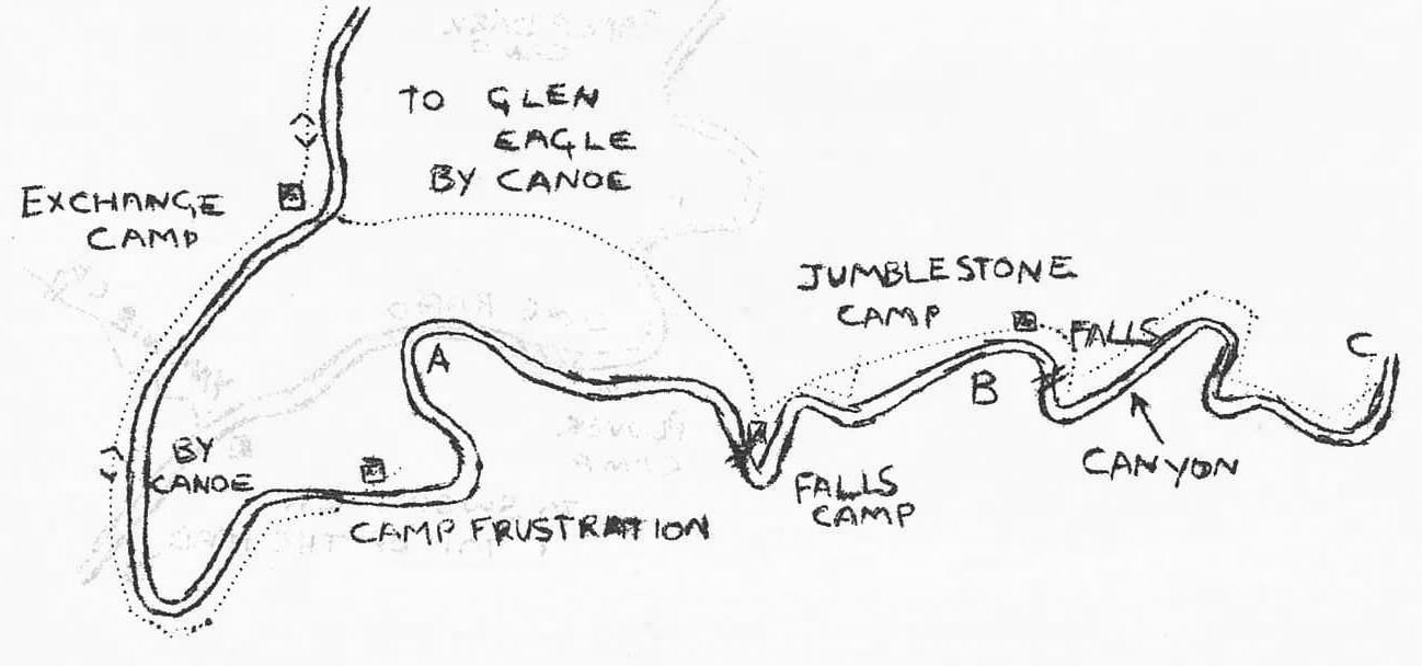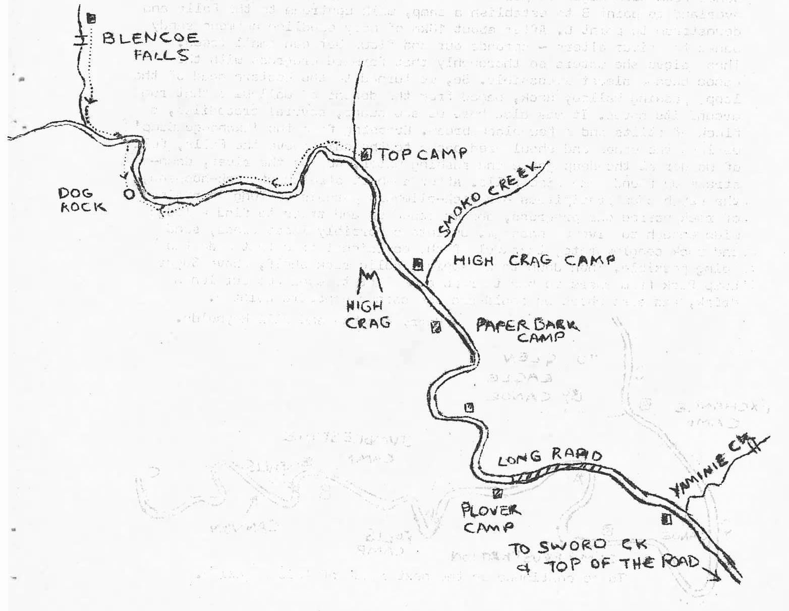 - After completing this trip, Ron decided to see the whole gorge in one trip. He spent a whole day dragging and absailing himself and a kayak down the wrong ridge beside Blencoe Falls (over 1000 feet). Two wonderful days of rapids later, Ron + paddle + Kayak emerged at the end of the Abergowrie Road.