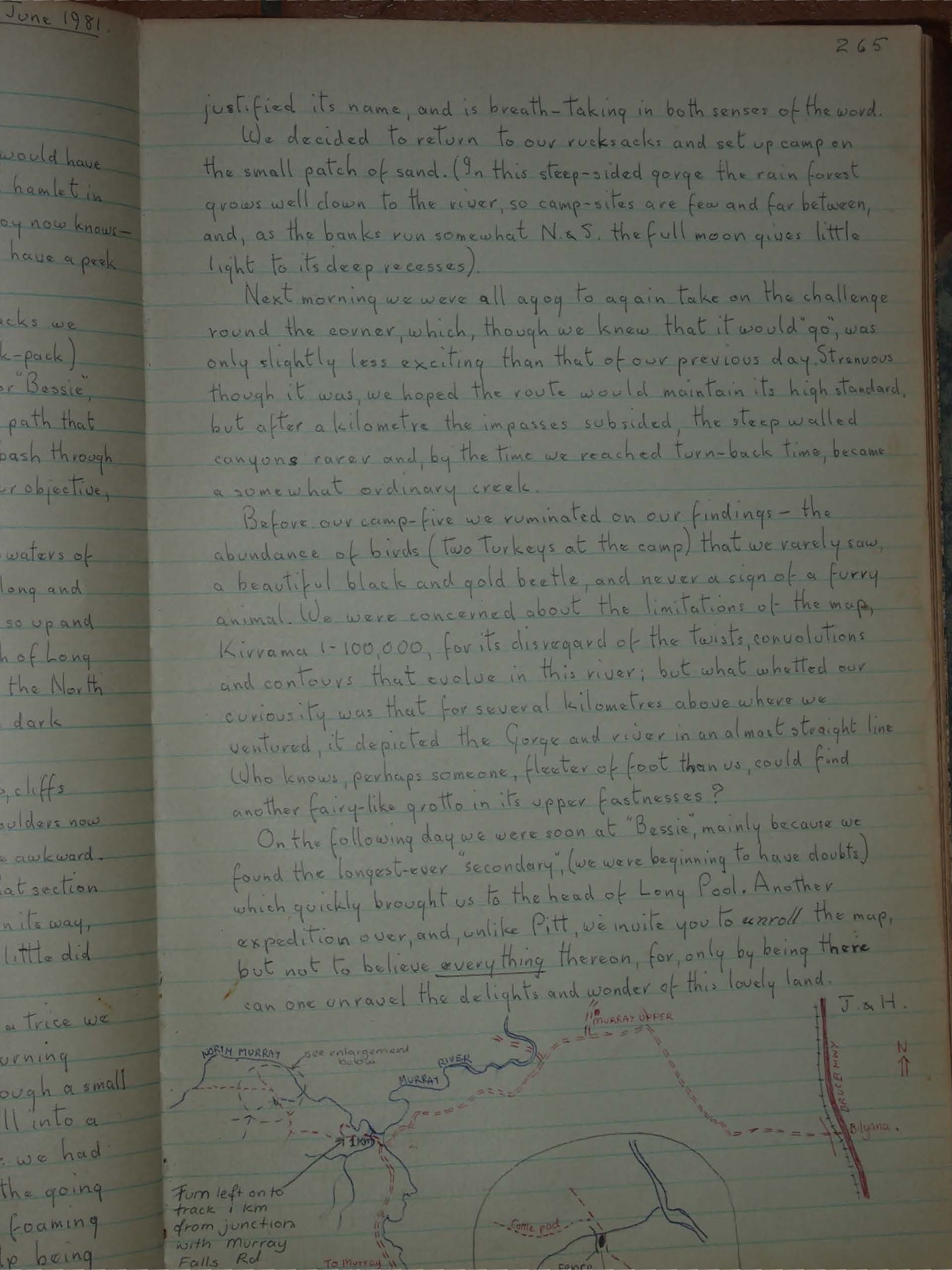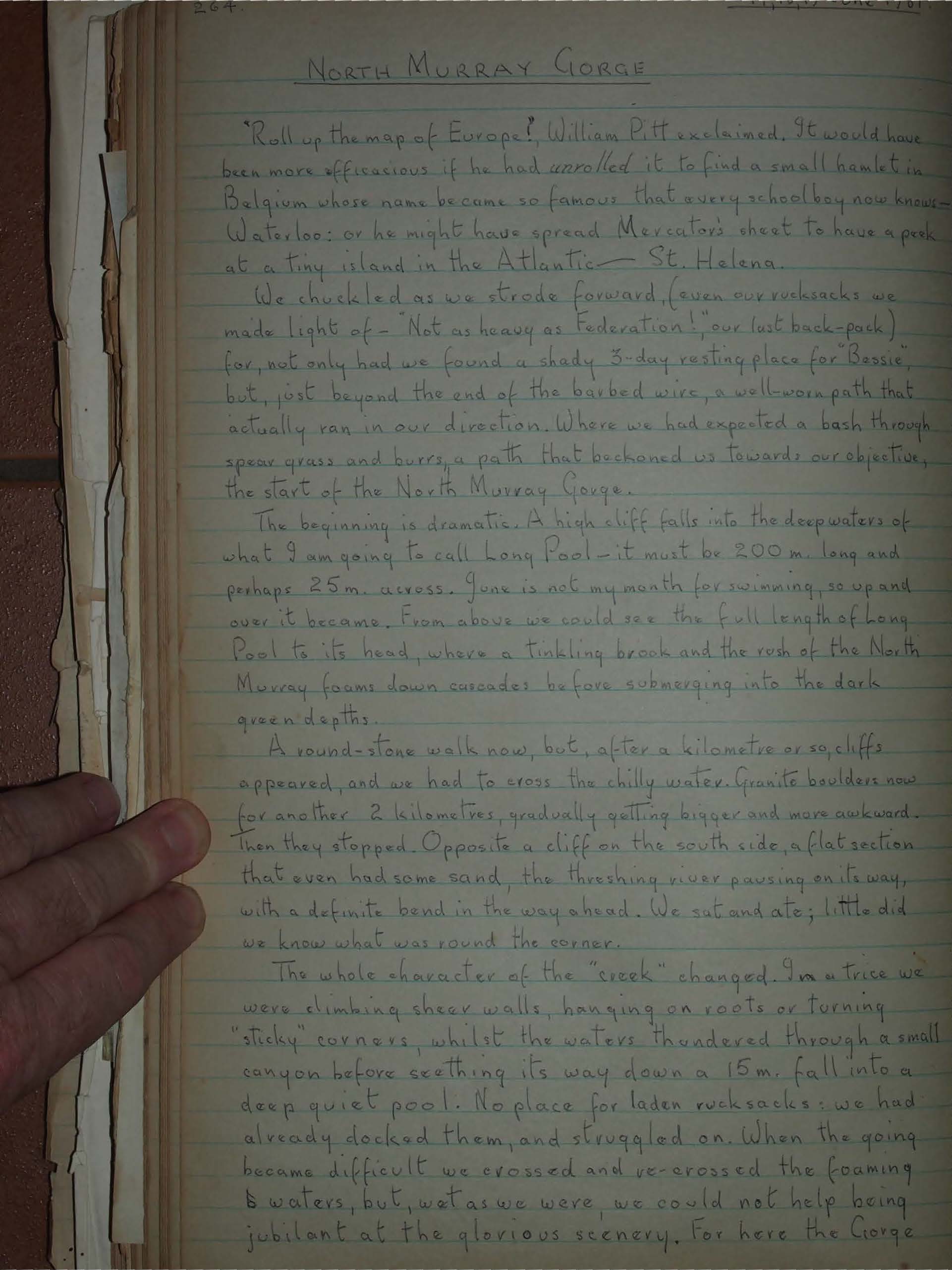 The beginning is dramatic. A high cliff falls into the deep waters of what I am going to call Long Pool - it must be 200 m. long and perhaps 25 m. across. June is not my month for swimming, so up and over it became. From above we could see the full length of long Pool to its head, where a tinkling brook and the rush of the North Murray foams down cascades before submerging into the dark green depths.