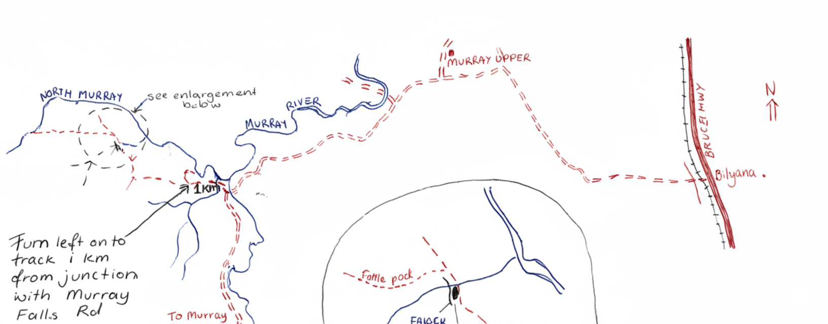 We chuckled as we strode forward, (even our rucksacks we made light of - "Not as heavy as Federation", our last back-pack) for, not only had we found a shady 3-day resting place for Bessie, but, just beyond the end of the barbed wire, a well-worn path that actually ran in our direction. Where we had expected a bash through spear grass and burrs, a path that beckoned us towards our objective, the start of the North Murray Gorge.