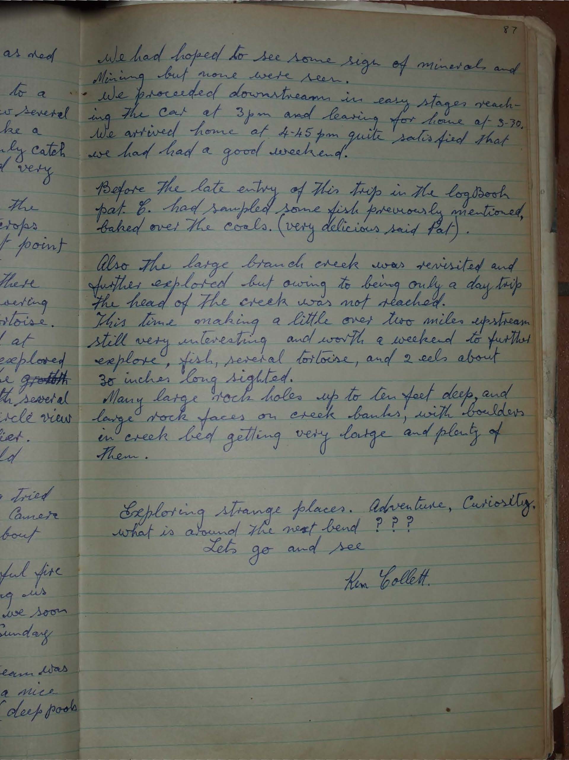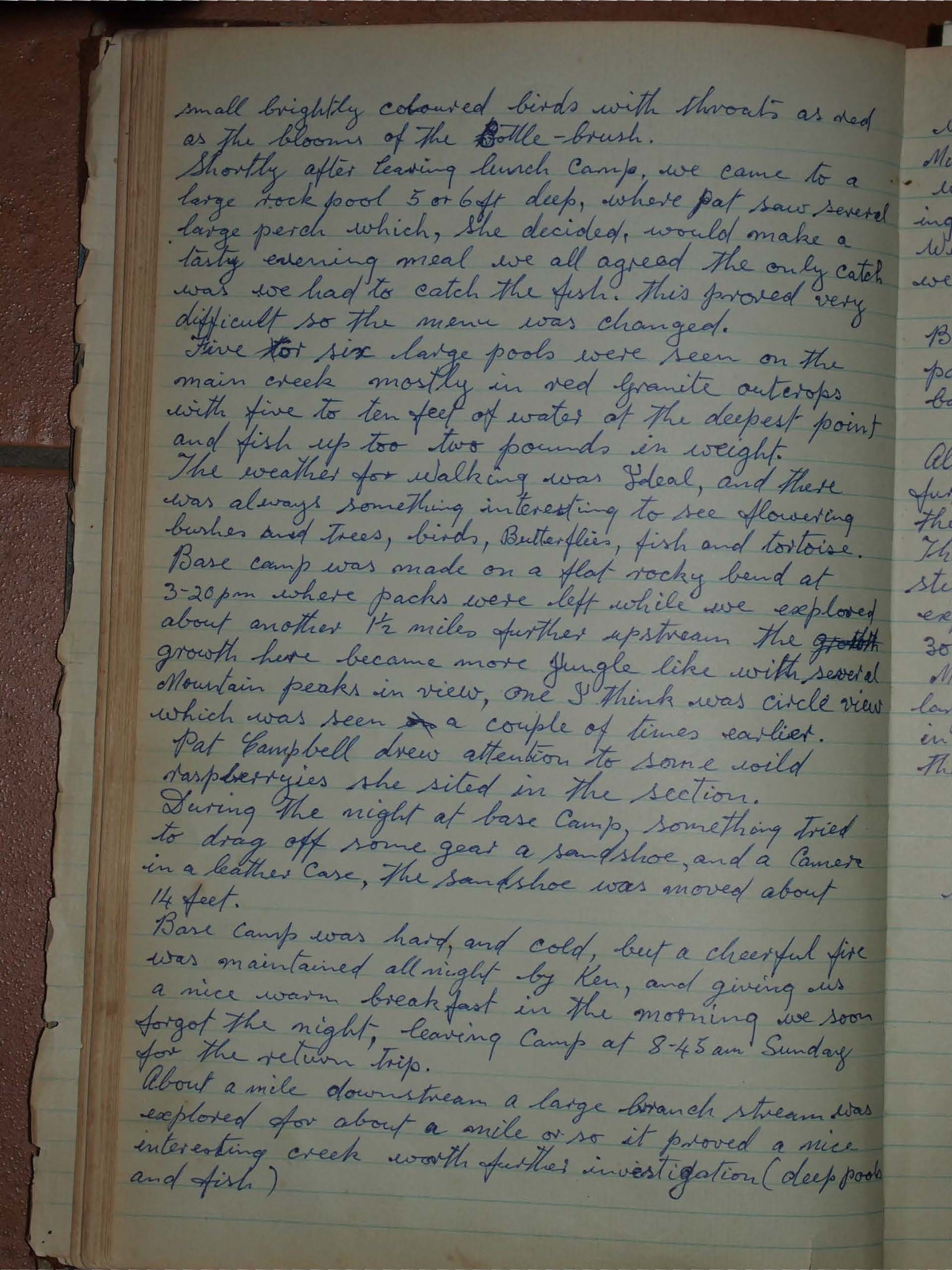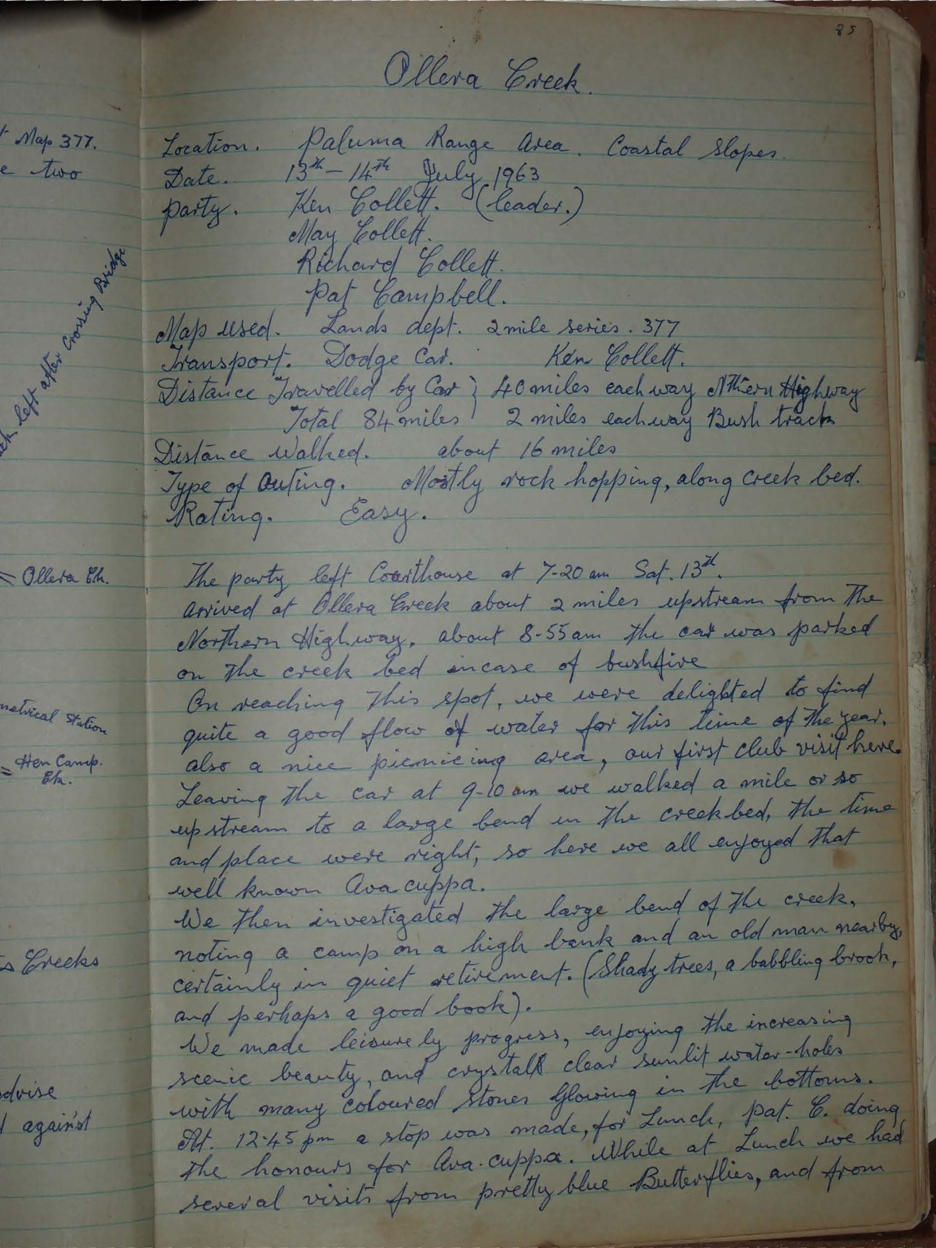 The party left Courthouse at 7-20 am Sat. 13th arrived at Ollera Creek about 2 miles upstream from The Northern Highway, about 8-55 am. The car was parked on the creek bed incase of bushfire.