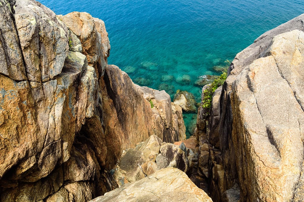 Sunday, six of us head off at 9 am for the full day adventure. Decide to do the traverse first, then circumference later at low tide. Leaving behind a perfectly good beach, swimming and snorkelling, prepared for a bush bash to the summit (why ? – because it is there and we must do it !). We go north to try a ridgeline, and find a marked route. Follow that up the ridgeline, easy going, no bush bashing. A junction with a side track to Barnacle Beach (north east corner of island), we can try that later. Continue up along the ridgeline, following the easy trail, to reach the summit. Heading south, start a short descent, then we leave the marked route and head for the east coast. Now bush bashing but easy going, enter a dry creek line, have lunch. Looking at the GPSr, we are almost at the coast, but still 100 mr elevation –‘we must have a big drop off ahead’ I was thinking. Nobody else seems concerned though. Shortly after, we found that drop off, 50 metre cliffs into the ocean, and the creek drops down a steep chasm into the sea. Awesome views. But how do we get through this ? We try to find a way, we can get down to platforms near sea edge but can’t see around the corner, and this coastline will be all steep cliffs and blockages and not viable. Try the vegetation area at top of the cliffs, thick gnarly coastal stuff that we can’t get through. We stay here for a while to admire the views, clear water, and see three turtles below. Dreams of kayaking the island instead now surface. Or maybe a rock climb/ swim / rock climb / swim along the coast for the super adventurous?