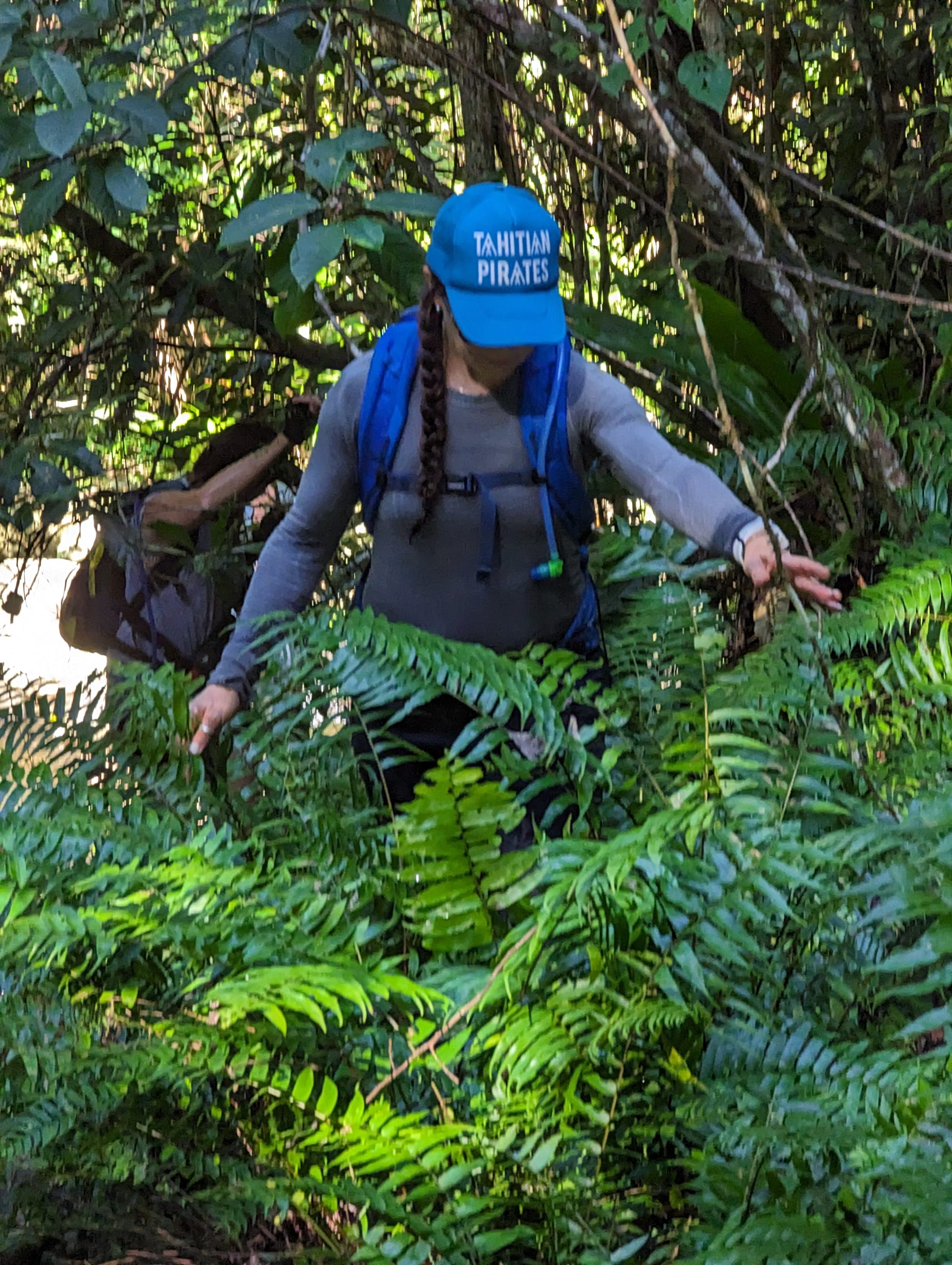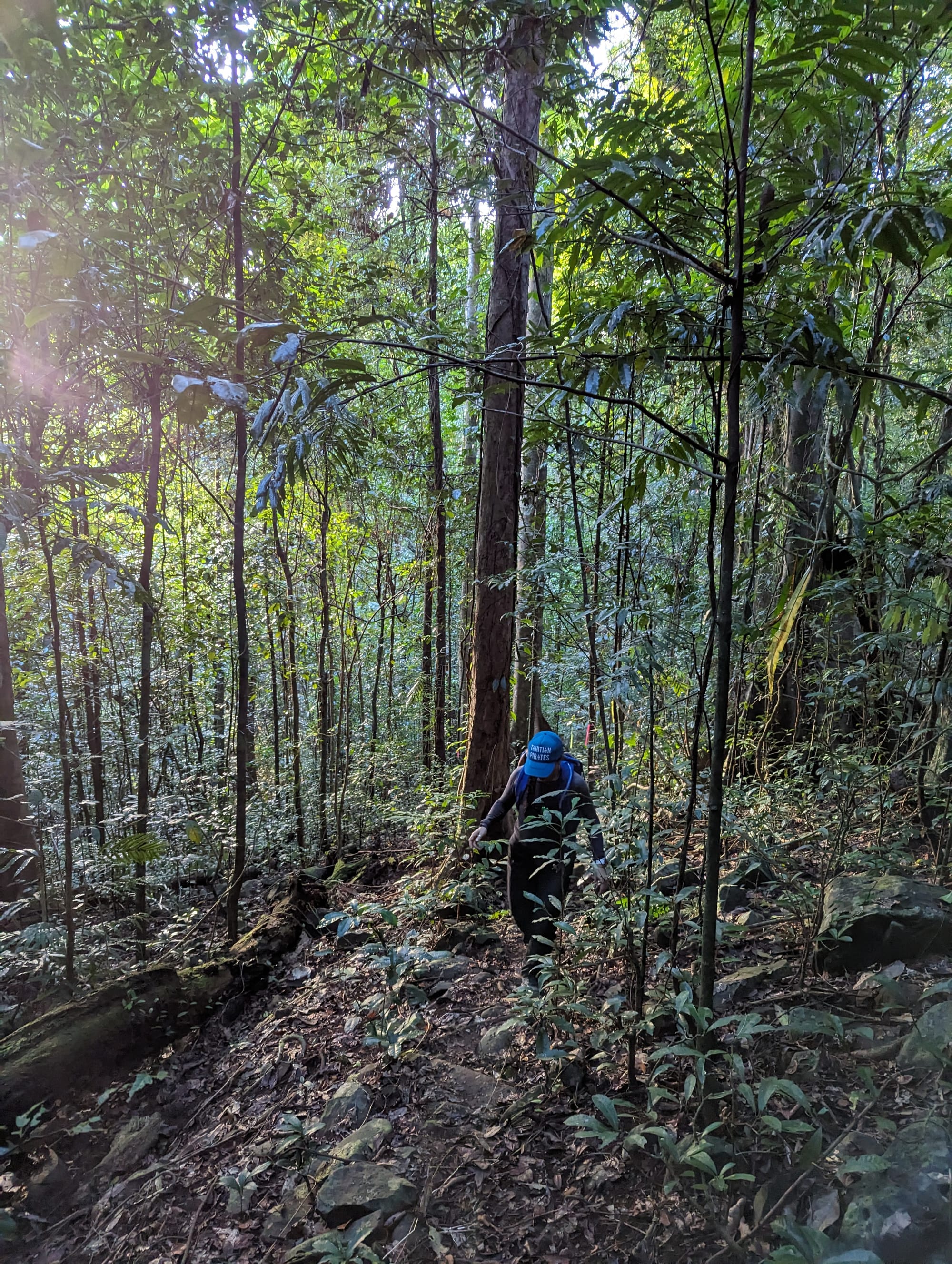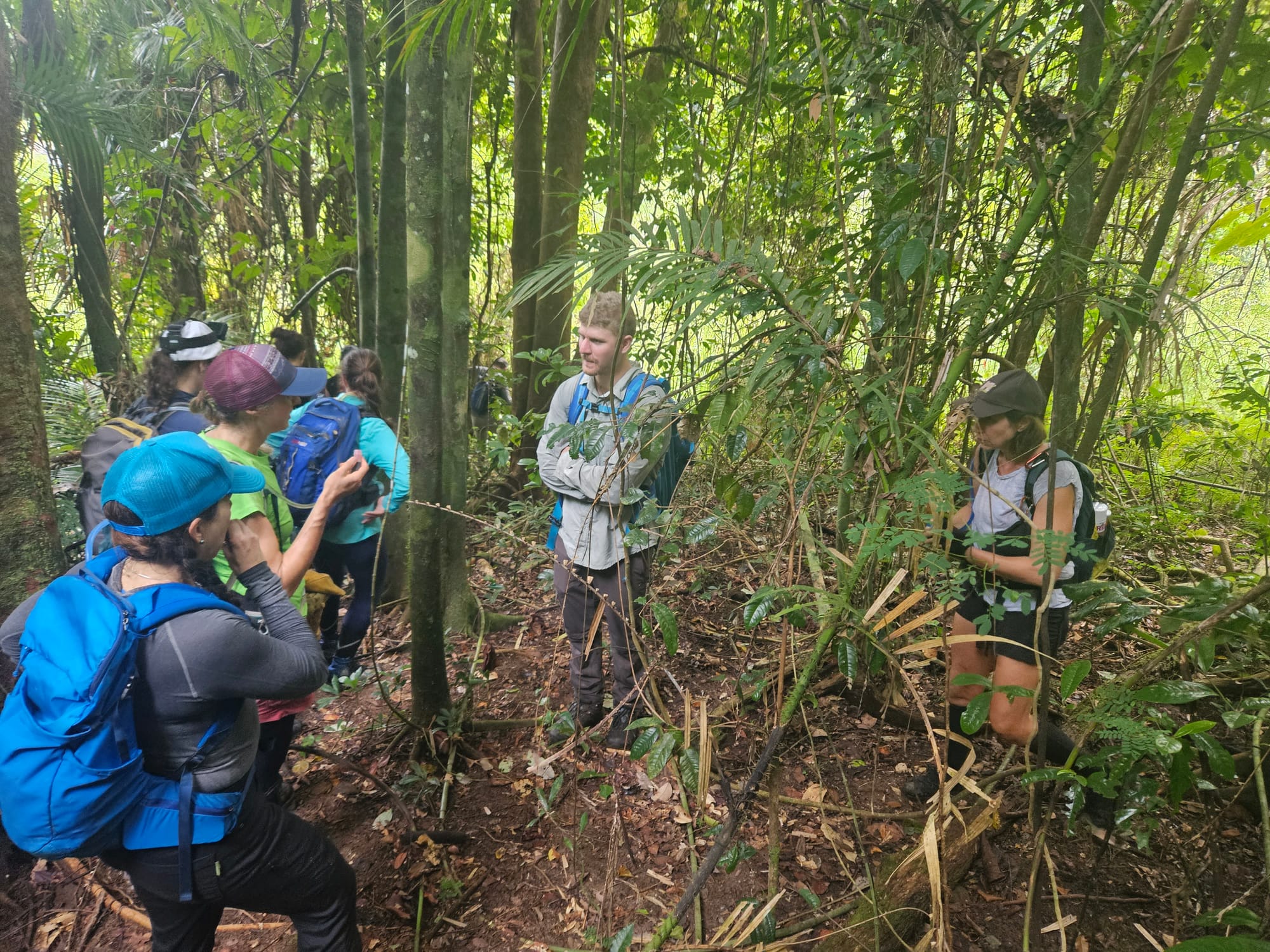 We met at the somewhat hidden trailhead, where pink tape marked the start of the route. This faint, purple dashed track shown on QTopo as the Pine Trees Track, has been cleared and remarked in recent years, but it still feels very much like a forgotten path disappearing into dense rainforest.