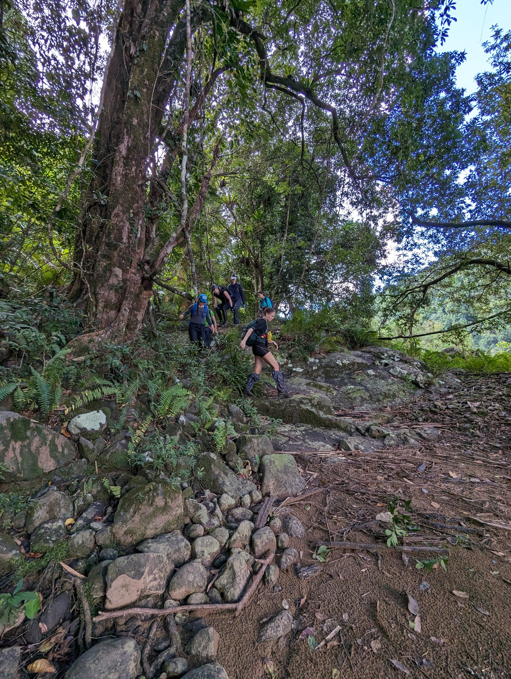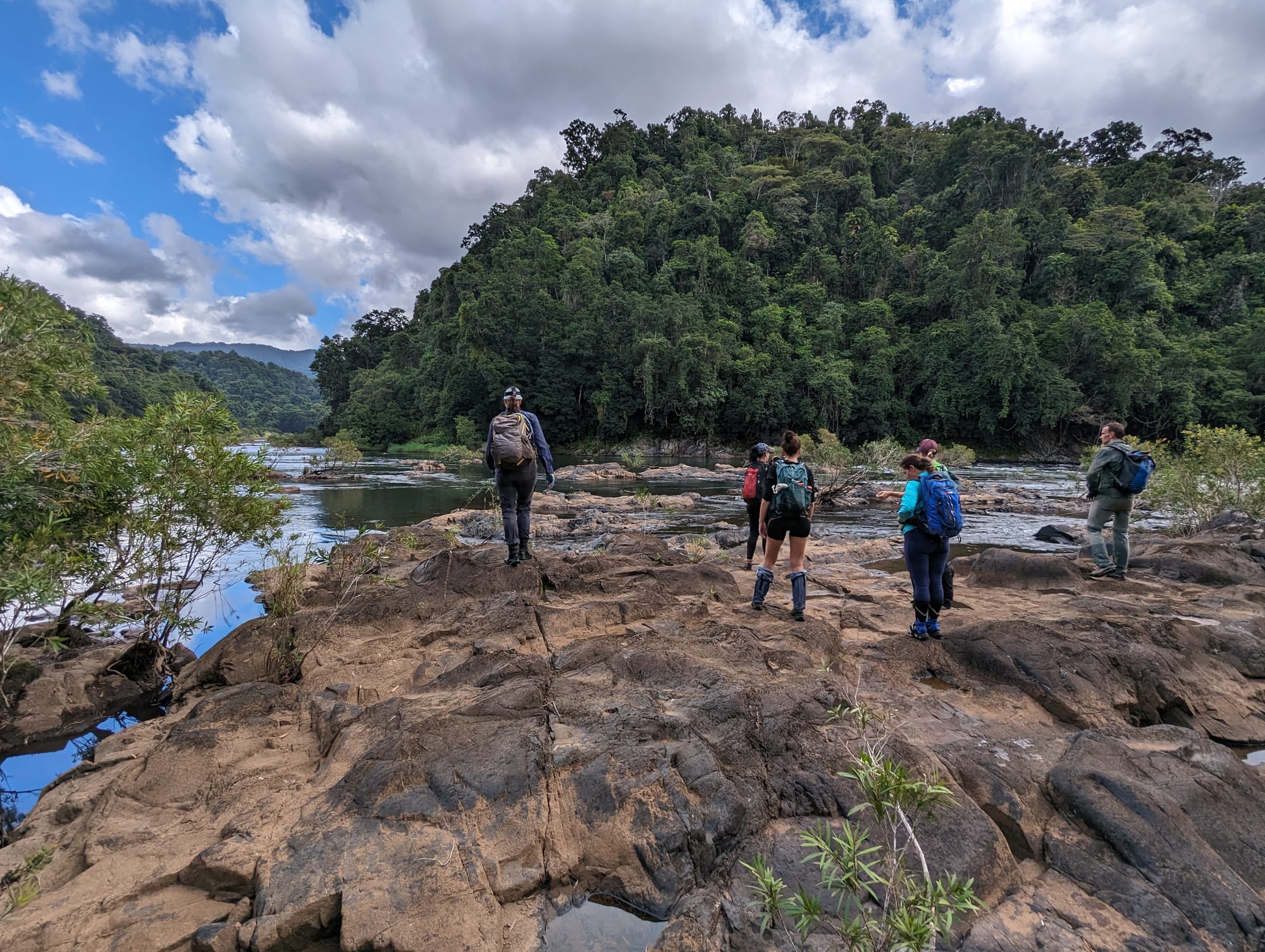 From the start, the track dropped steadily down through thick tropical vegetation towards the North Johnstone River. The descent was steep in places, with roots and loose soil keeping everyone on their toes as we worked our way down to river level. Before long, we arrived at the broad rocky banks of the North Johnstone - a powerful river winding through pristine rainforest. This stretch of river is known crocodile habitat, so we kept a careful watch and stayed well clear of the water's edge where possible.