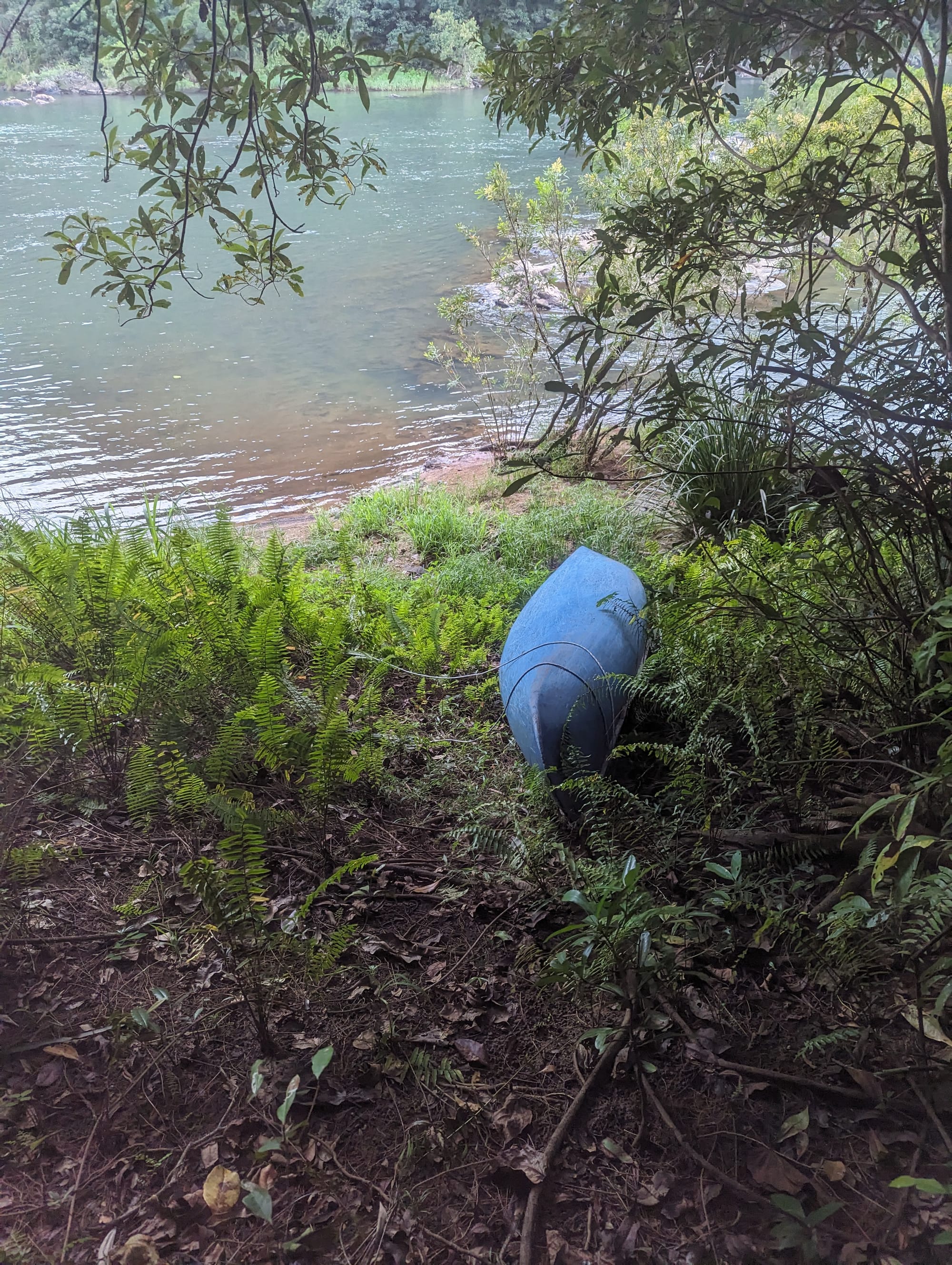 The next challenge was making our way upstream along the river. Progress involved weaving through thick vegetation and scrambling across large granite slabs along the riverbank. At one point we even spotted a green canoe sitting abandoned beside the river - a curious sight in such a remote place.