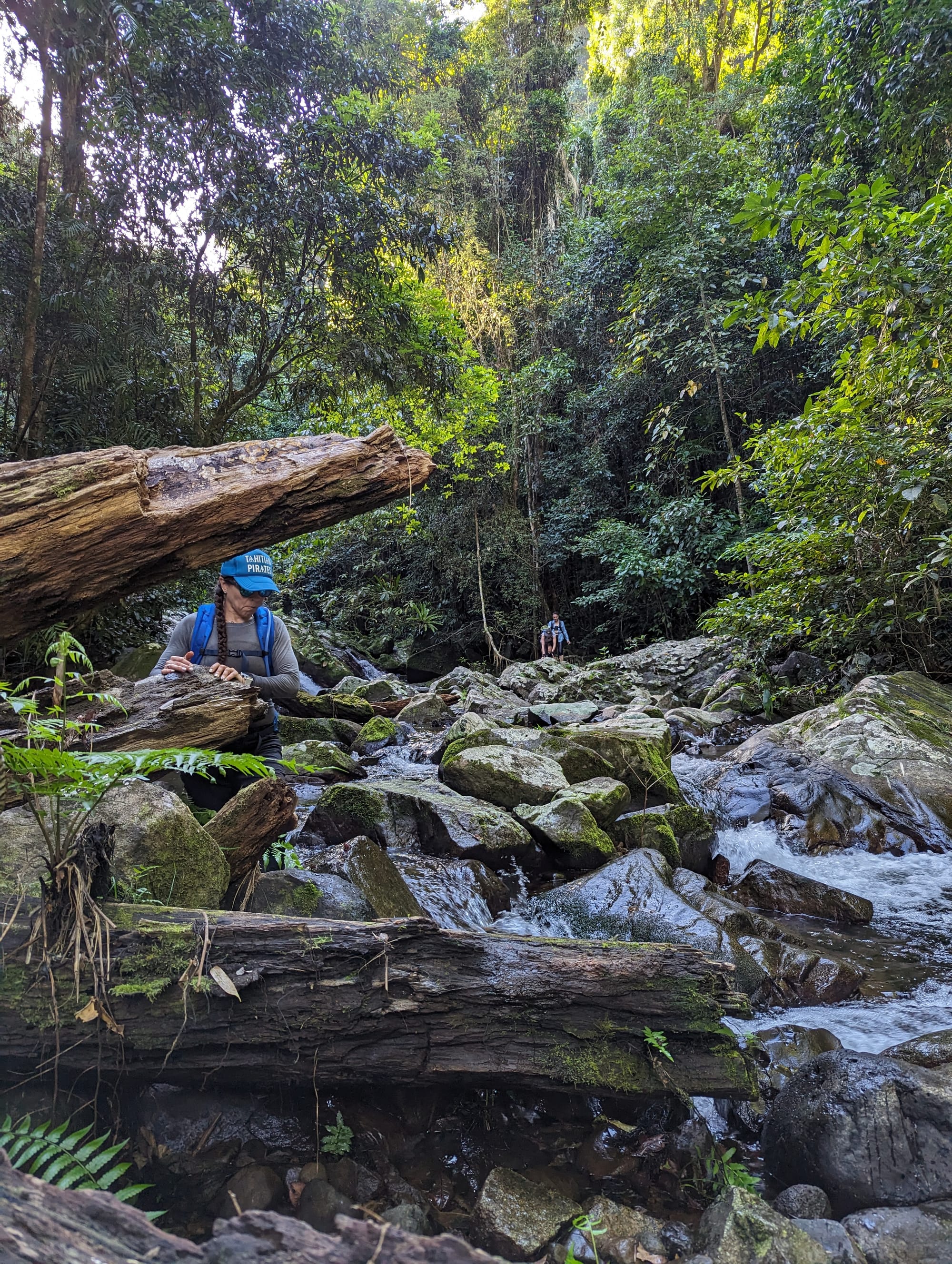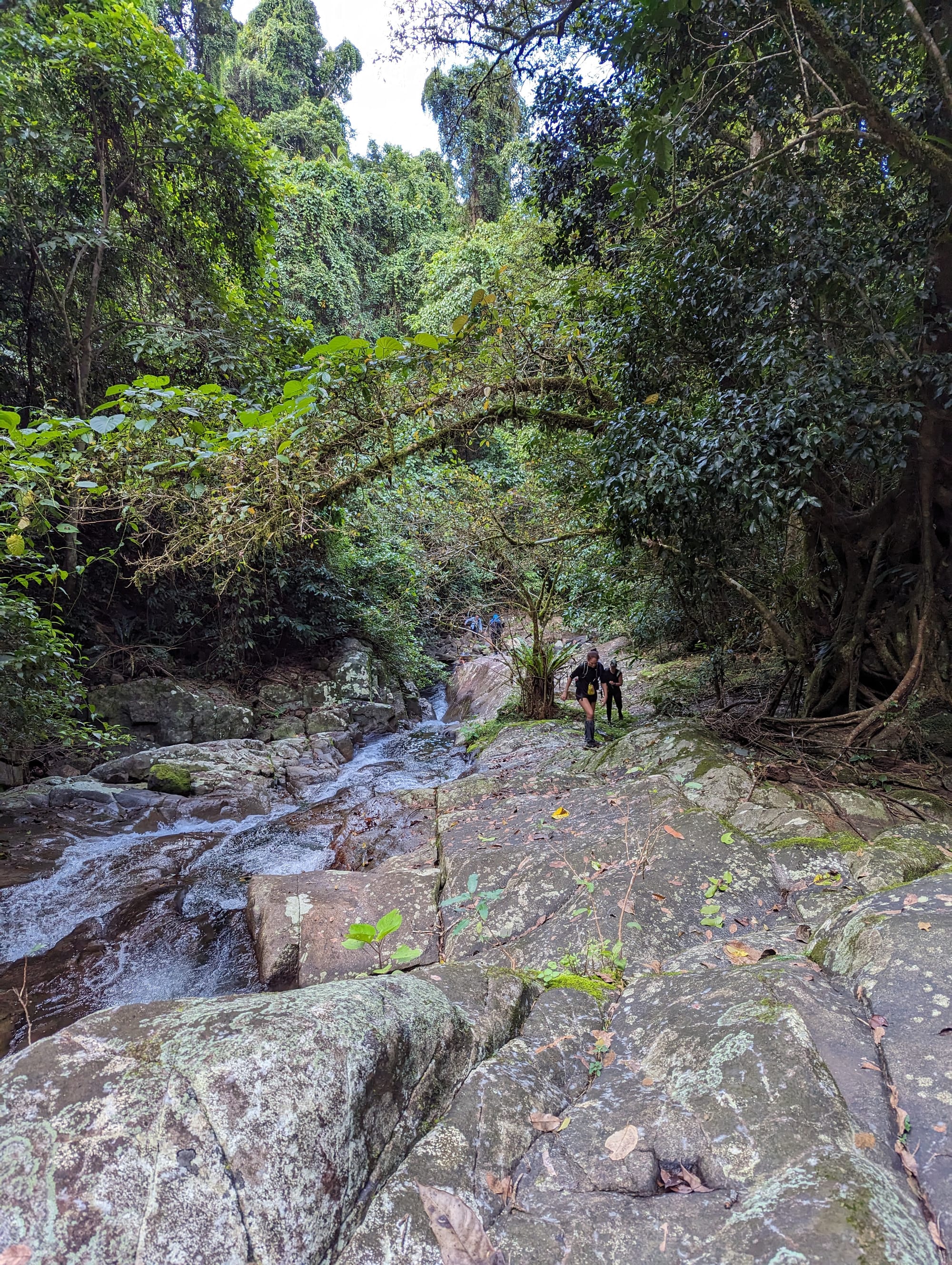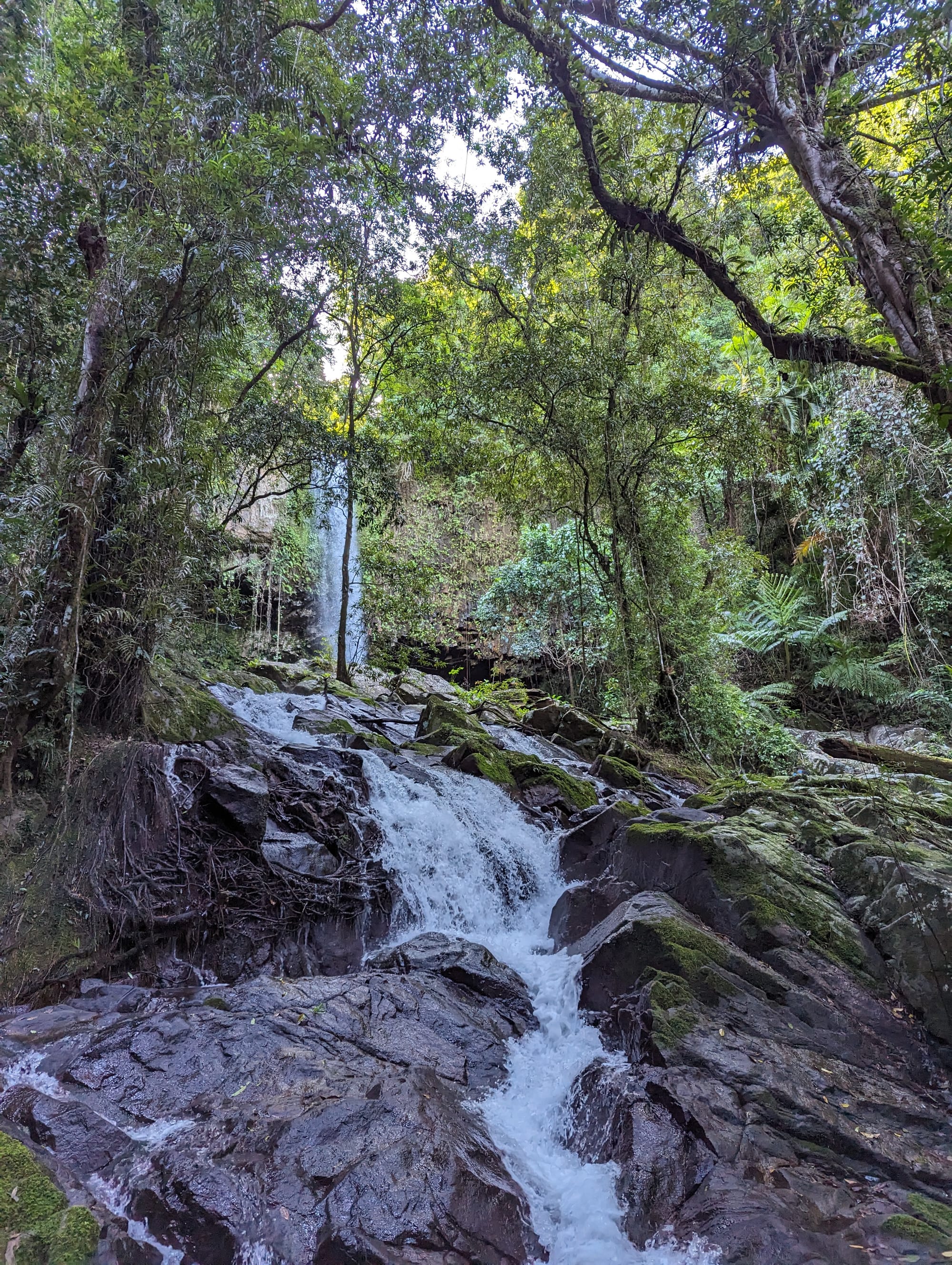 Once safely across, we continued a short distance upstream before entering a small tributary that led us towards the first waterfall of the day. After a short scramble up the creek, we arrived at a beautiful two-tier waterfall split by a ledge halfway down. The formation immediately reminded Luen of Amphitheatre Falls along the Russell River. Later we discovered that this waterfall is known as Split Falls, which feels like a fitting name for the way the cascade breaks in the middle.