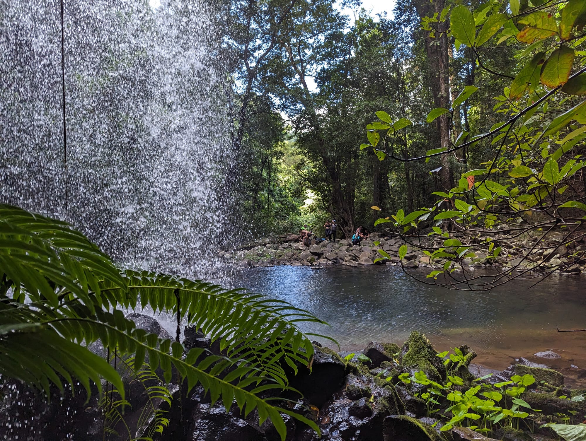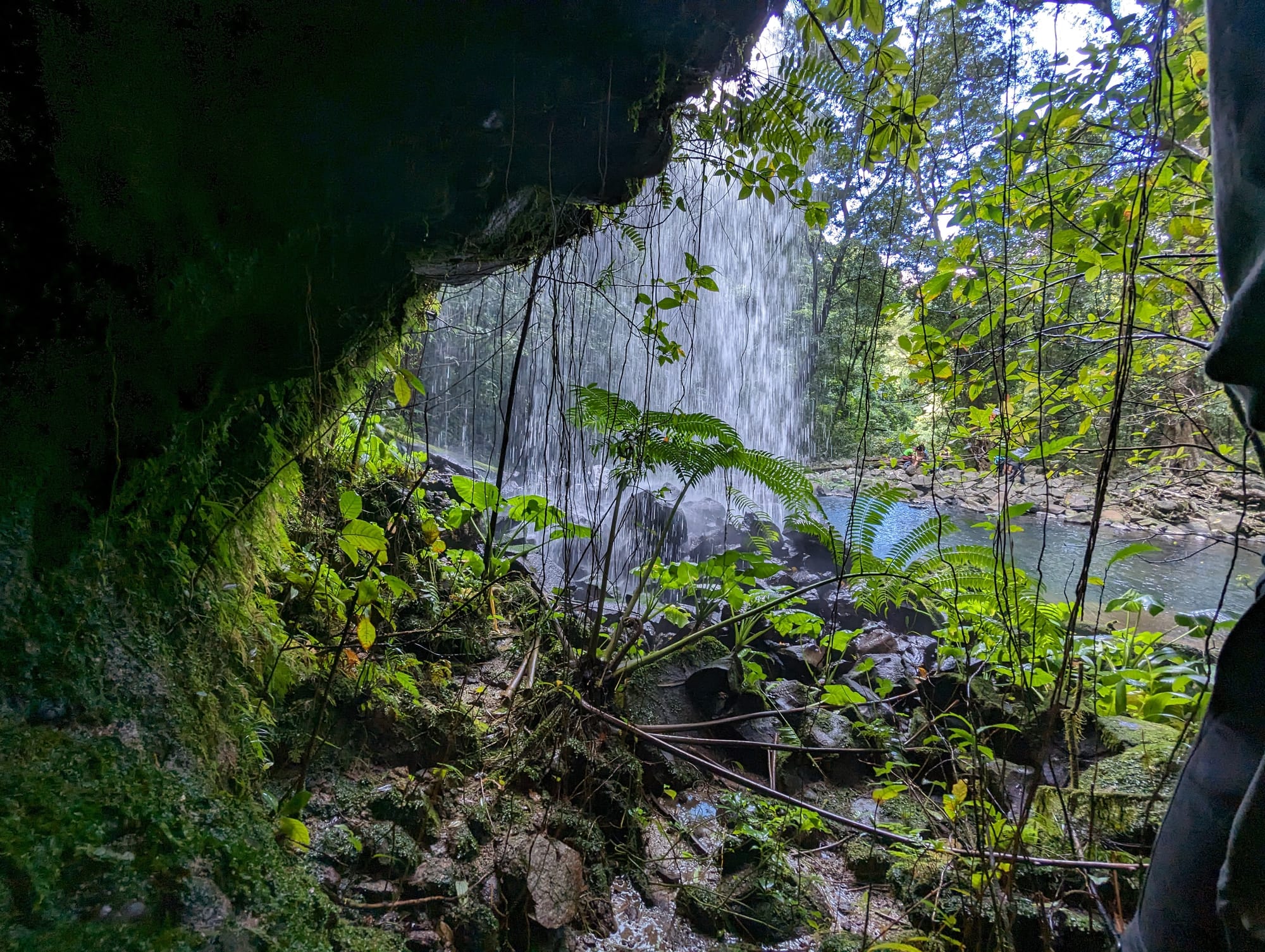 After spending some time enjoying the falls, we returned to the North Johnstone River and continued downstream to the next tributary. Following this small creek inland led us to our second waterfall of the day, Cave Falls. This one was completely different in character - an elegant curtain of water dropping over a rock overhang into a quiet pool below. The overhung rock wall gave the waterfall its name and created a beautiful sheltered amphitheatre beneath the cascade.
