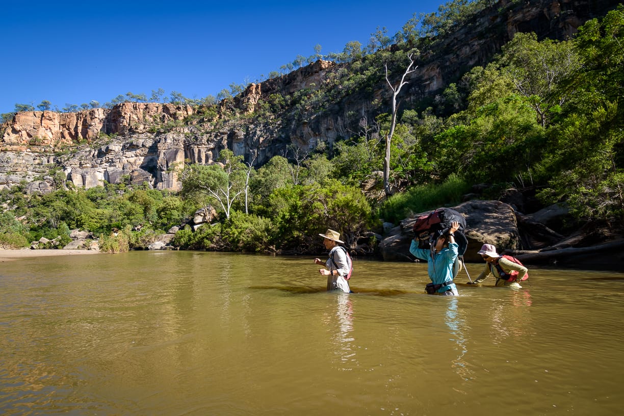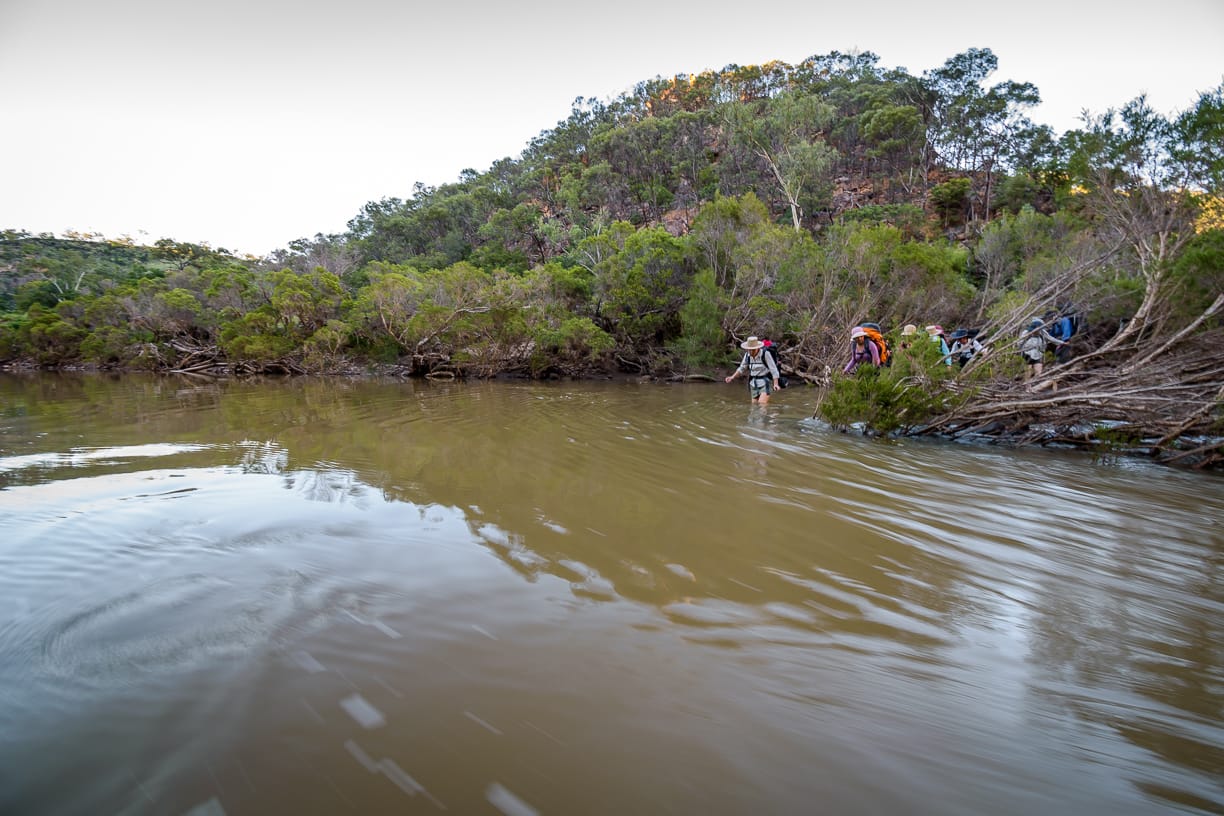 “What, we have to follow you? Your six foot tall, some of us are a lot shorter you know, and that was over your waist!”. “Toughen up princesses”. As they cross over to join me, I look at that turbid water, thinking again, oh crap, I don’t want to drink this water for four days. Ah well. We then proceed on the east bank, heading south down the gorge. Plan is to get to the Amphitheatre 6 km walk downstream from the Pyramid this arvo to make base camp. Minor rock hopping, long grass walking, and through trees. We then try to get to the west bank, but are blocked by a creek channel that looks too deep. So we bash our way down an island (how did we get on an island ?) through River Tea Trees Melaleuca bracteata, stumbling over fallen branches and in soft sand, slushing in shallow water, looking for a crossing point, but the two creek channels were deep looking or too fast flowing. Finally, we find a suitable looking crossing back to the east bank, not sure how deep, but just have to try it. Borrow a hiking stick from Brent to use as depth measure, our leader plunges into the creek and wades across, again over waist height. This was to be a common result for the next three days. At one crossing, a call of ‘CROC” startled the group – relax, it was the croc shoes hanging off somebody’s pack . Sometimes we tried near rapids where water might be shallower, but the current was very fast and have to scramble through tea trees and roots making that a bit difficult as well (with hidden rocks in the water just to add to the adventure). We stay on the east bank, for a while that was good being on level rock platforms , easy, and very scenic. But at a small gully dip, that is always dry and easy, it is wet, muddy, and steep, so that was difficult for some to get across. And a red ants nest on the exit where you put your hands as you scramble up the mud slope just increased the fun.