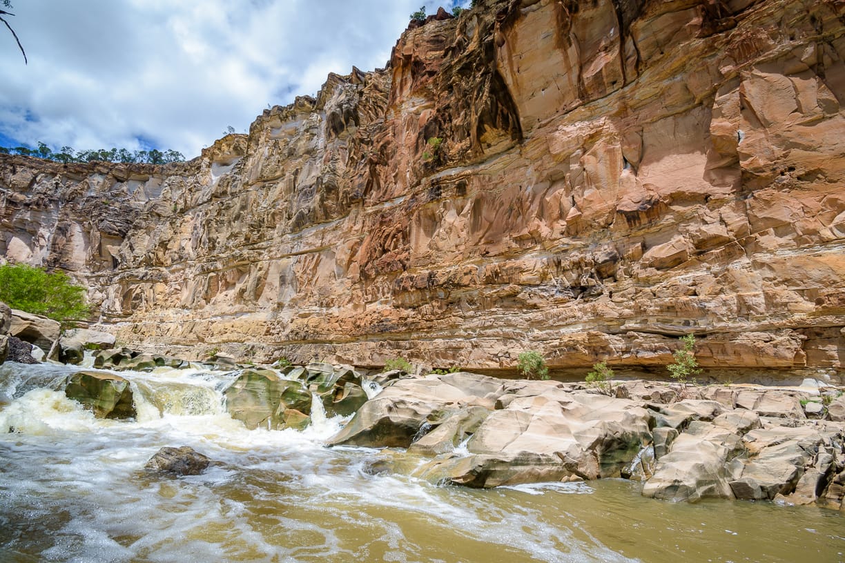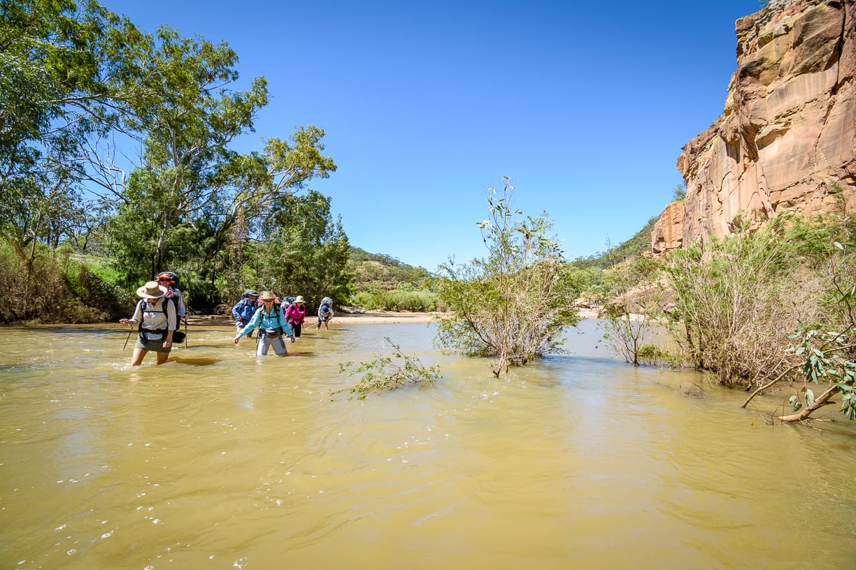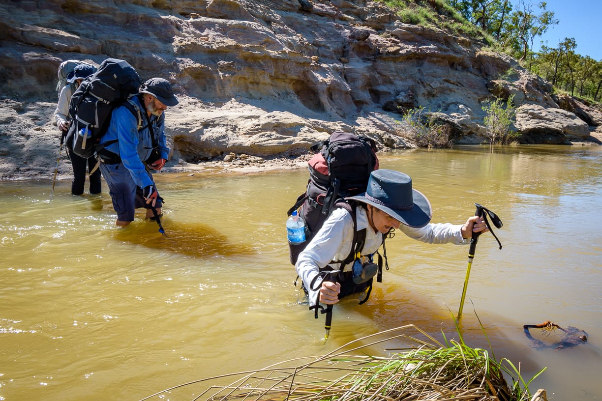 Nine keen adventurers. With briefing that included to expect several shallow creek crossings and we do not stop to take boots off, a gentle walk along the riverine environment of the gorge, camp on a nice sandbank, all are ready for an easy adventure. Although, on Saturday, we might push on further than we have previously, past the lookout area to the next gorge bend to hopefully Prairie Creek junction (yes, there is always another bend to look around). Depart Stuart at 6:15 am, short stop at Charters Towers, then pre-lunch stop at Hughenden, which became a lunch stop. Then drive 60 km north to Porcupine Gorge Lookout. On the way we cross Porcupine Creek bridge “uh oh, the creek is high, flowing very fast, and brown and turbid, that is not a good sign”. Silently I am also thinking “oh damn, I don’t want to be drinking that creek water for four days if the gorge water is like this”. 60km north of Hughenden, stop at the lookout for grand views over the narrow gorge. Standing on the lookout gorge rim sheer cliffs, pointing below, our leader says tomorrow we will be down there having lunch. The group looks on in amazement ‘what, really, down there? How?”. And down there in the gorge you can see the creek is flowing fast, brown and turbid. Drive 11 km north to the National Park campground, park cars and put backpacks on. Some in the group look startled as the leader puts on a day pack – what the ?