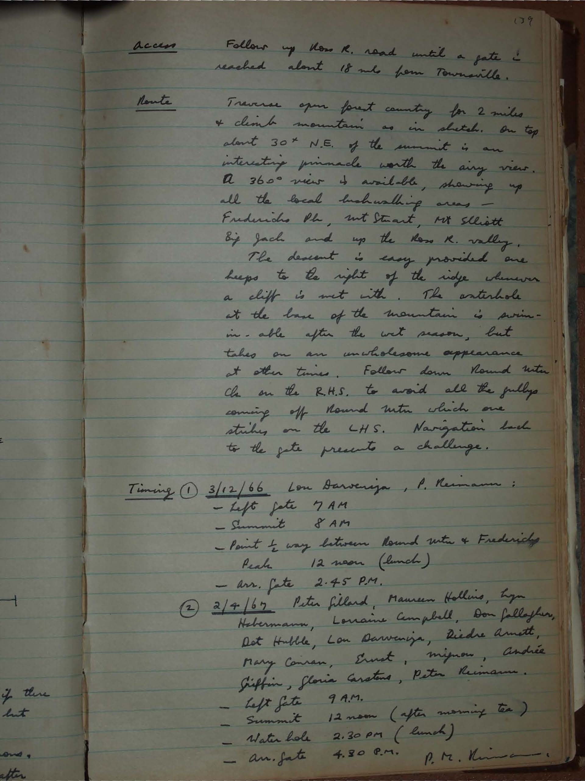 Traverse open forest country for 2 miles & climb mountain as in sketch. On top about 30° N.E. of the summit is an interesting pinnacle worth the airy view. A 360° view is available, showing up all the local bushwalking areas — Fredericks Pk, Mt Stuart, Mt Elliott Big Jack and up the Ross R. Valley. The descent is easy provided one keeps to the right of the ridge whenever a cliff is met with. The waterhole at the base of the mountain is swim-in-able after the wet season, but takes on an unwholesome appearance at other times. Follow down Round Mtn Ck on the R.H.S. to avoid all the gulleys coming off Round Mtn which one strikes on the L.H.S. Navigation back to the gate presents a challenge.