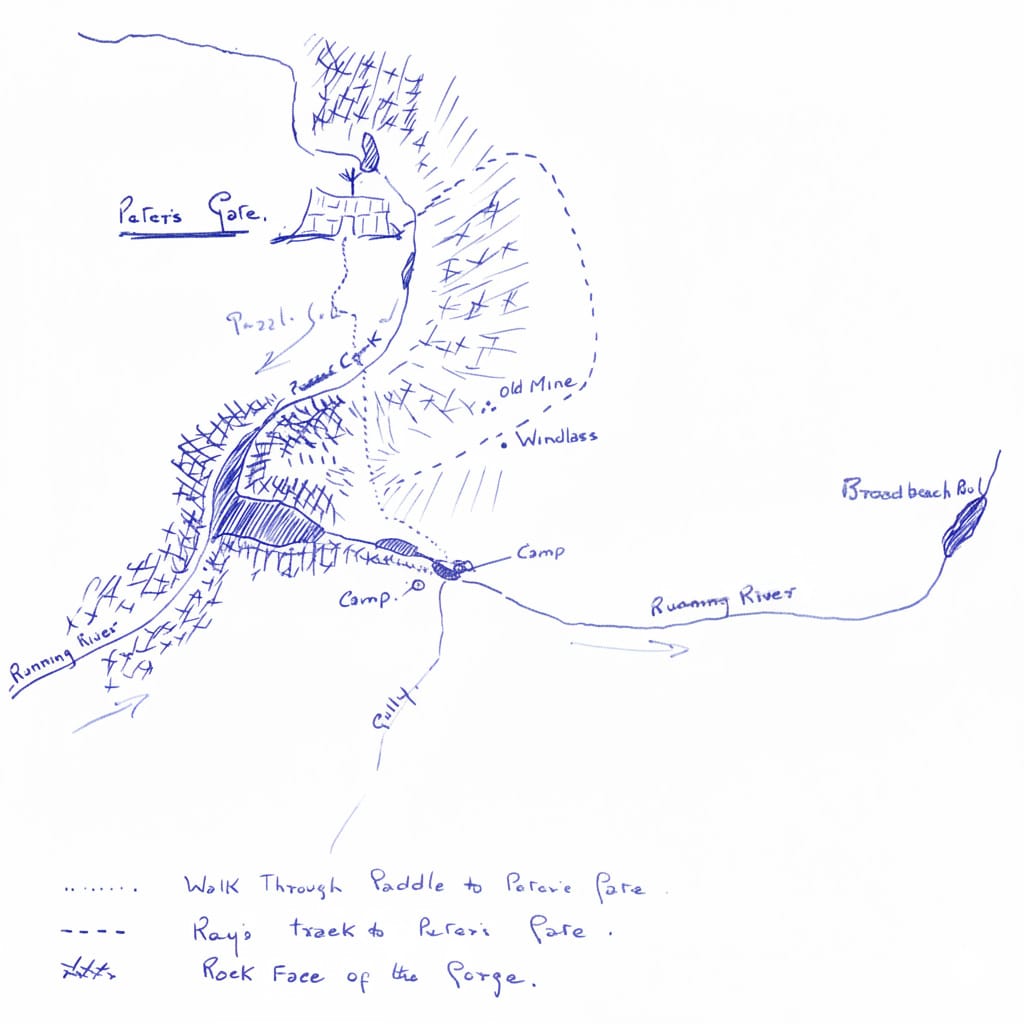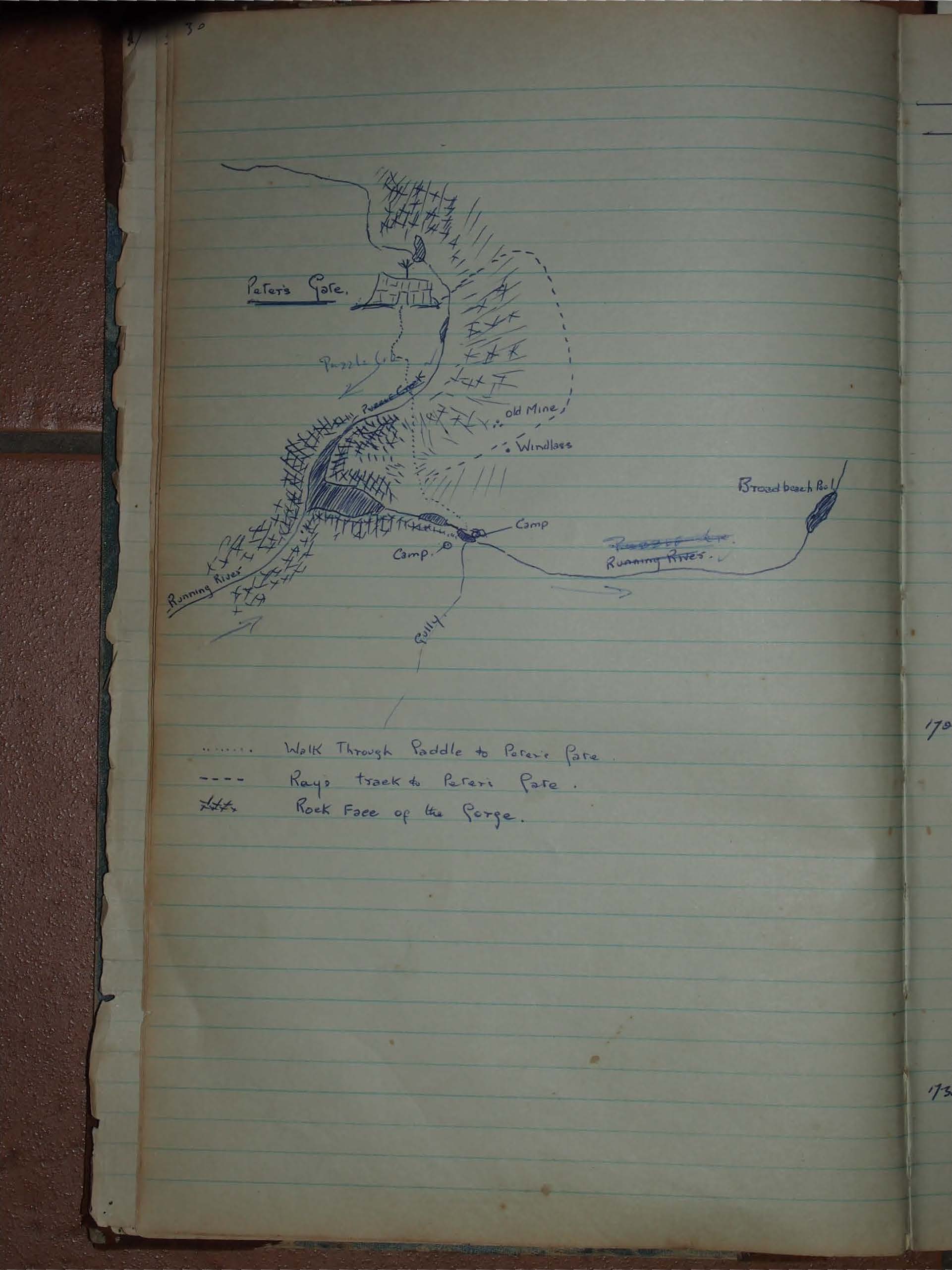 Most of the party after a cuppa went swimming in Junction Pool, depthed by G Hale at 80'. Neill K, Graham M and Paul S. started climbing the rock face of the gorge in Running River just below the junction of the two streams and on the left bank of the River. This was not an extremely difficult climb but was rather dangerous due to the crumbly nature of the rock. Neill led the climb and four belays were taken. At one point very near the top, hill had to retrace his steps as hand holds had disappeared. This climb was taken very cautiously as a fall could easily have been fatal - belays were difficult and several times each member, in looking for a hand hold, dislodged seemingly secure rock.