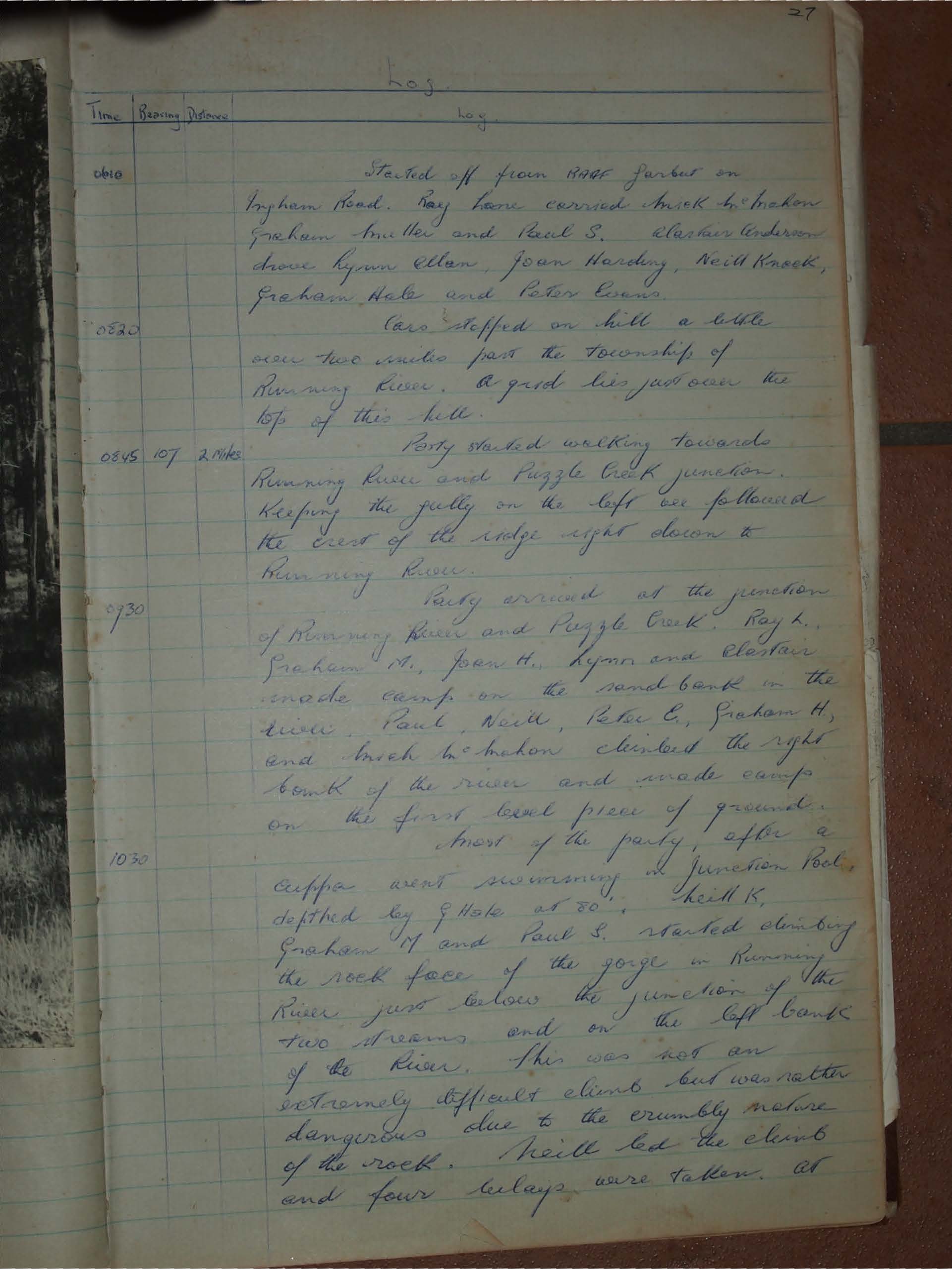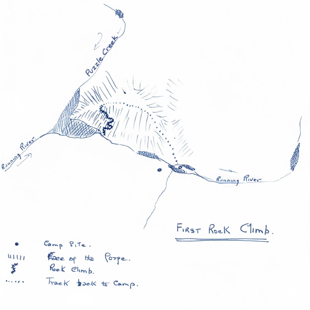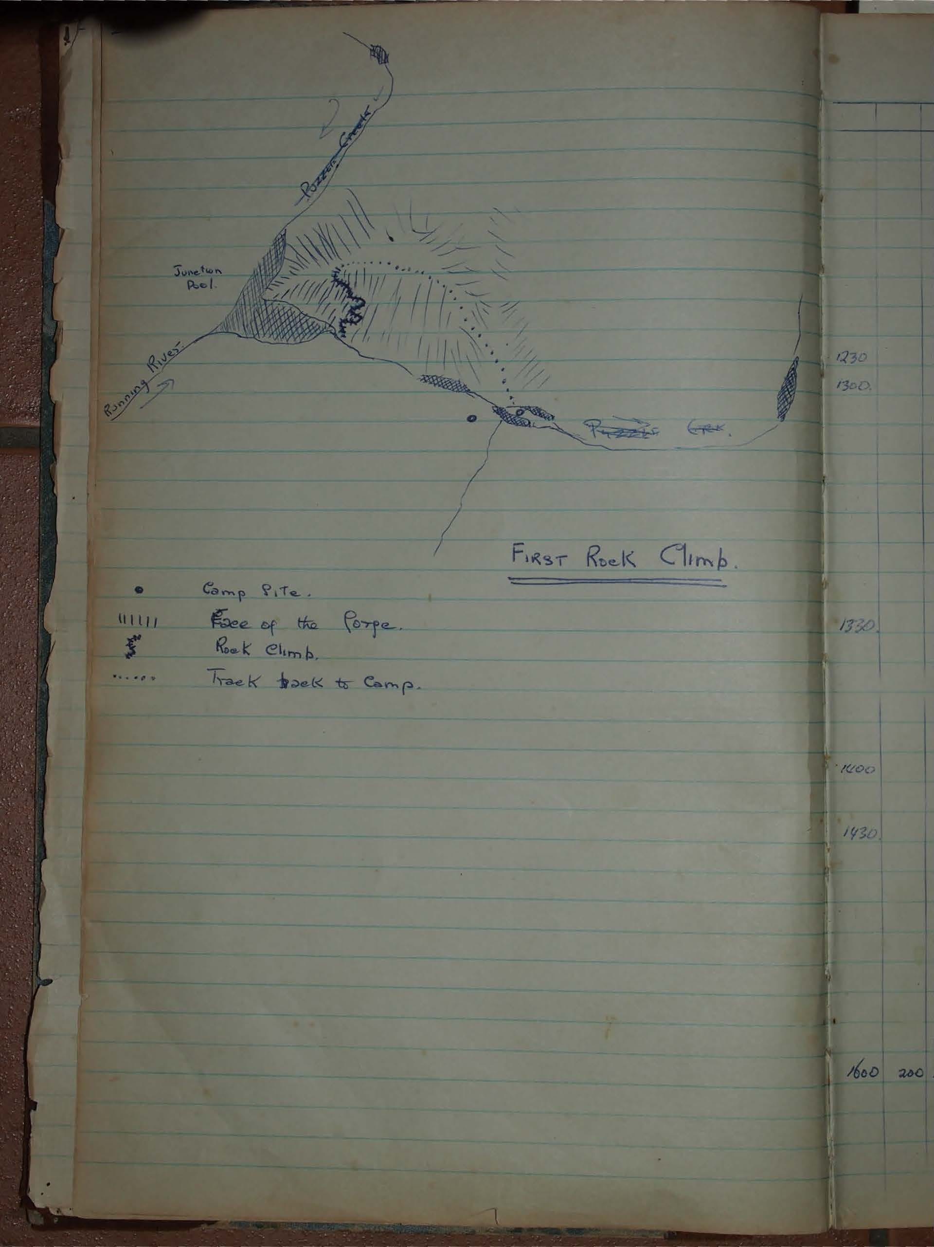 Party arrived at the junction of Running River and Puzzle Creek. Ray L, Graham M, Joan H, Lynn and Alastair made camp on the sand bank in the river. Paul, Neill, Peter E, Graham H, and Mick McMahon climbed the right bank of the river and made camp on the first level piece of ground.