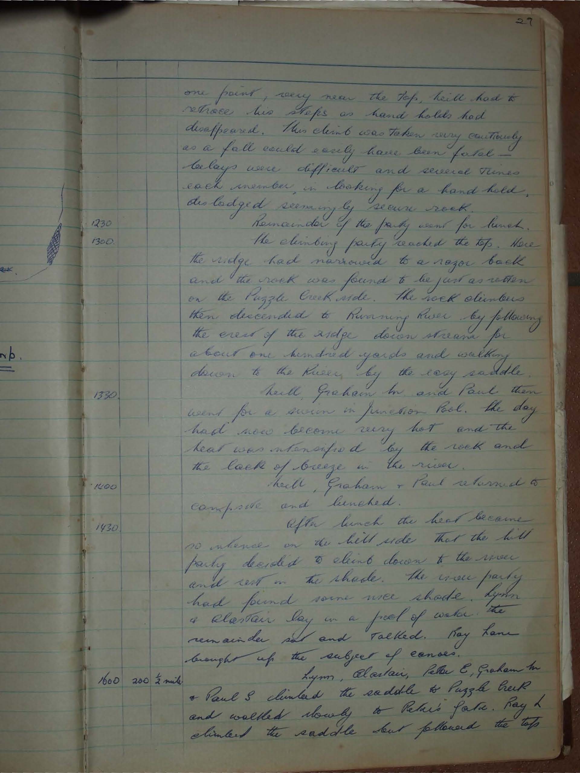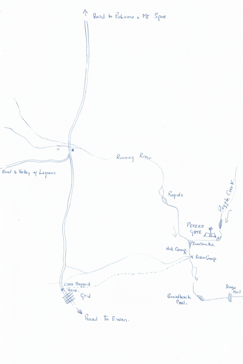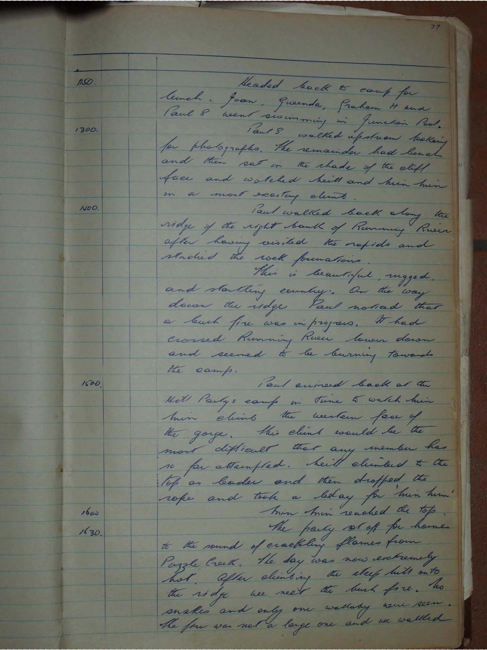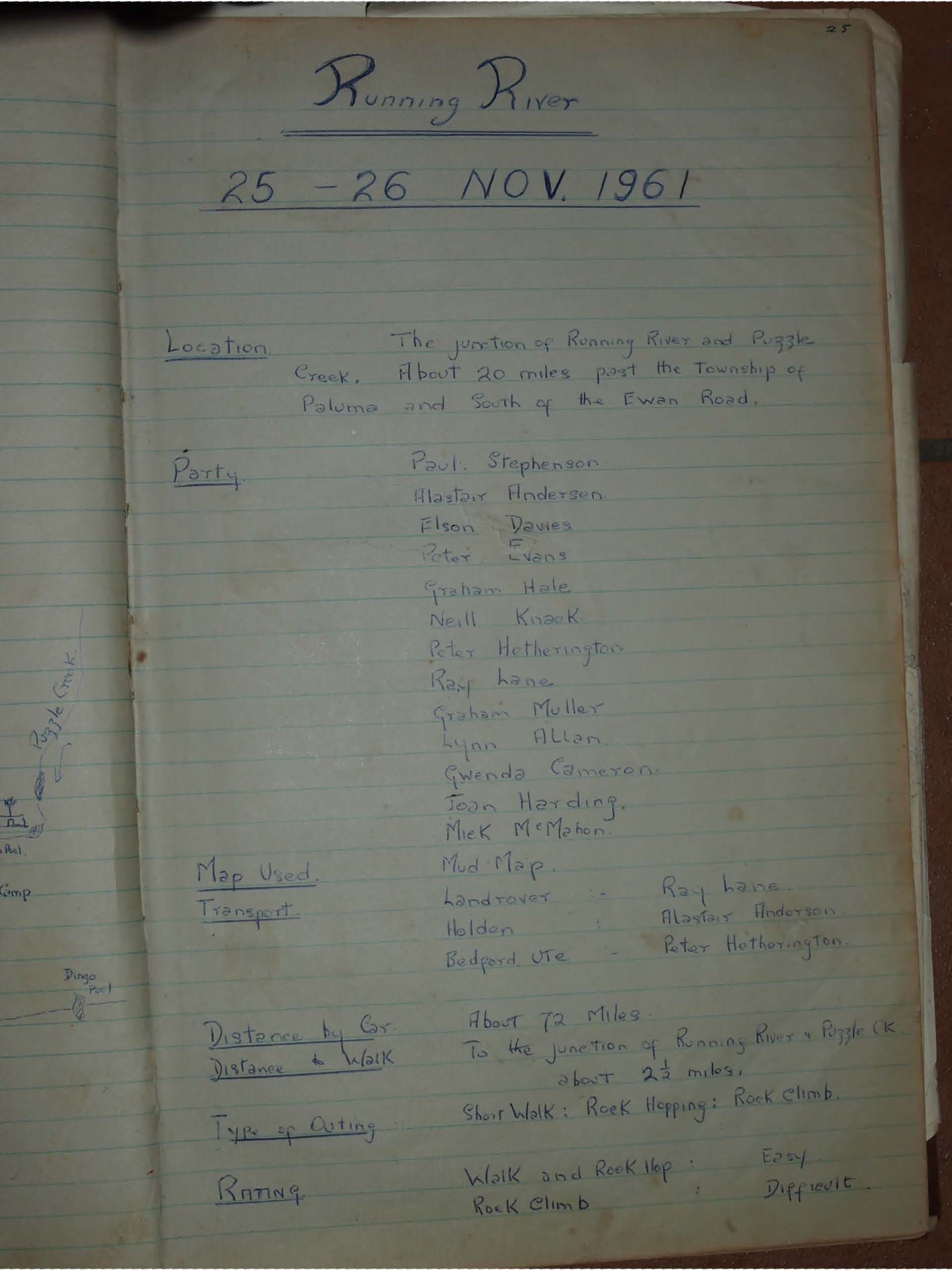 Party arrived at the junction of Running River and Puzzle Creek. Ray L, Graham M, Joan H, Lynn and Alastair made camp on the sand bank in the river. Paul, Neill, Peter E, Graham H, and Mick McMahon climbed the right bank of the river and made camp on the first level piece of ground.