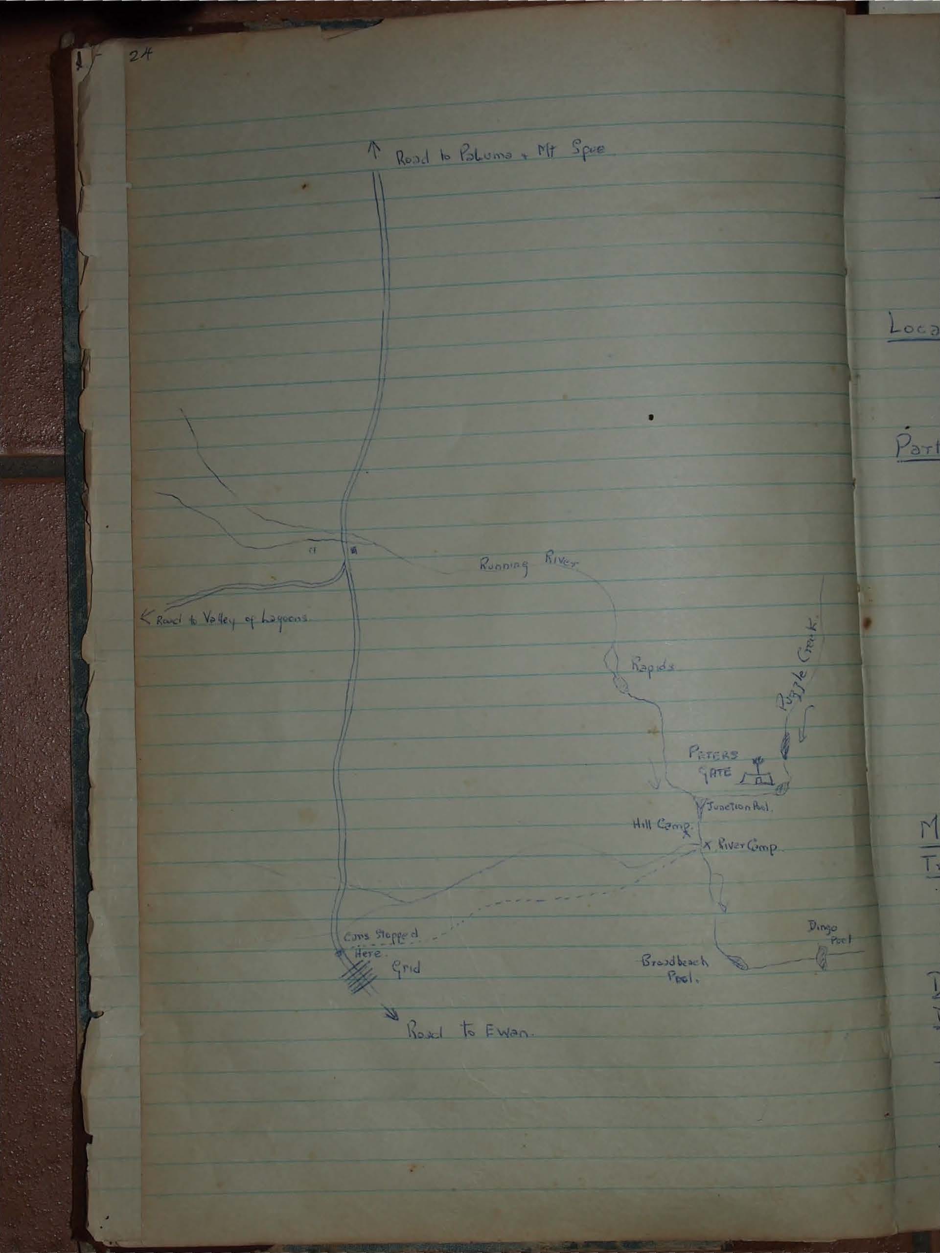 Paul walked back along the ridge of the right bank of Running River after having visited the rapids and studied the rock formations. This is beautiful, rugged, and startling country. On the way down the ridge Paul noticed that a bush fire was in progress. It had crossed Running River lower down and seemed to be burning towards the camp.