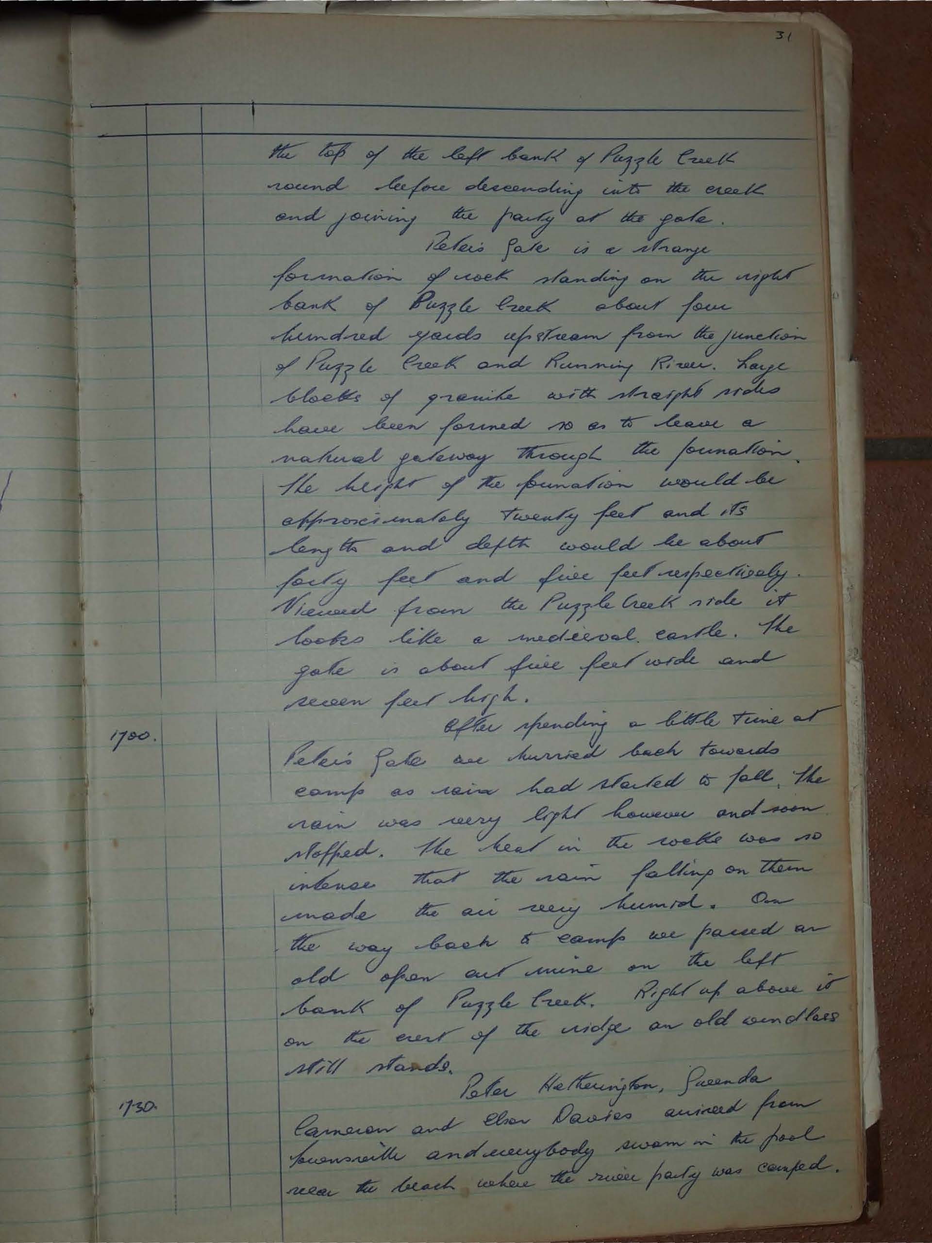 Lynn, Alastair, Peter E, Graham & Paul S climbed the saddle to Puzzle Creek and walked slowly to Pete's fate. Ray L climbed the saddle but followed the top of the left bank of Puzzle Creek around before descending into the creek and joining the party at the gate. Peter's Gate is a strange formation of rock standing on the right bank of Puzzle Creek about four hundred yards upstream from the junction of Puzzle Creek and Running River. Large blocks of granite with straight sides have been formed so as to leave a natural gateway through the formation. The height of the formation would be approximately twenty feet and its length and depth would be about forty feet and five feet respectively. Viewed from the Puzzle Creek side it looks like a medieval castle. The gate is about five feet wide and seven feet high.