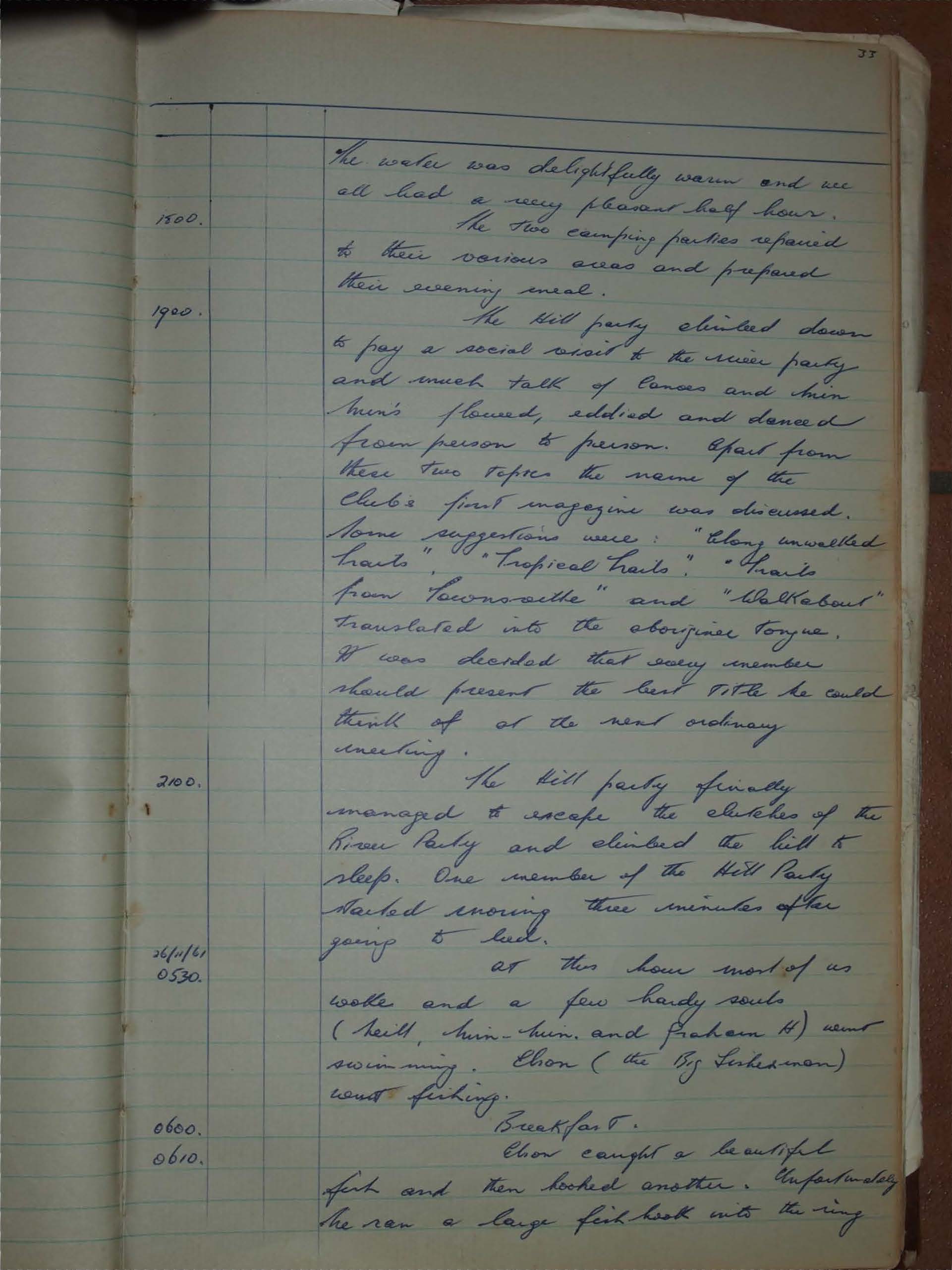 The hill party climbed down to pay a social visit to the river party and much talk of canoes and thin shin's flowed, eddied and danced from person to person. Apart from these two topics the name of the Club's first magazine was discussed. Some suggestions were: "Along unwalled trails", "Tropical Trails", "Trails from Townsville" and "Walkabout" translated into the aborigine tongue. It was decided that every member should present the best title he could think of at the next ordinary meeting.