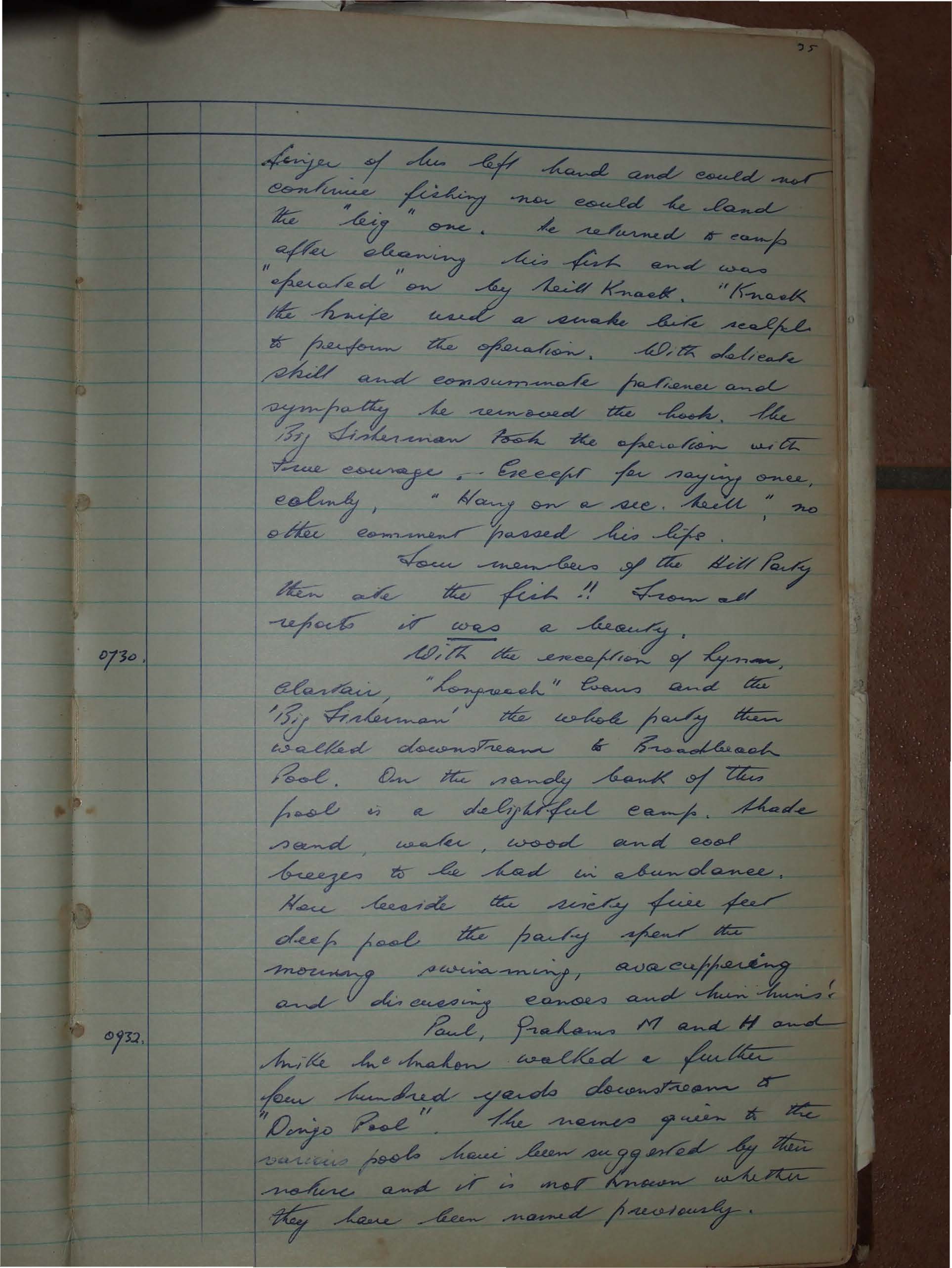 Elson caught a beautiful fish and then hooked another. Unfortunately he ran a large fish hook into his ring finger of his left hand and could not continue fishing nor could he land the "big" one. he returned to camp after cleaning his fish and was operated "on" by Will Knack. "Knack" the knife used a snake bite scalpel to perform the operation. With delicate Skill and consummate patience and sympathy he removed the hook. The Fisherman took the operation with True courage. Except for saying once, calmly, "Hang on a sec. Will," no other comment passed his lips. Four members of the Hill Party then ate the fish!! From all reports it was a beauty.