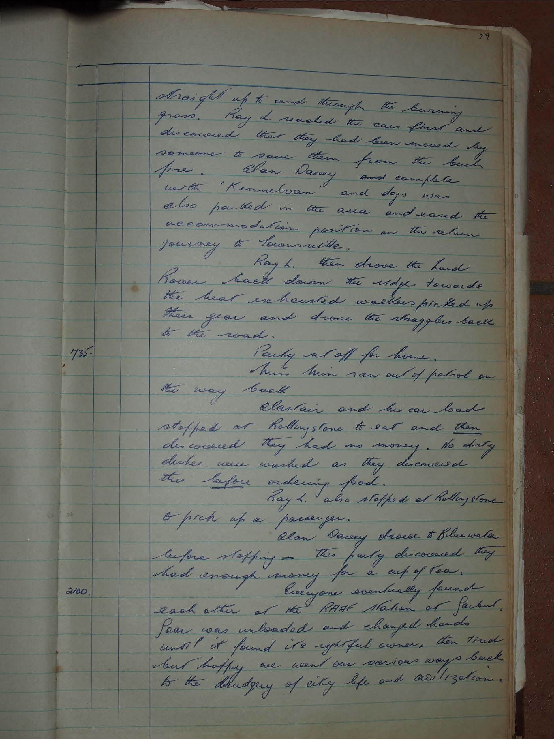 The party set off for home to the sound of crackling flames from Puzzle Creek. The day was now extremely hot. After climbing the steep hills onto the ridge we met the bush fire. No snakes and only one wallaby were seen. The fire was not a large one and we walked straight up to and through the burning grass. Ray L reached the cars first and discovered that they had been moved by someone to save them from the bush fire. Alan Davey and complete with 'Kennelvan' and dogs was also parked in the area and joined the accommodation position on the return journey to Townsville.