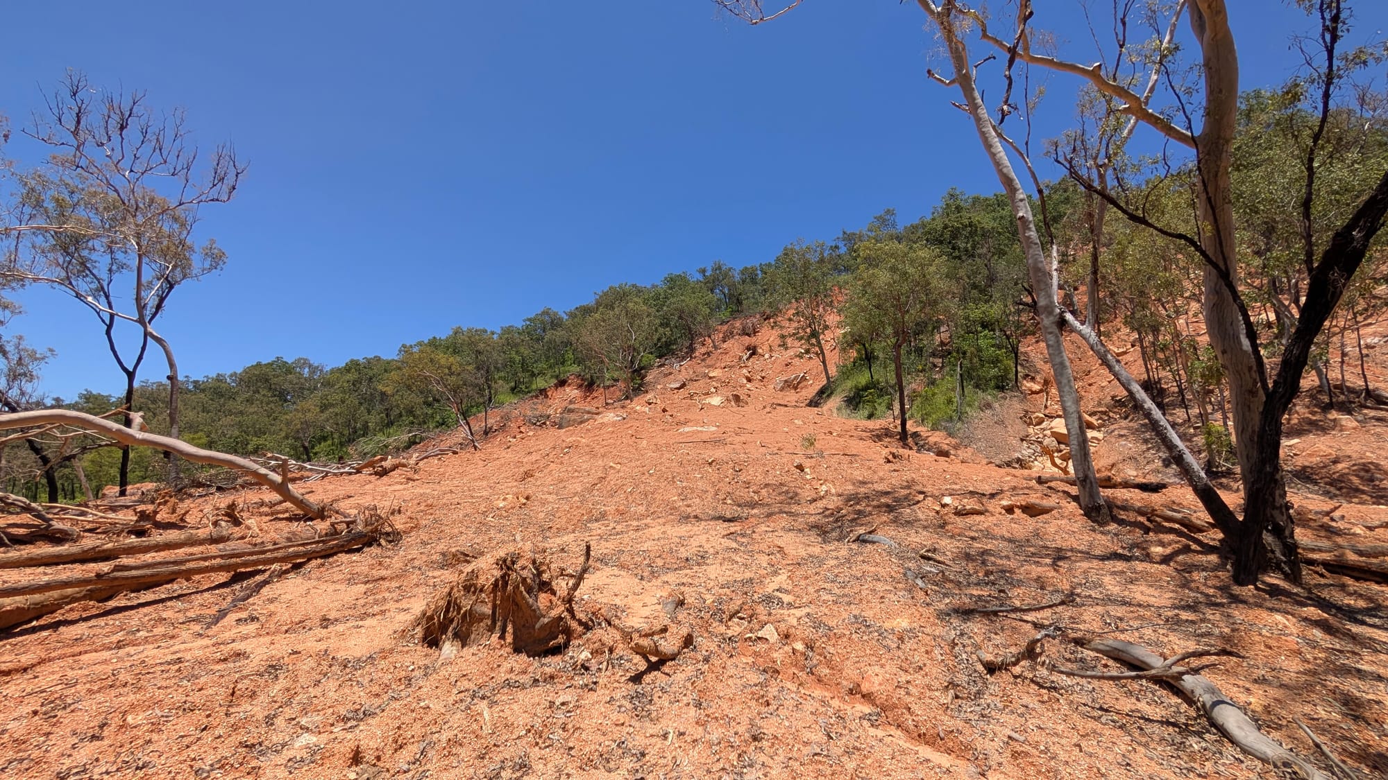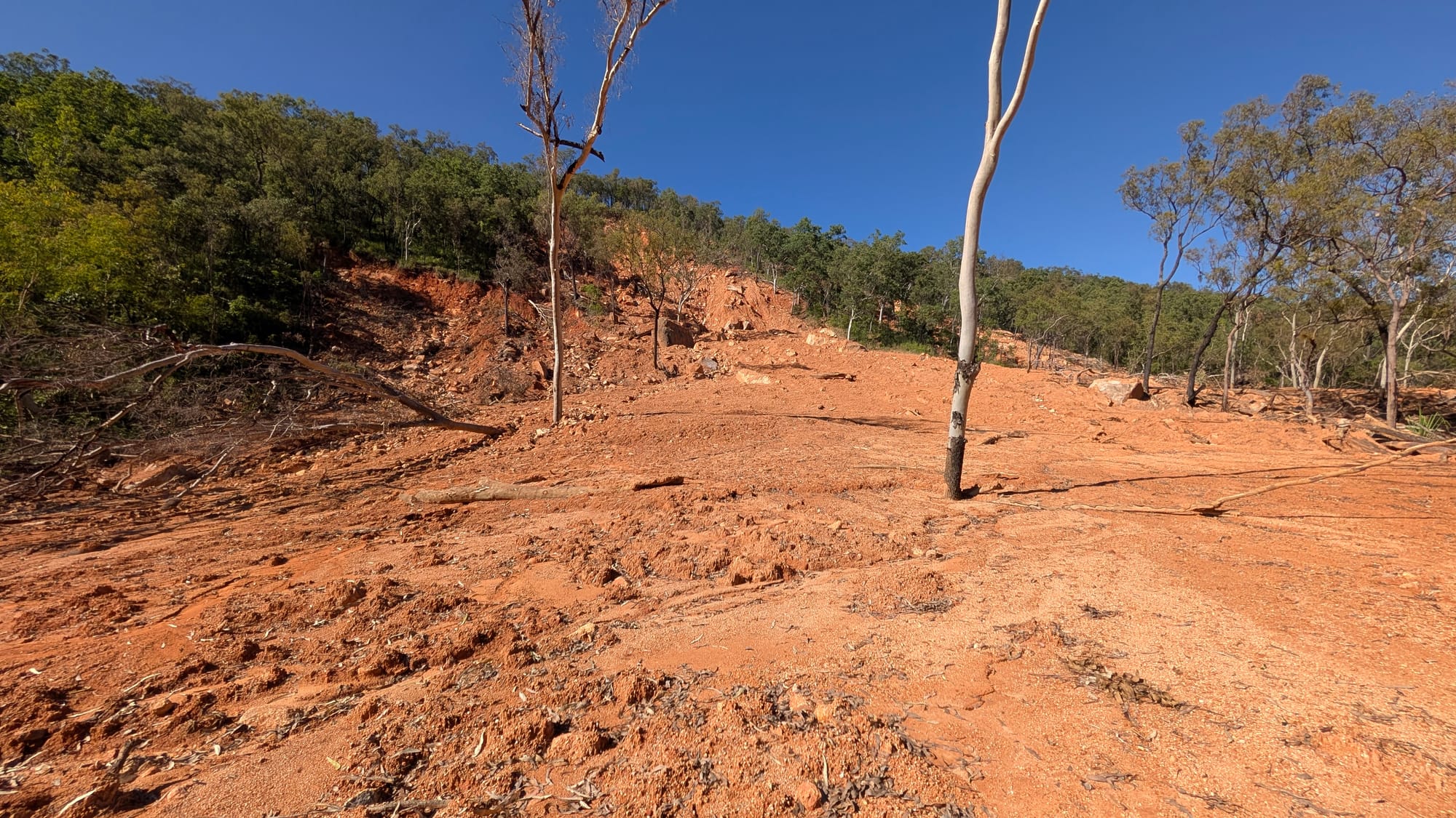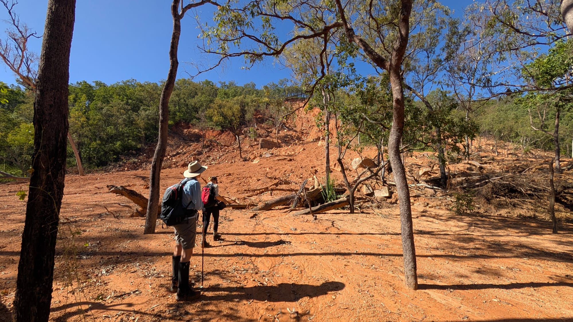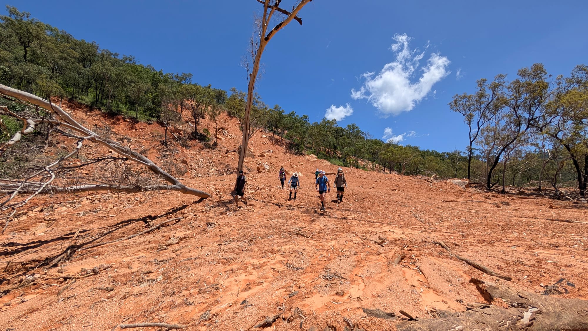 Before long, the landscape changed dramatically. Freshly shifted red dirt appeared underfoot, and it was obvious the recent rains and flooding had done some serious damage. We followed the disturbed soil for a few hundred metres until the source of it revealed itself - a huge, raw landslip carved into the hillside. It was an impressive sight, still looking very fresh, and we spent a while taking photos, exploring the site, and appreciating its scale.