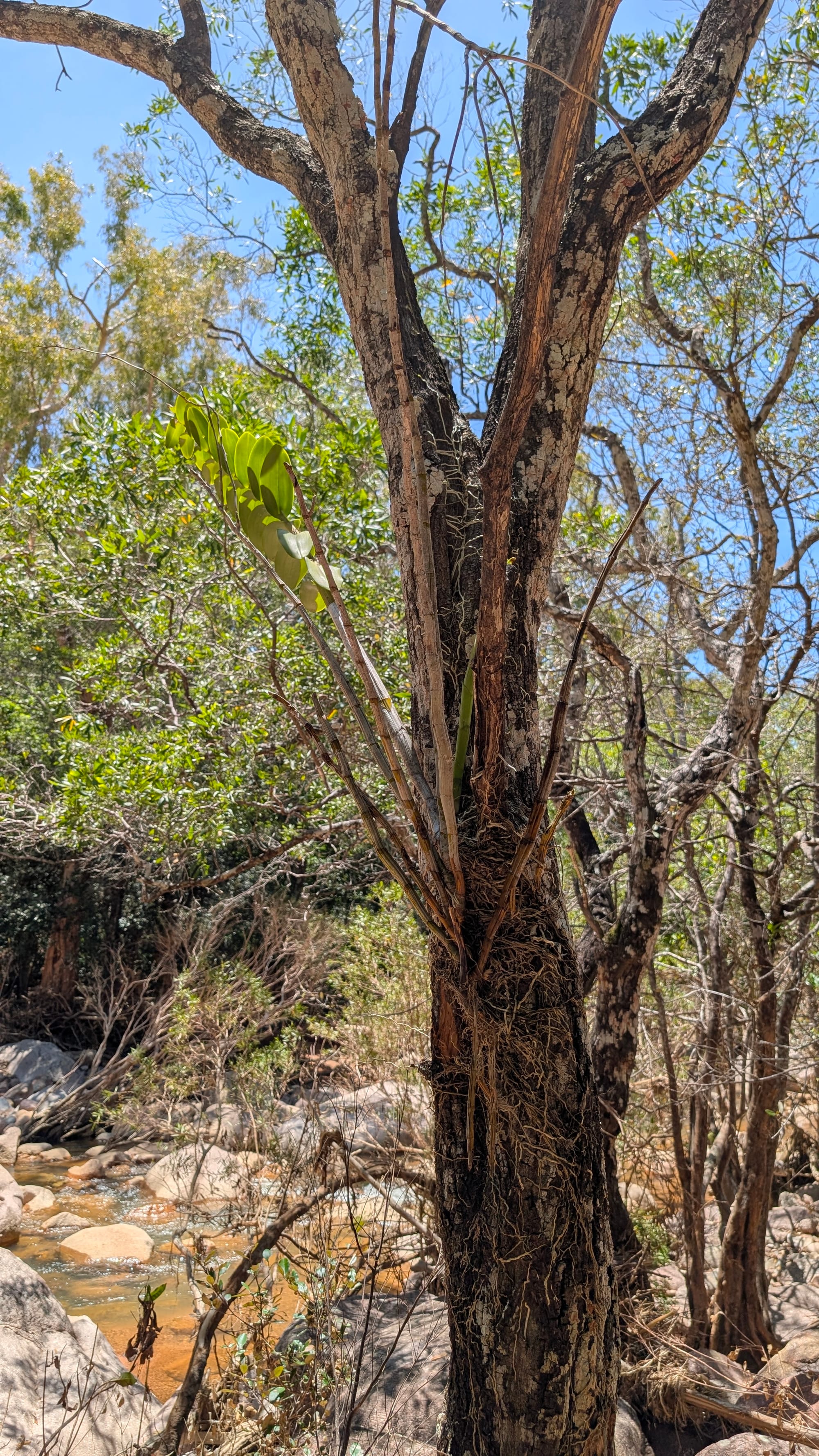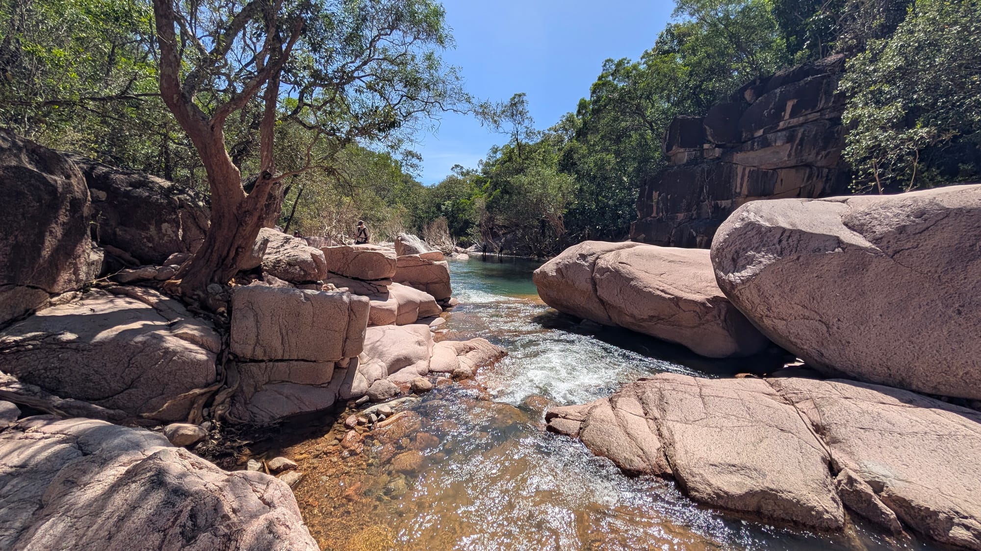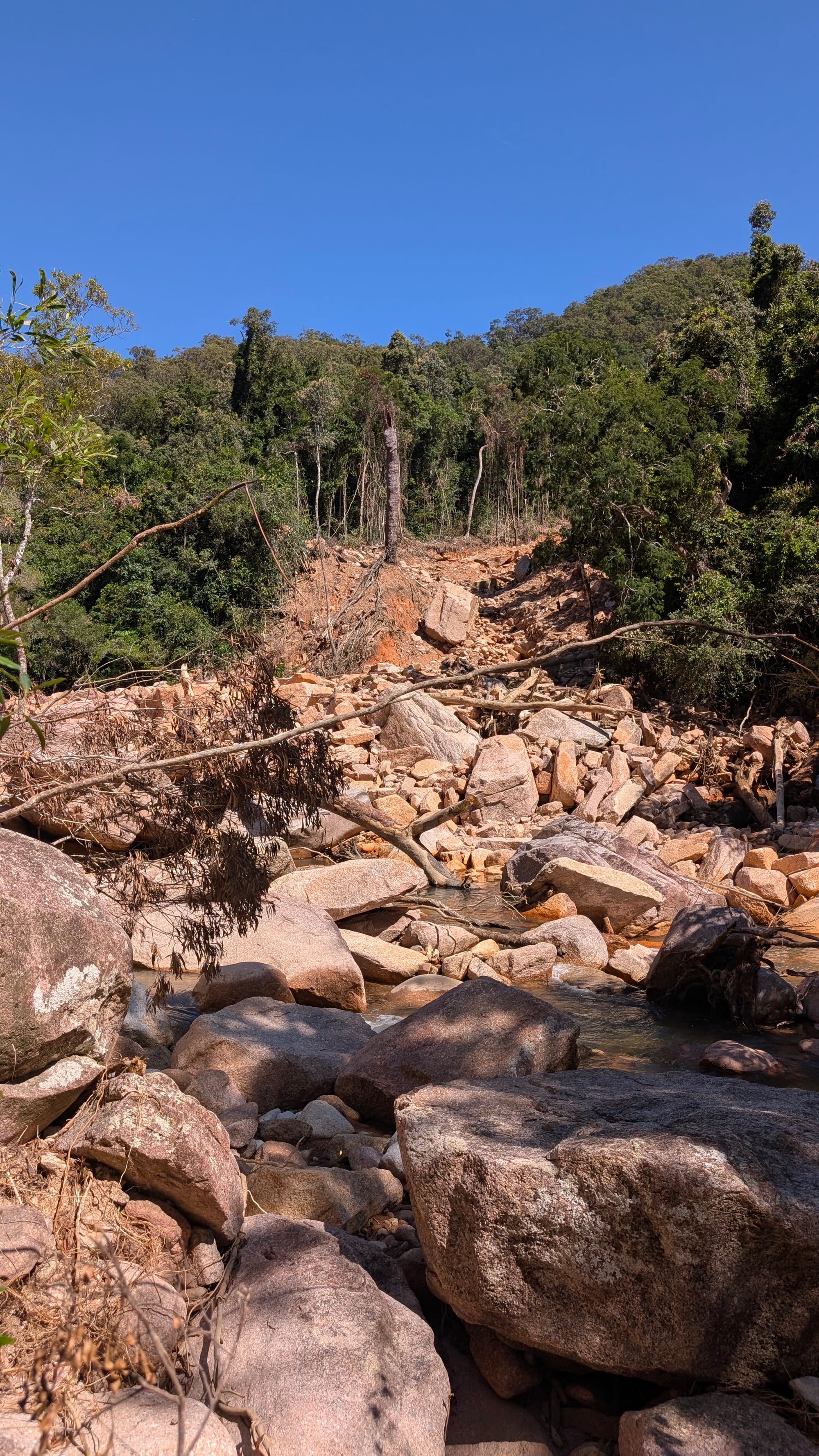 Beyond the landslip, the mountain pressed us closer into the creek, and the walking became more technical. We started rock hopping up the left-hand side of the creek, climbing over boulders, roots, and uneven ground. It was only about 700 m to the gorge from there, but the terrain slowed us down. Just before the gorge, a second, smaller landslip appeared on the right-hand side upstream - another reminder of how much the area had changed after the big wet season.