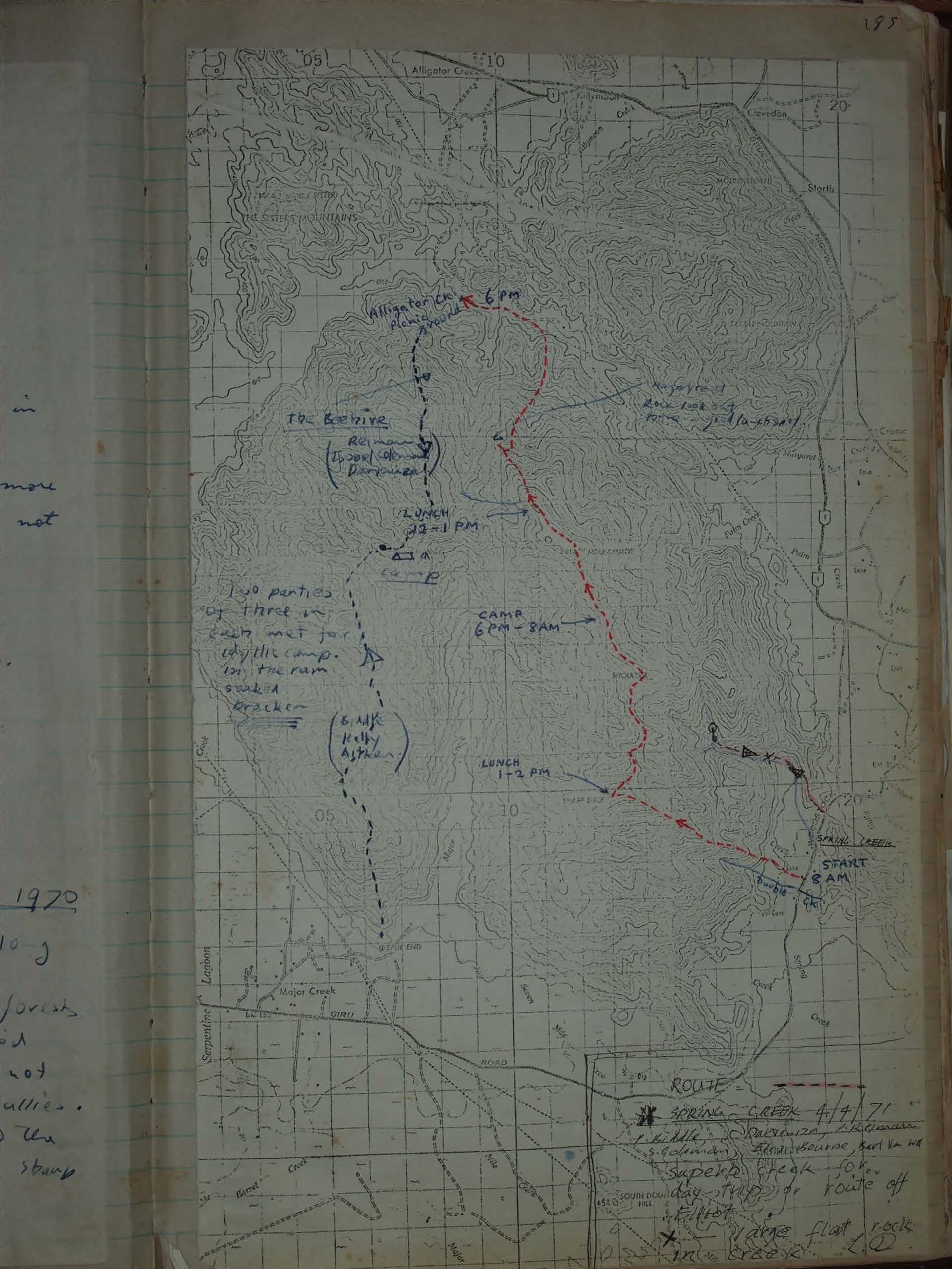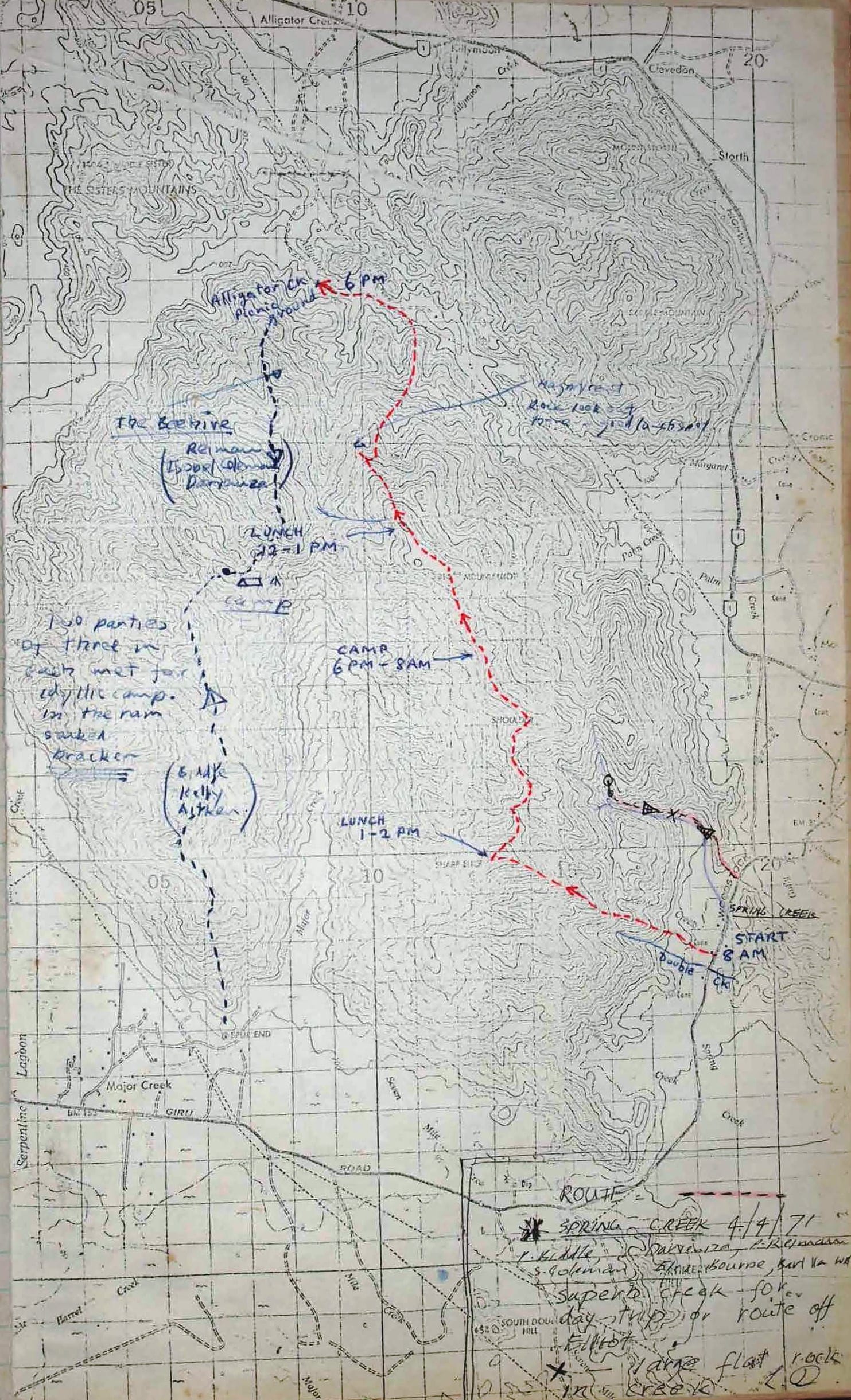 Sharp crests are usually thickly covered in scunge. Easiest progress is on the NE side of the crest. The NW side has more vines & undergrowth. A machete is not necessary but a compass is.