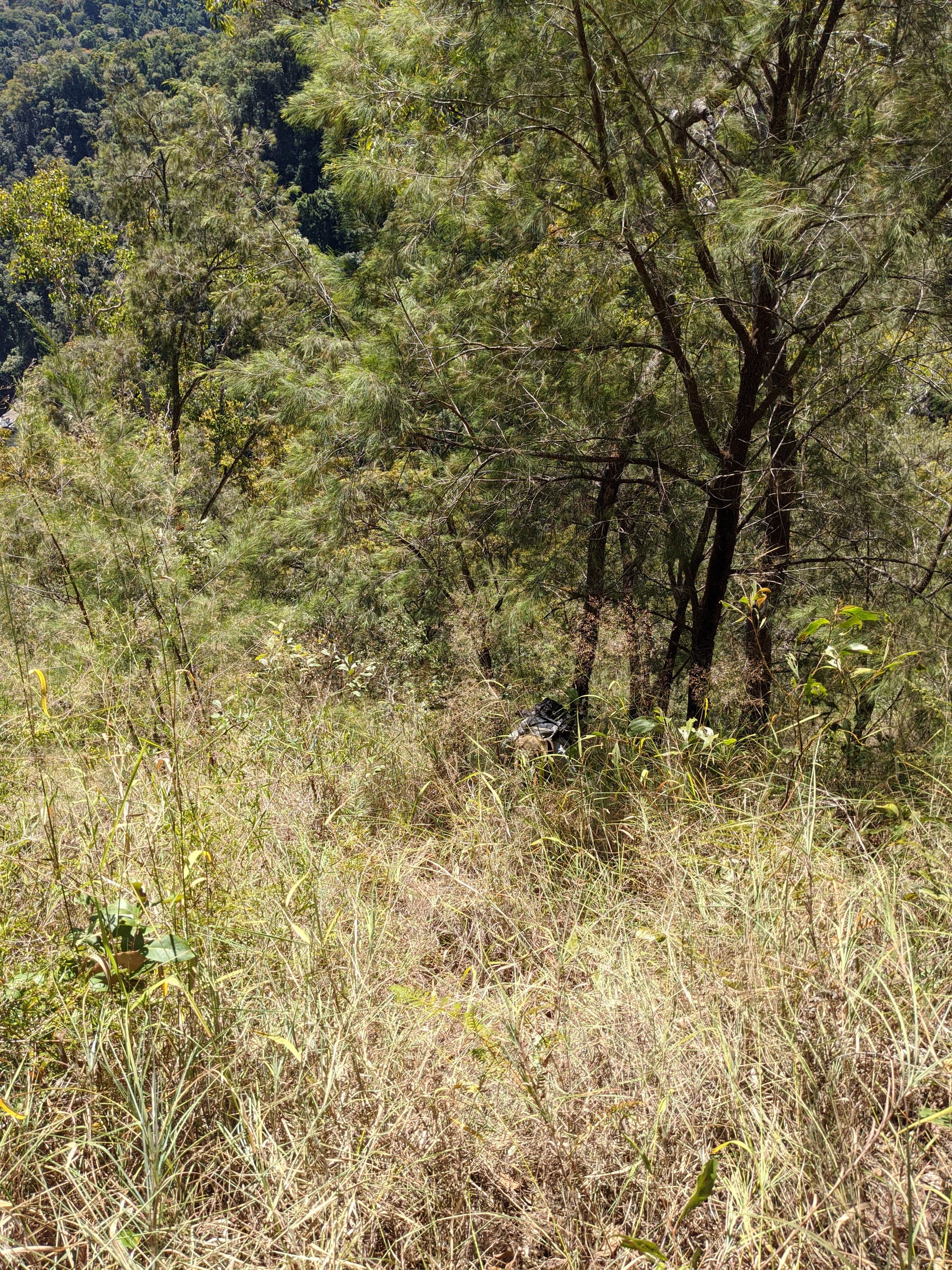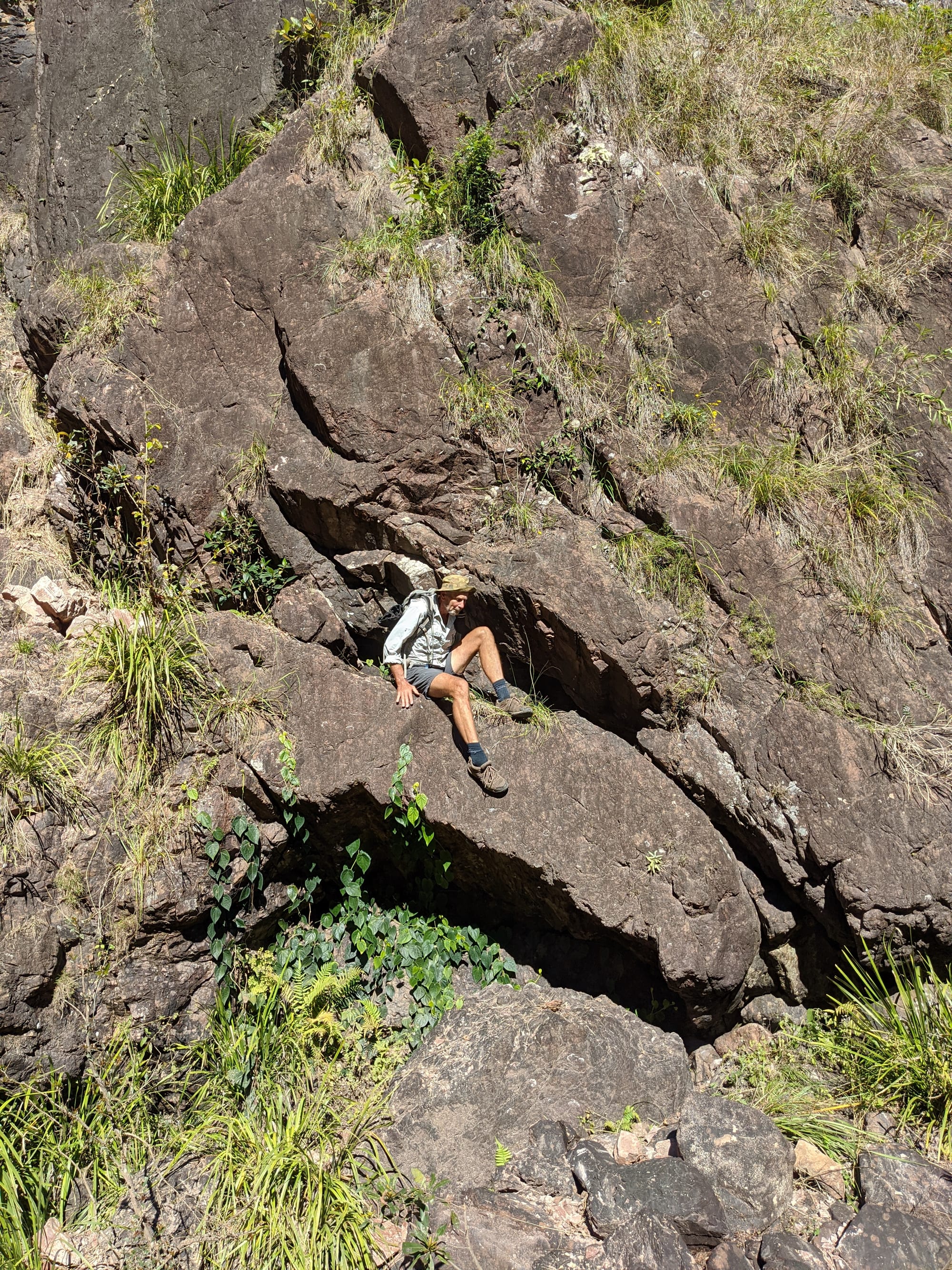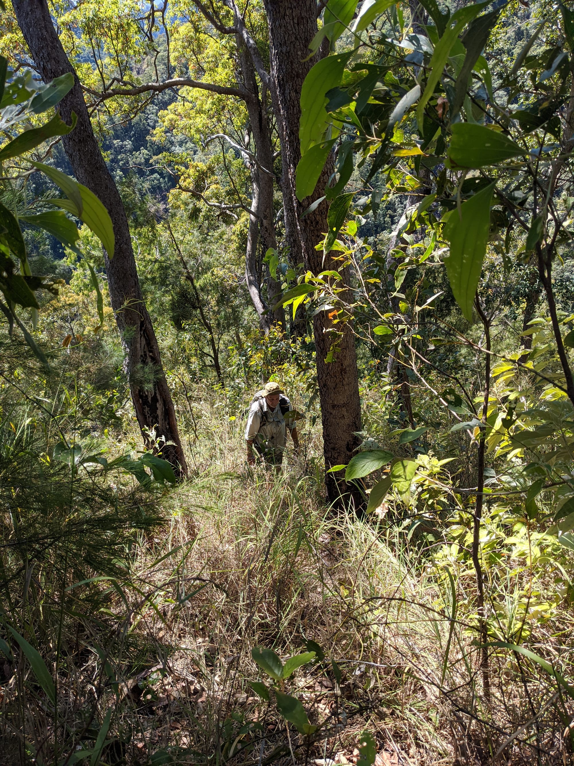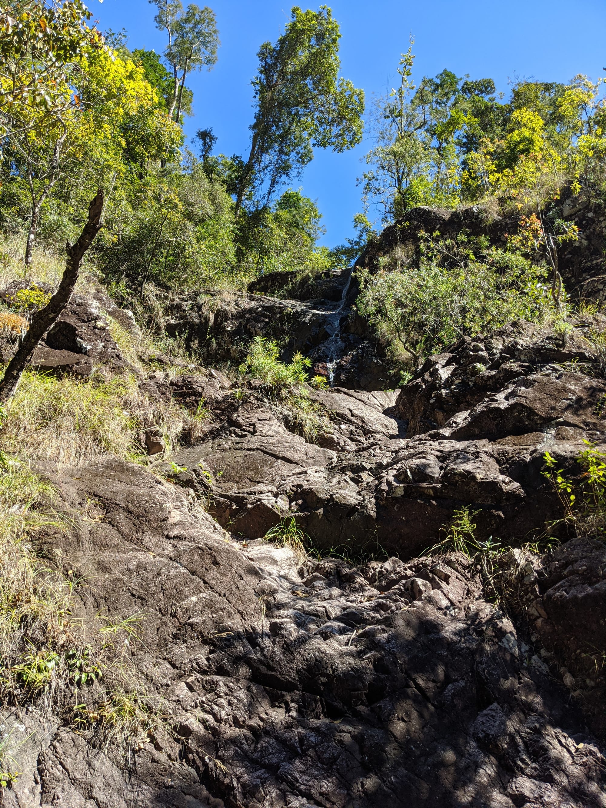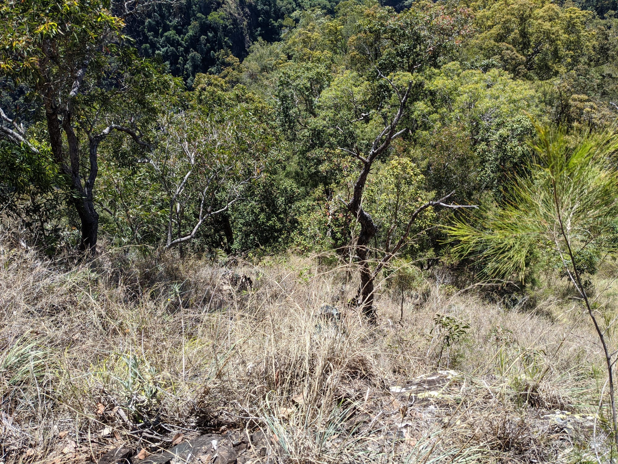 After our brief swim, we decided it was time to test our luck on the escape plan - a steep spur heading up towards the Wallaman Falls track and lookout. From below, it looked brutally steep, and it did not disappoint. We first had to bash through a patch of lantana and chossy rock before breaking into open grassland. The slope was so sharp in places that we were hauling ourselves upward by grabbing clumps of grass in each hand. It was hard work, with plenty of puffing and a few muttered comments about whose bright idea this had been. At some point along the ridge, we heard the rocks rumble (a possible landslip occurred?), and we found out later that it was an earthquake in Bowen.