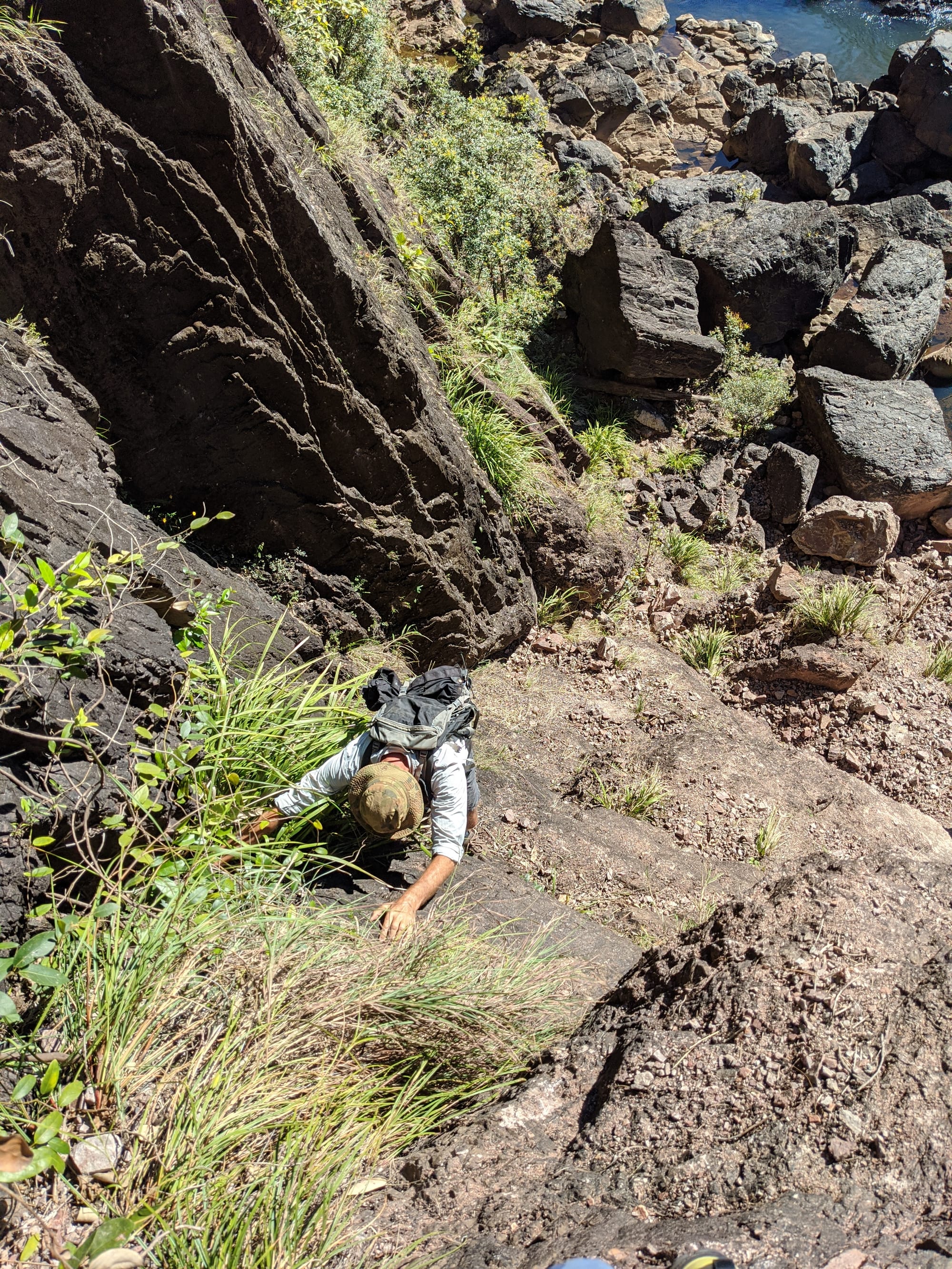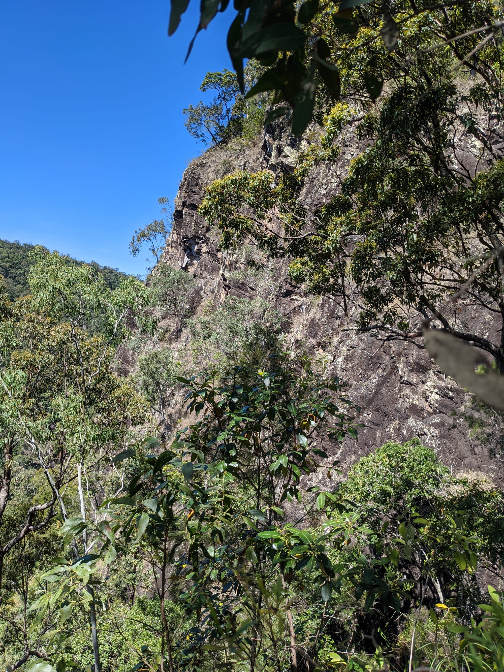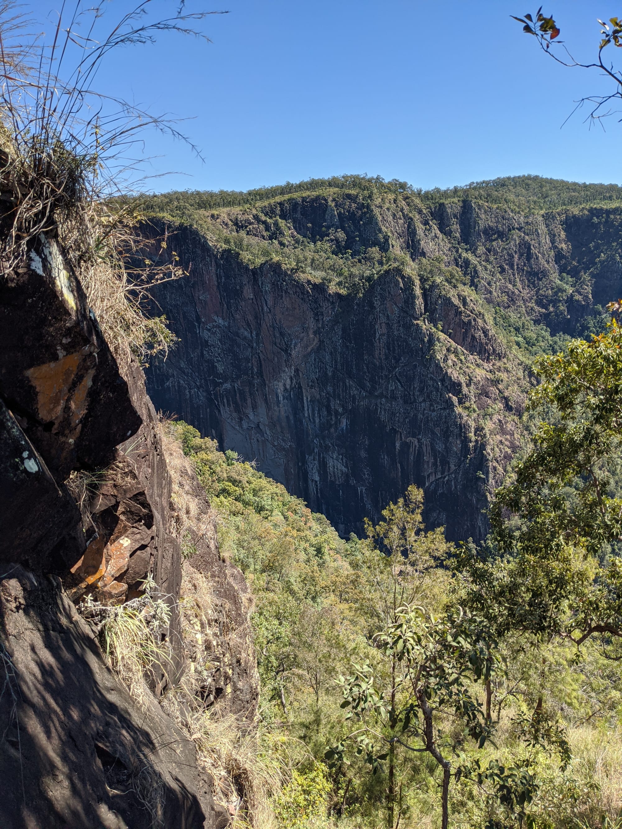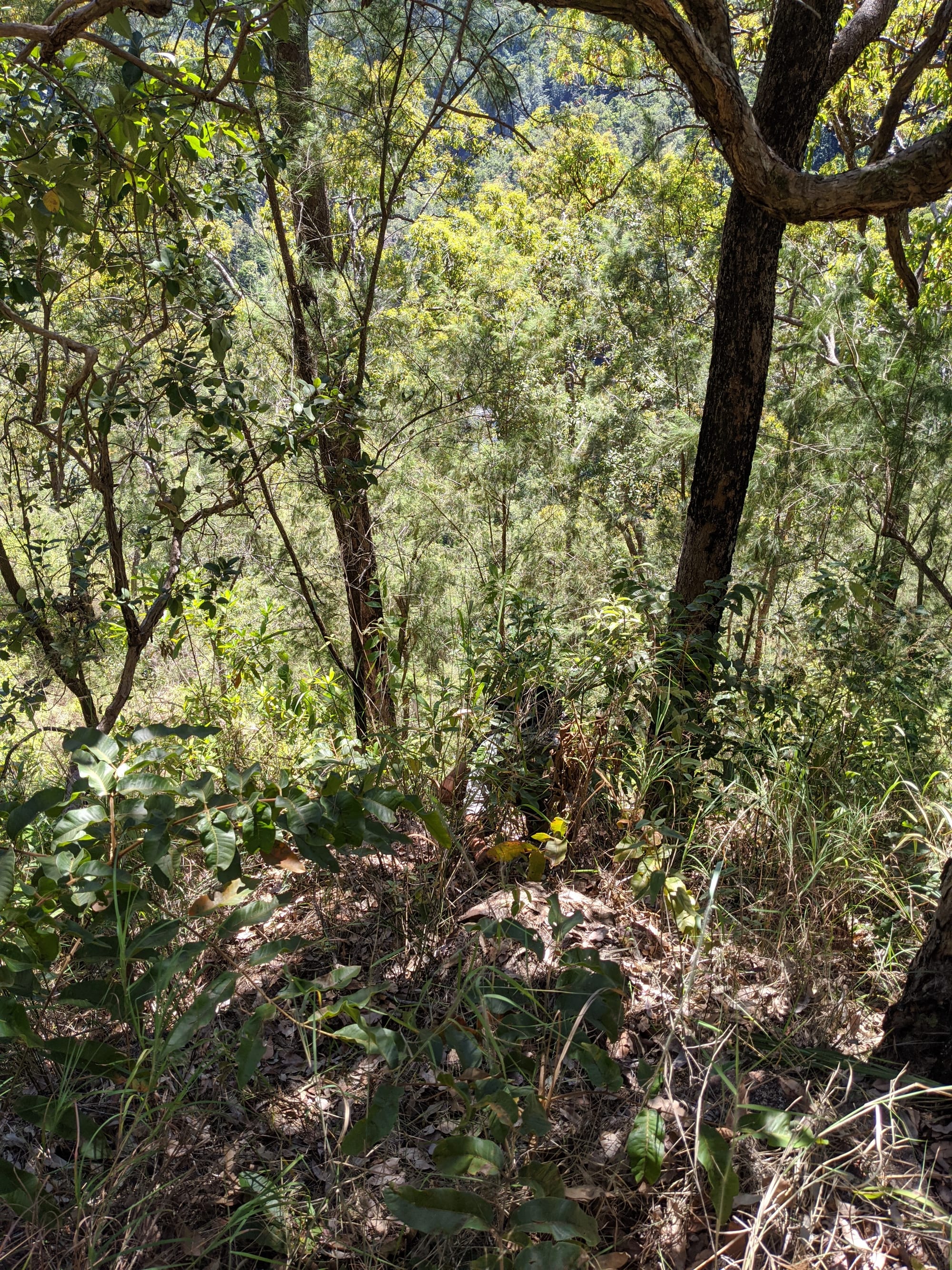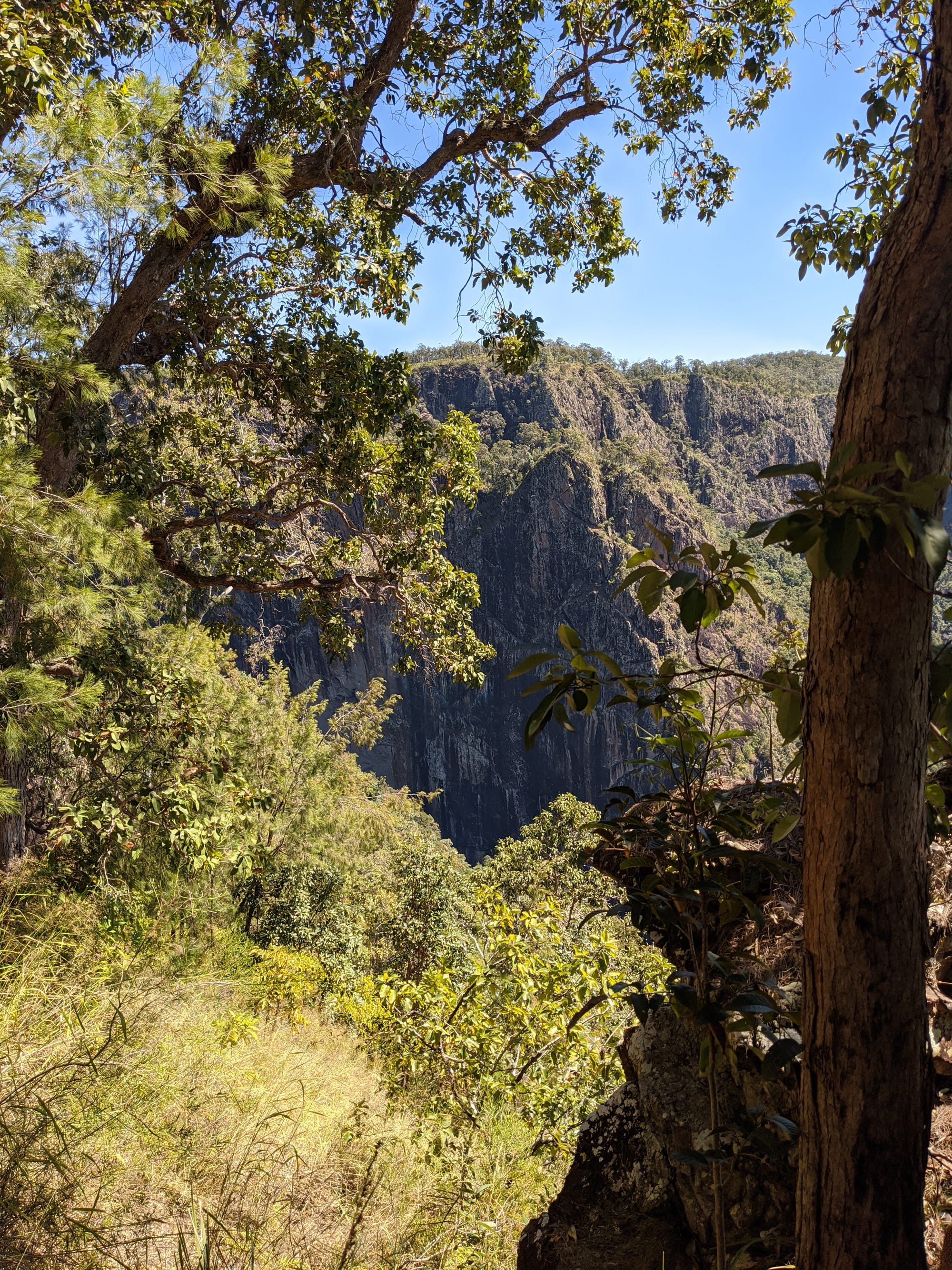 After our brief swim, we decided it was time to test our luck on the escape plan - a steep spur heading up towards the Wallaman Falls track and lookout. From below, it looked brutally steep, and it did not disappoint. We first had to bash through a patch of lantana and chossy rock before breaking into open grassland. The slope was so sharp in places that we were hauling ourselves upward by grabbing clumps of grass in each hand. It was hard work, with plenty of puffing and a few muttered comments about whose bright idea this had been. At some point along the ridge, we heard the rocks rumble (a possible landslip occurred?), and we found out later that it was an earthquake in Bowen.