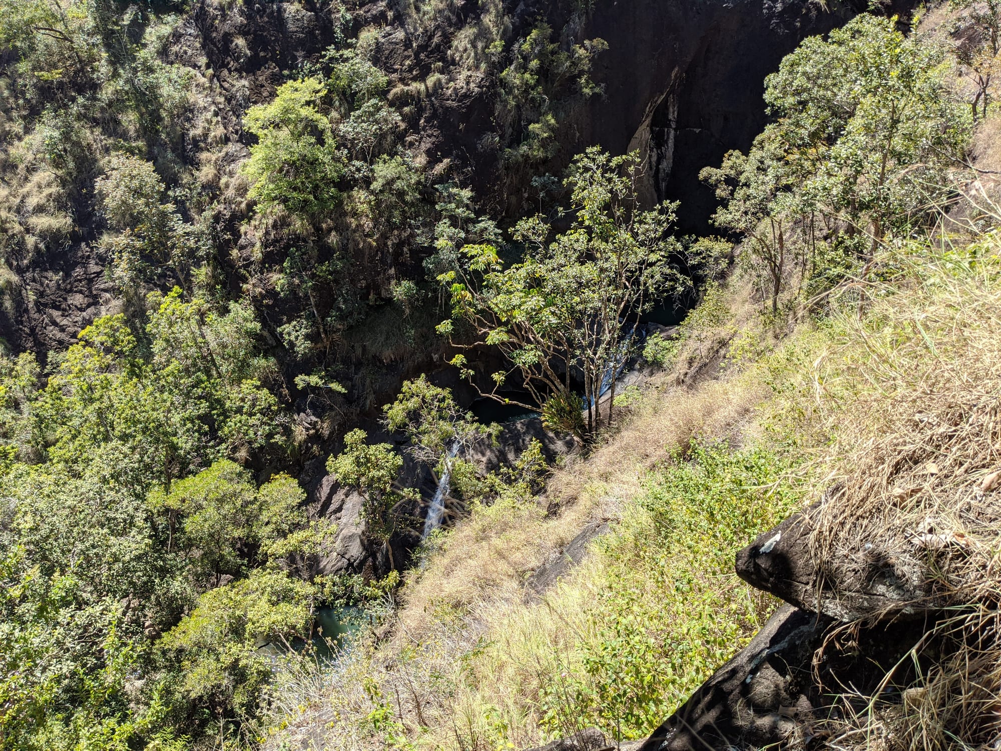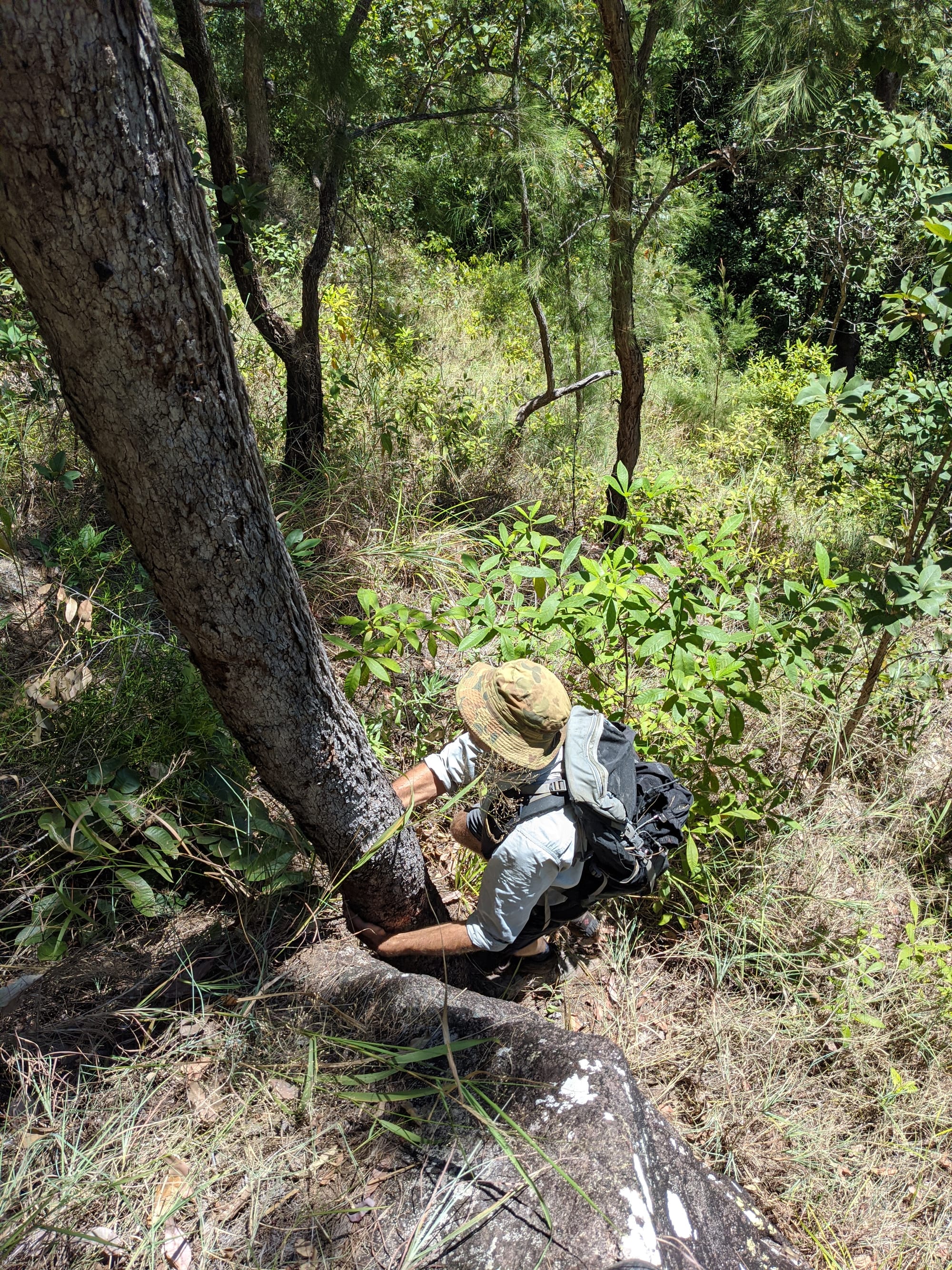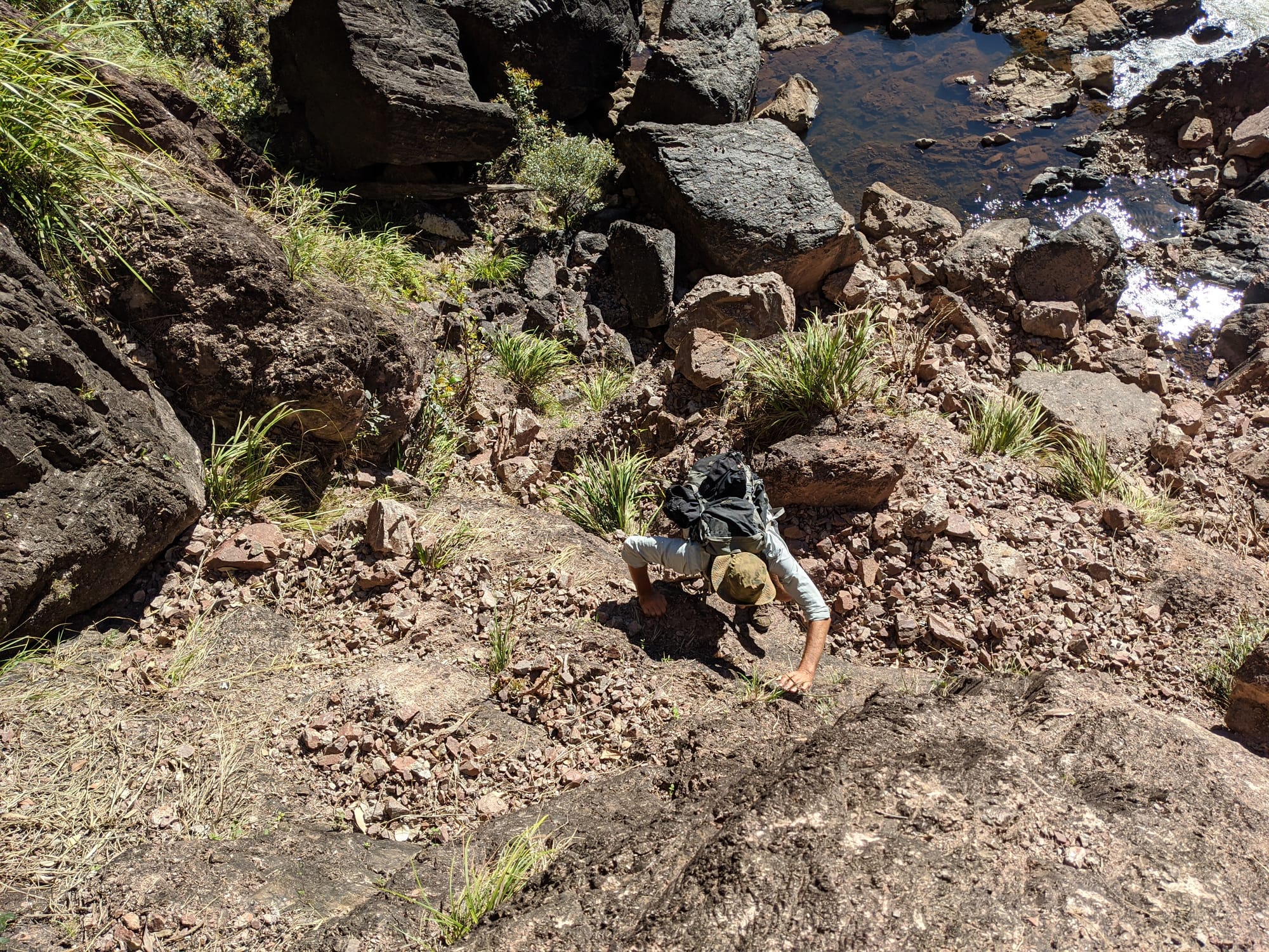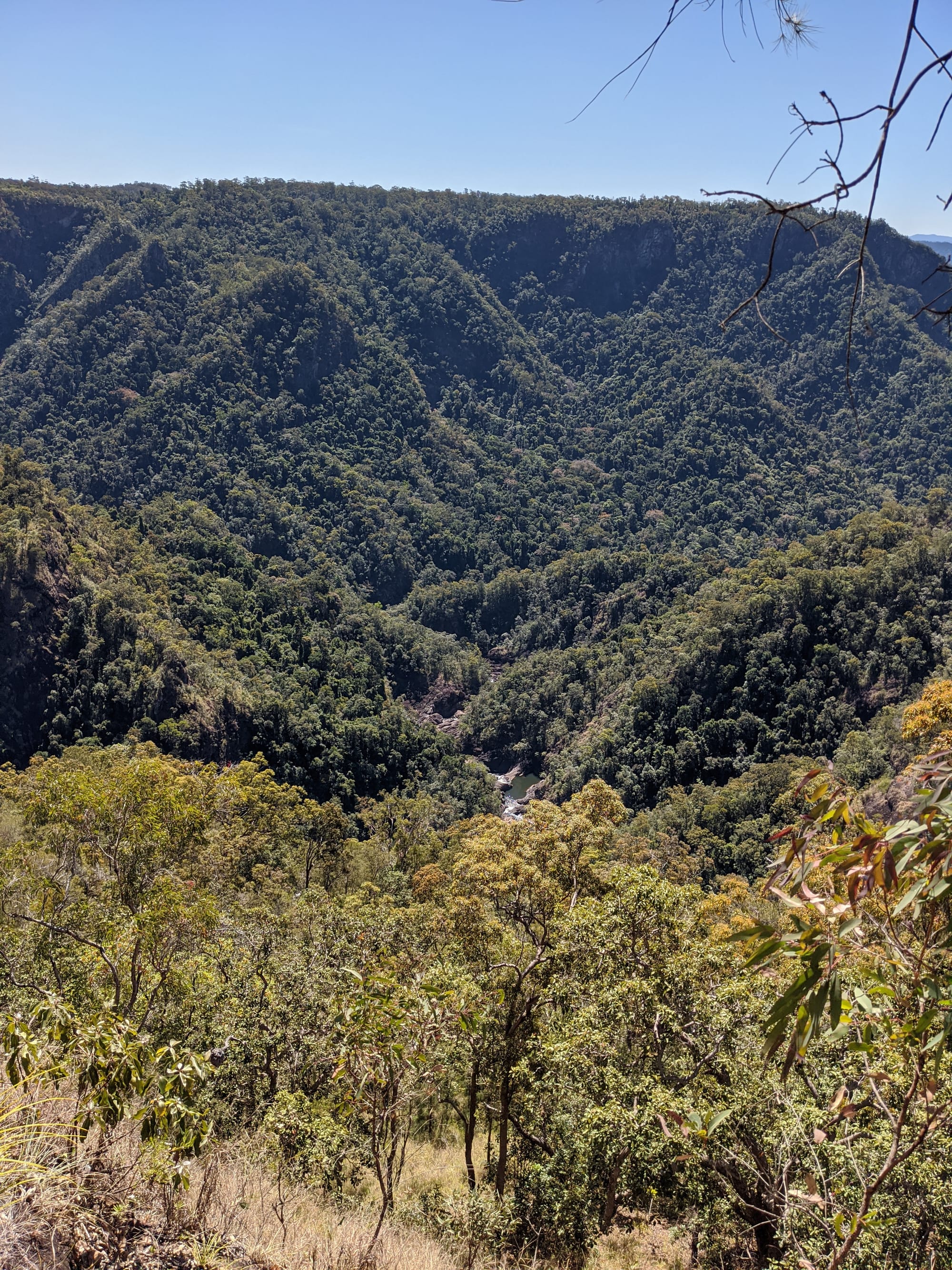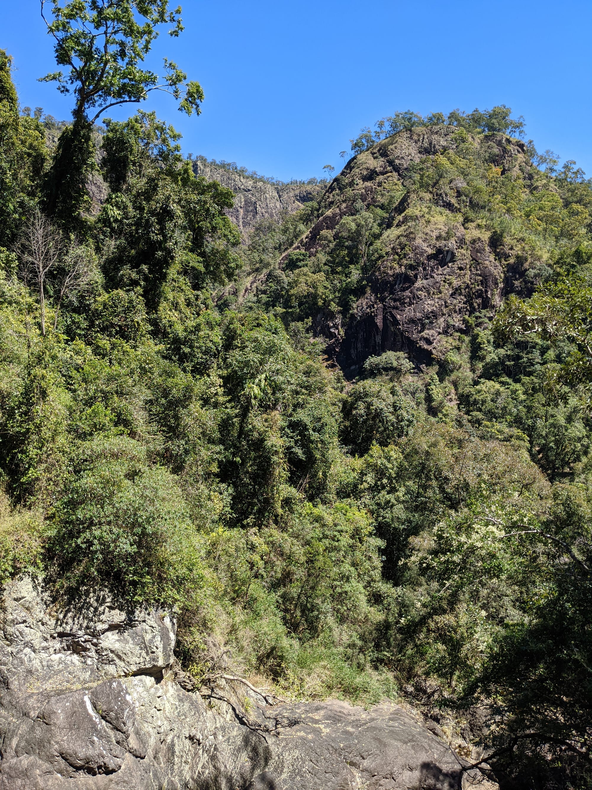 After our brief swim, we decided it was time to test our luck on the escape plan - a steep spur heading up towards the Wallaman Falls track and lookout. From below, it looked brutally steep, and it did not disappoint. We first had to bash through a patch of lantana and chossy rock before breaking into open grassland. The slope was so sharp in places that we were hauling ourselves upward by grabbing clumps of grass in each hand. It was hard work, with plenty of puffing and a few muttered comments about whose bright idea this had been. At some point along the ridge, we heard the rocks rumble (a possible landslip occurred?), and we found out later that it was an earthquake in Bowen.