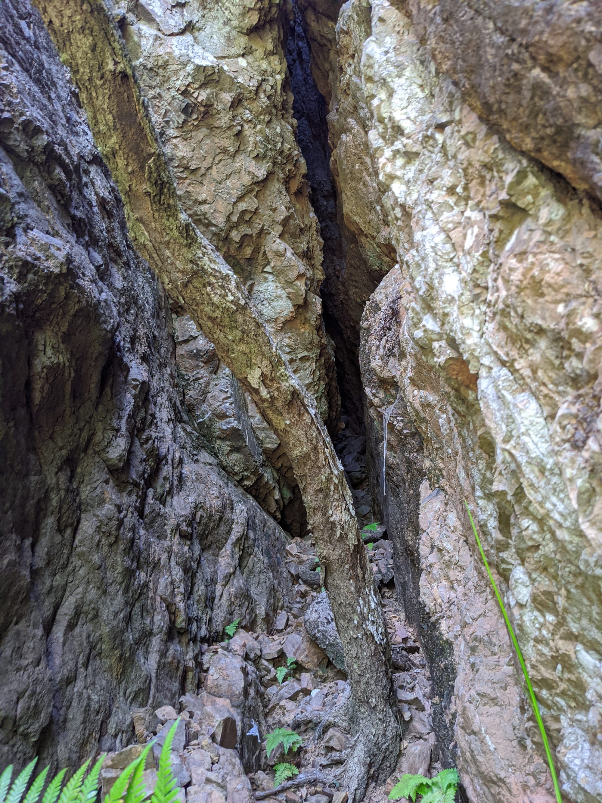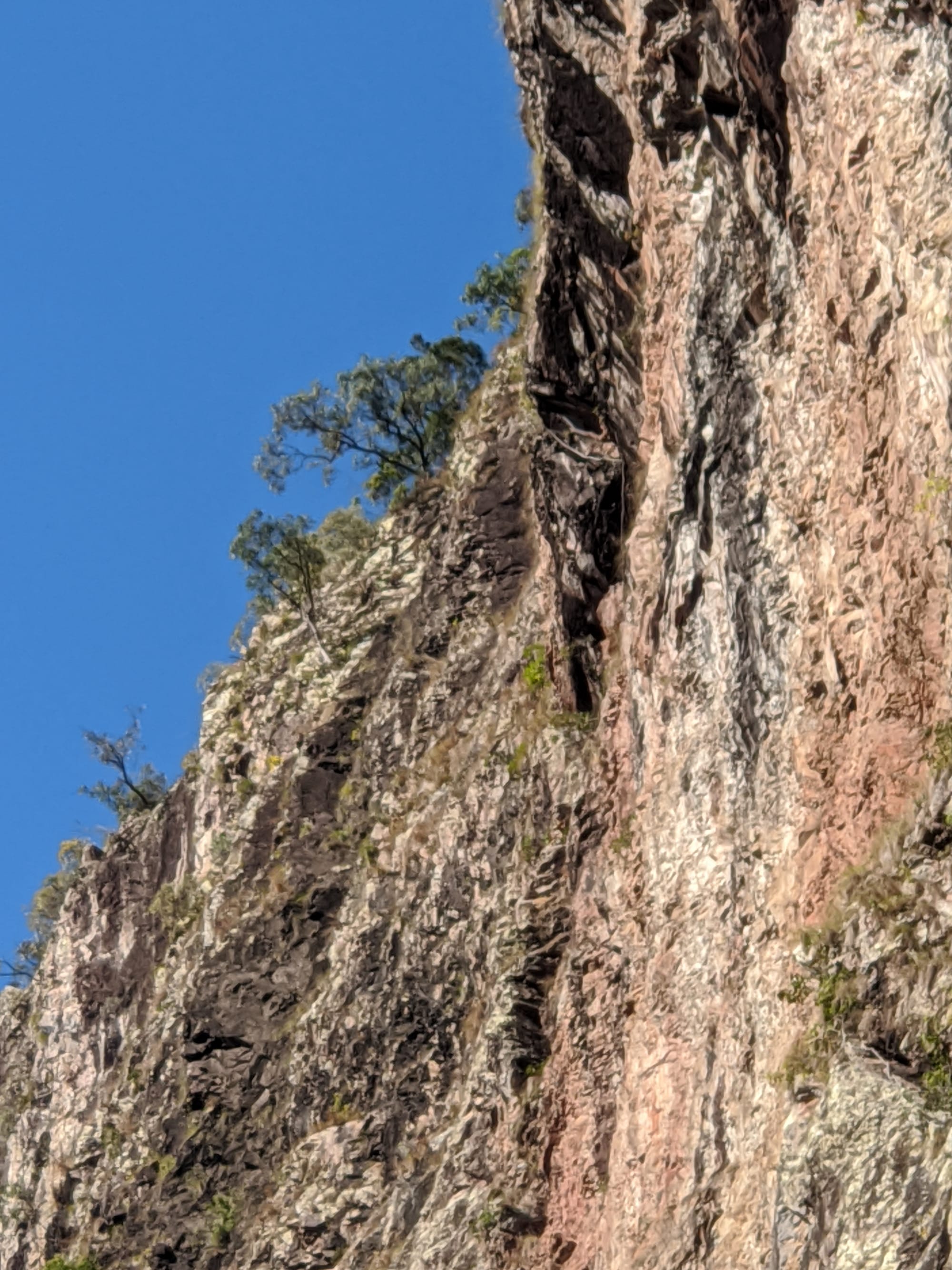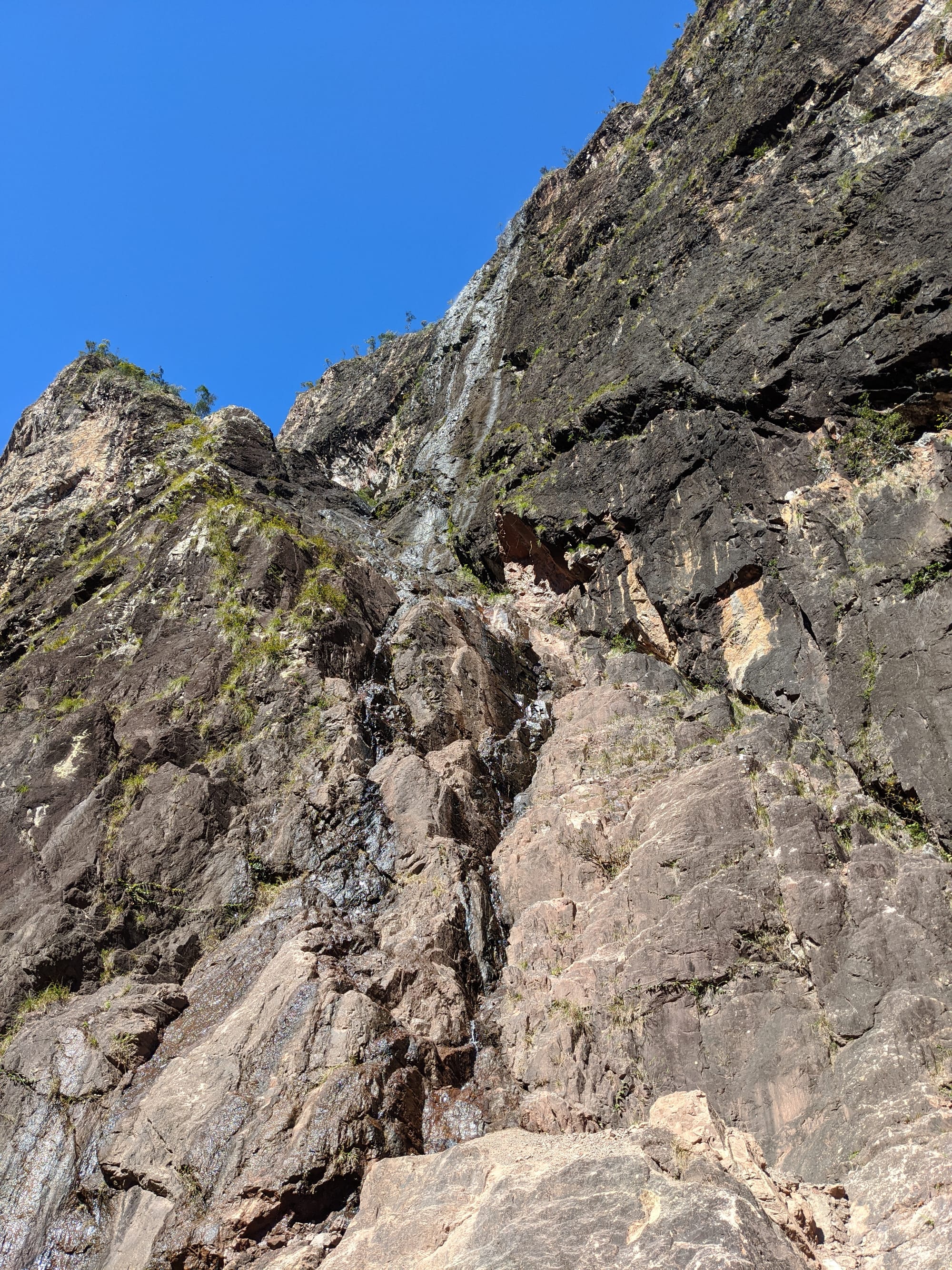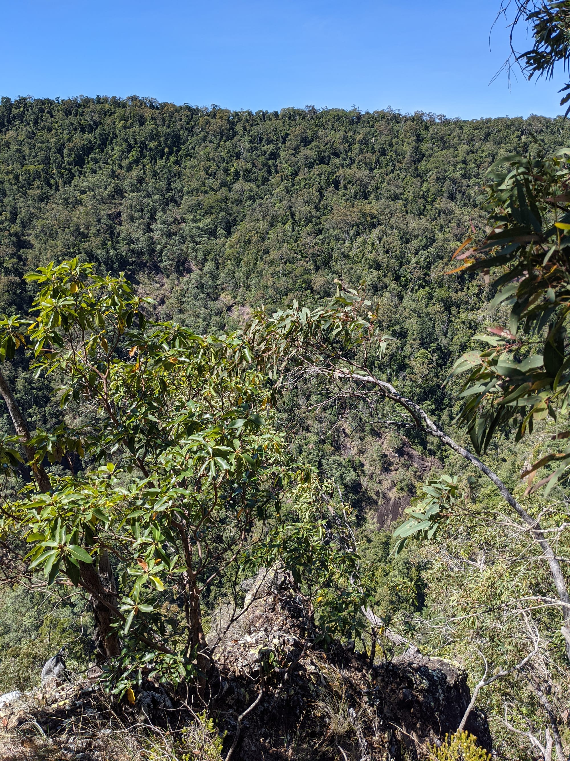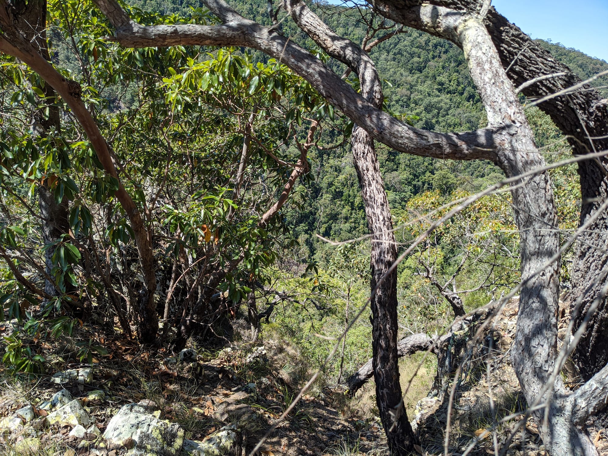 After our brief swim, we decided it was time to test our luck on the escape plan - a steep spur heading up towards the Wallaman Falls track and lookout. From below, it looked brutally steep, and it did not disappoint. We first had to bash through a patch of lantana and chossy rock before breaking into open grassland. The slope was so sharp in places that we were hauling ourselves upward by grabbing clumps of grass in each hand. It was hard work, with plenty of puffing and a few muttered comments about whose bright idea this had been. At some point along the ridge, we heard the rocks rumble (a possible landslip occurred?), and we found out later that it was an earthquake in Bowen.