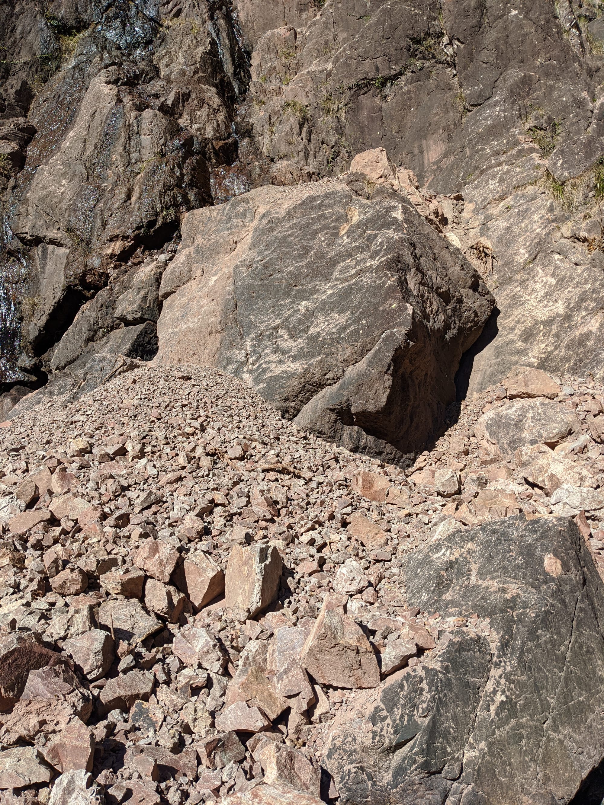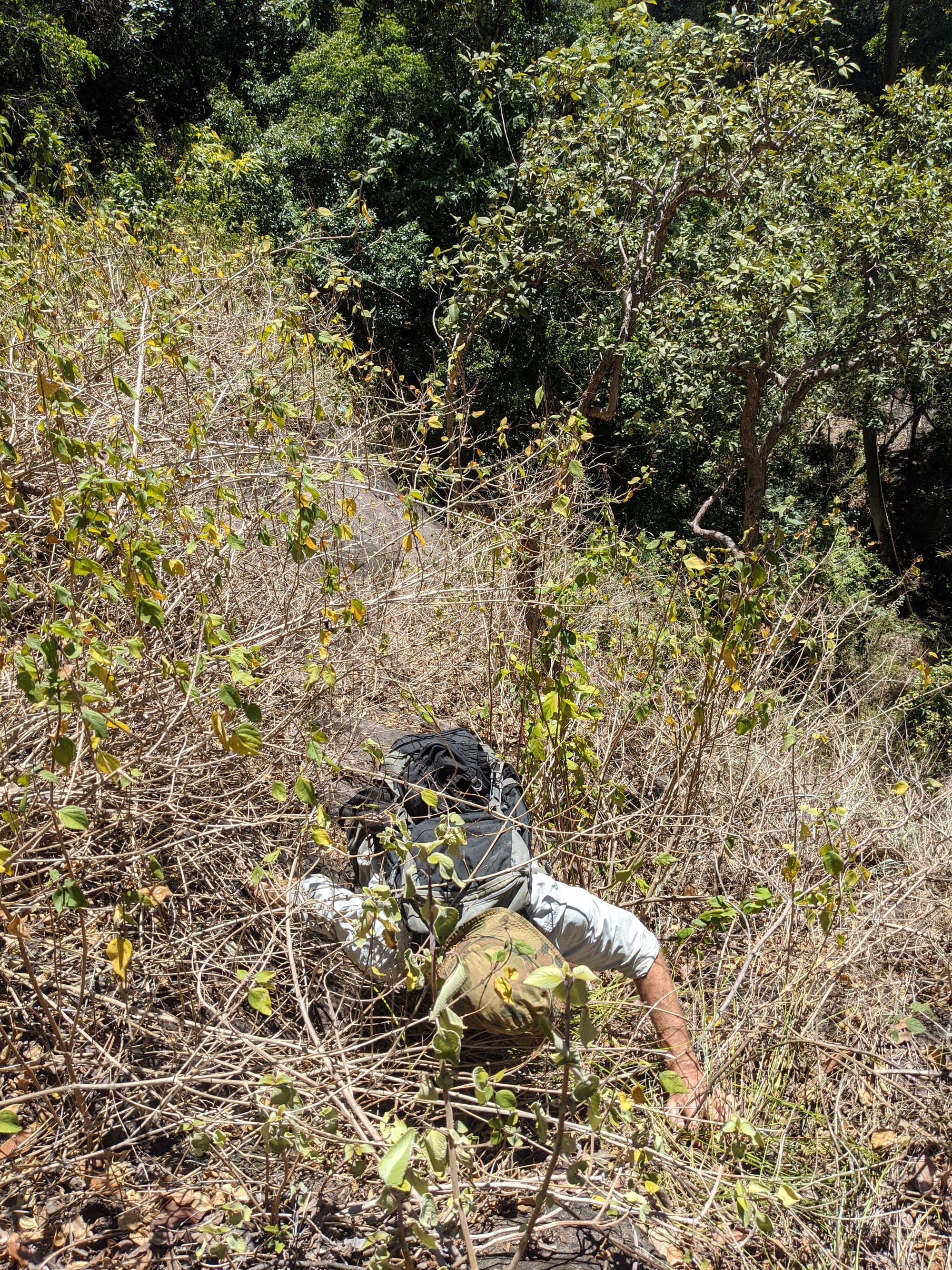 Higher up, the ridgeline eased slightly, but then came the sting in the tail - a cliff band cutting across the slope and seeming to run endlessly in both directions. Straight up was out of the question, and the terrain to the right looked especially loose and unsafe. We contoured left along the cliffline, hoping for a weakness, occasionally spotting what looked like animal pads through the scrub. After roughly 100 m of contouring, we finally found a break in the cliff.