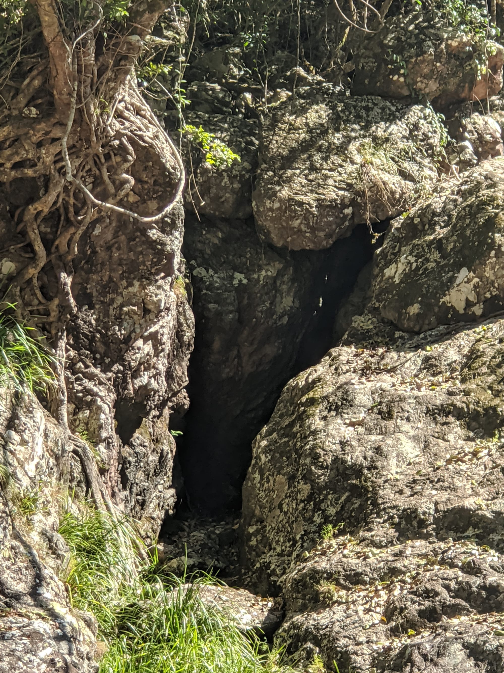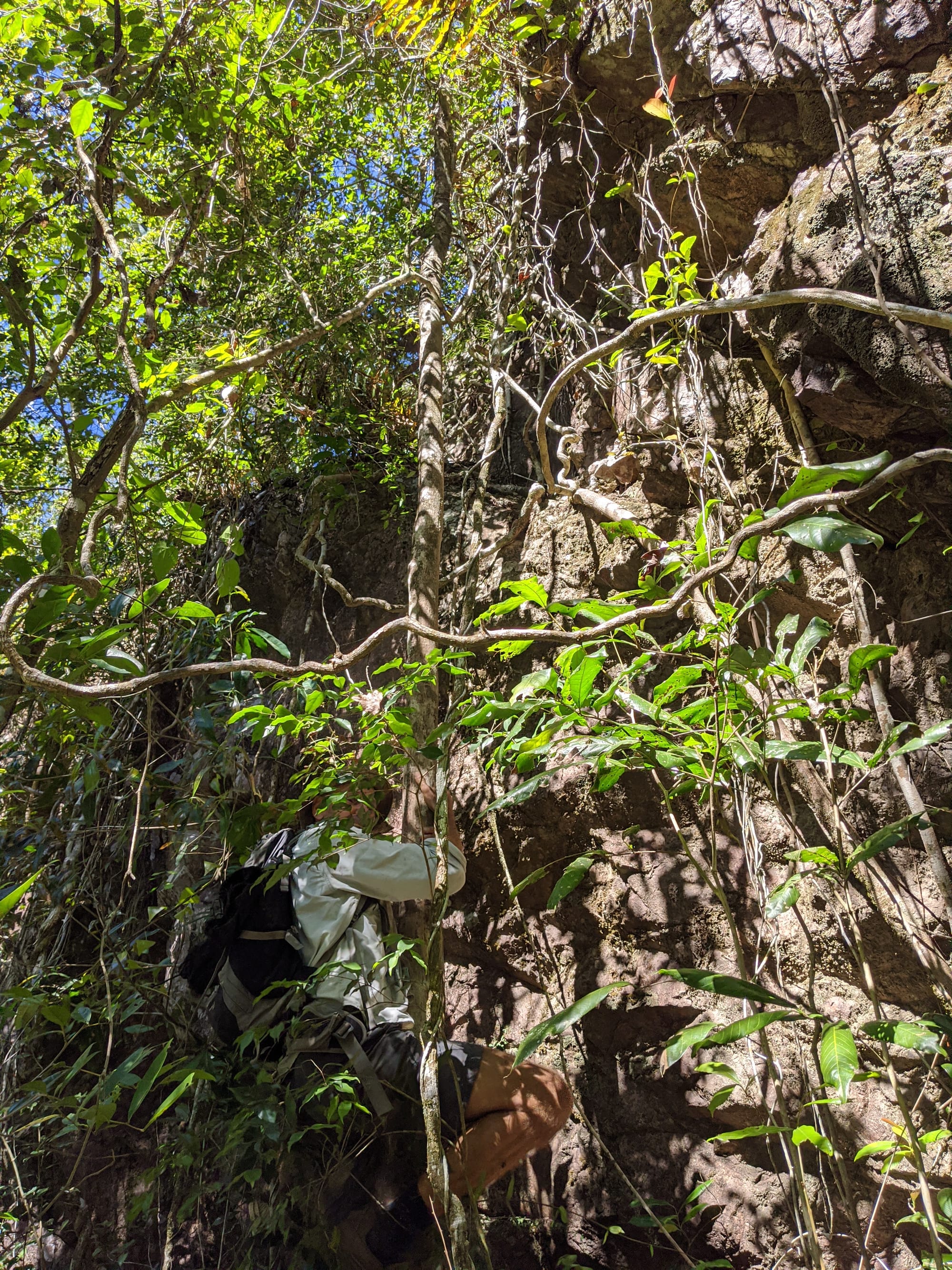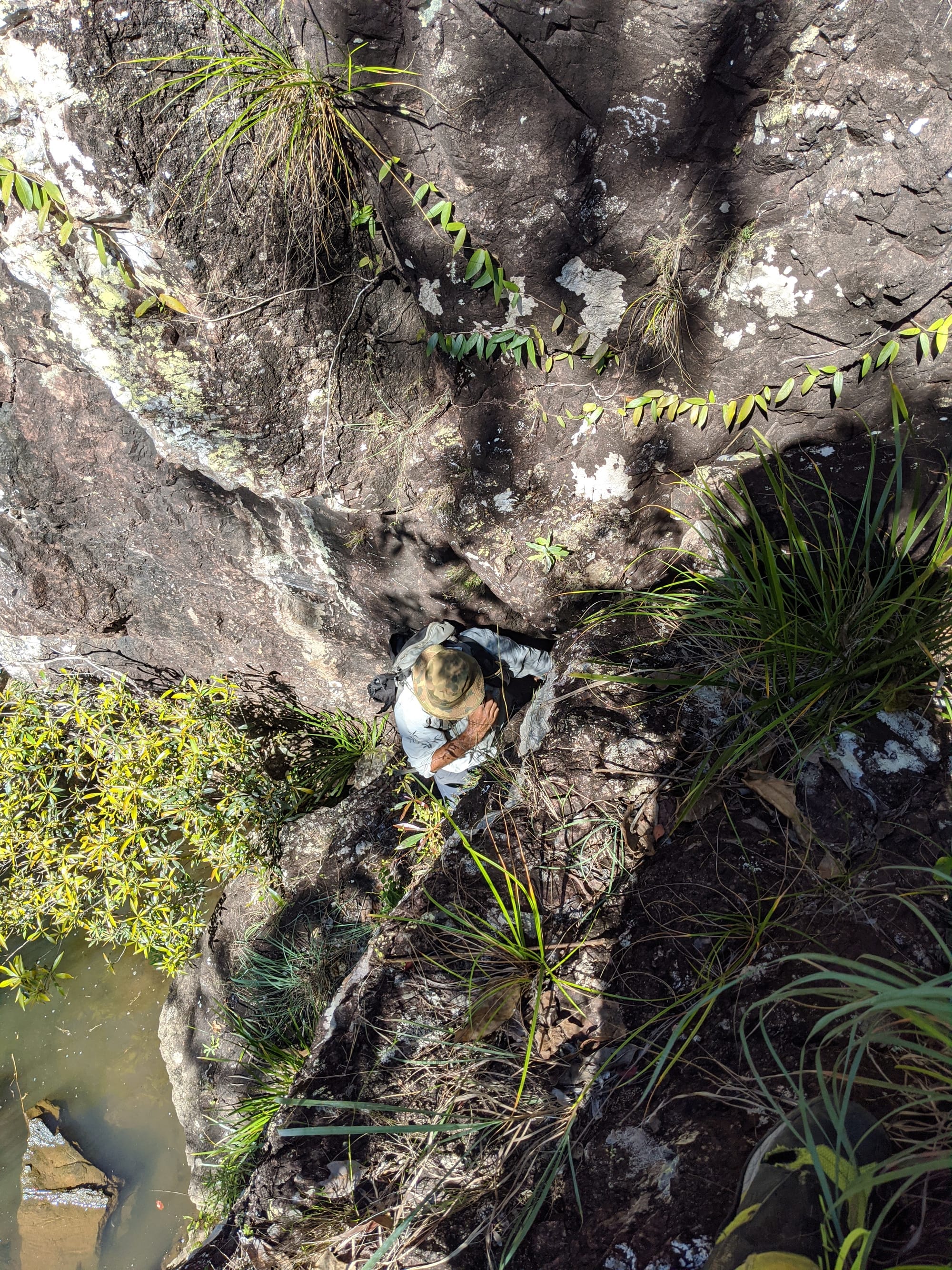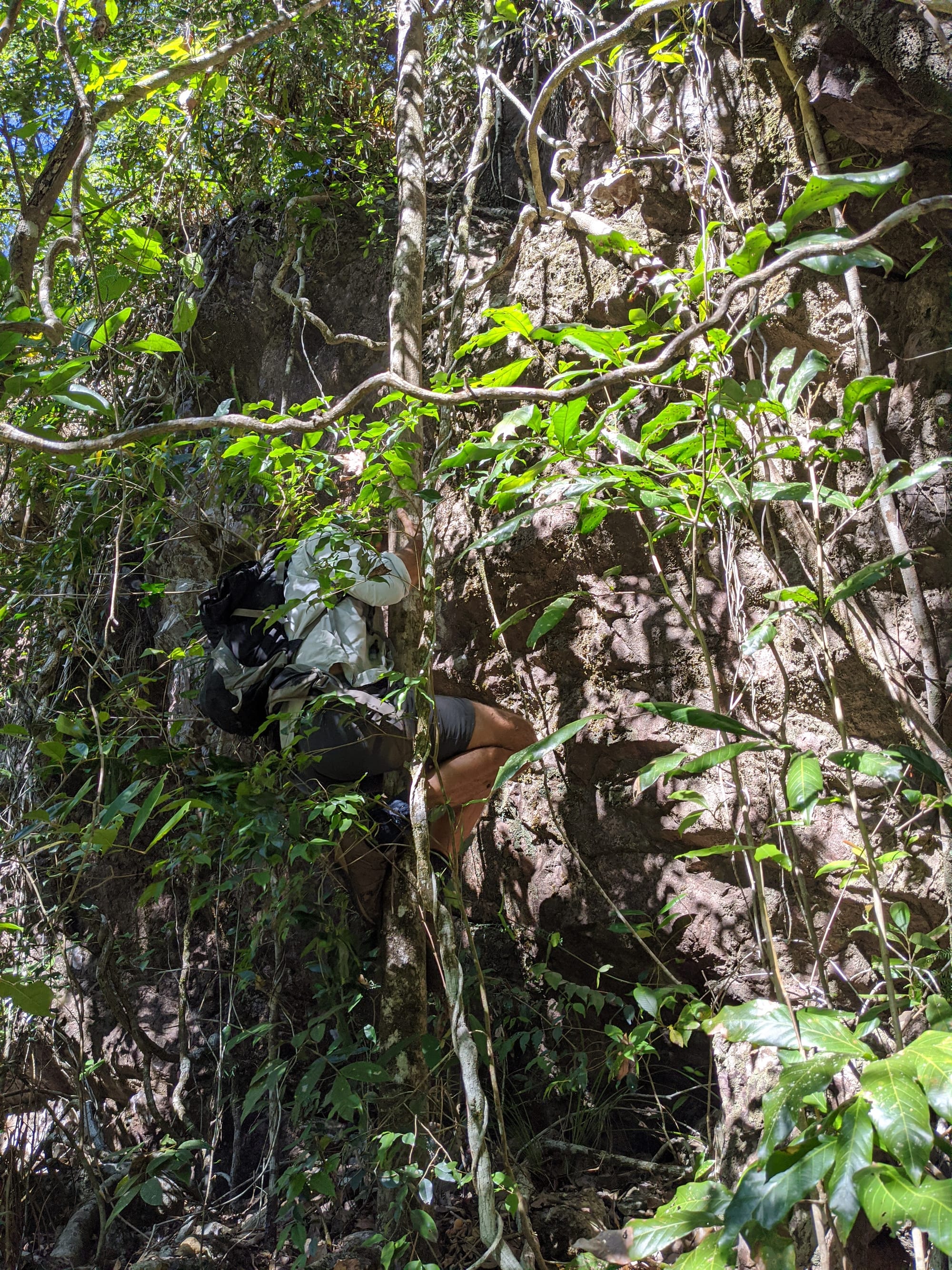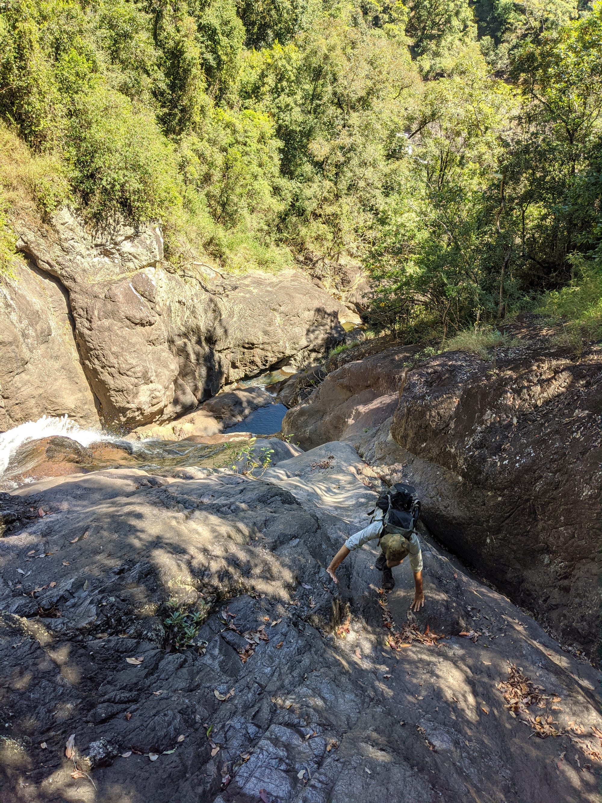 Leaving the main tourist track behind, we rock hopped our way down the creek and worked around the left-hand side of the falls. It quickly became a proper off-track scramble. There were steep sections, slippery rock, and a series of small downclimbs that kept things interesting. At one point, we downclimbed a short cliff with the help of a handy vine & small tree - very much a classic "use what the mountain gives you" moment. We then crossed a steep side gully by edging across the top of a fallen log, with some gympie gympie stinging trees around us adding to the atmosphere.