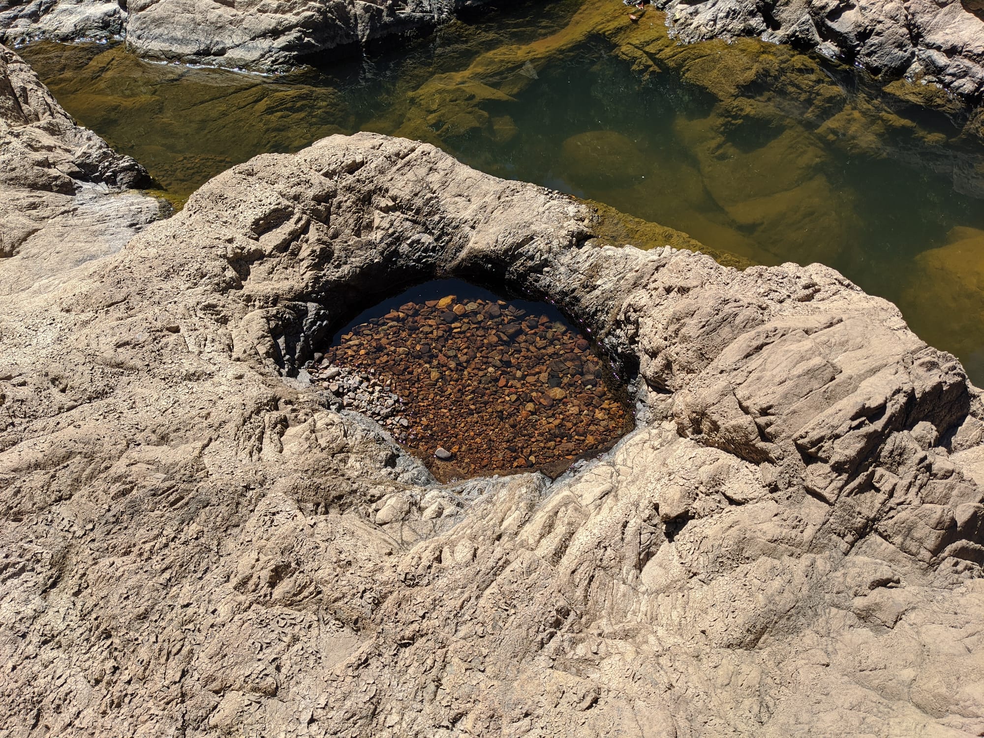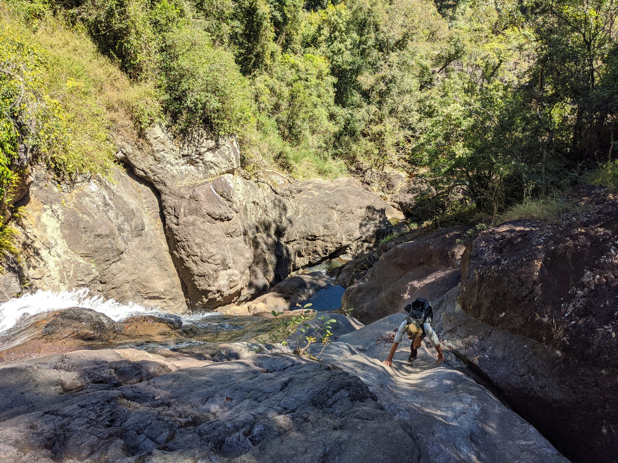 After a few more careful downclimbs, we reached the top of the last waterfall in the creek section we were following. The rock formations through this area were impressive, with sculpted granite, clear pools, and steep walls hemming us in.