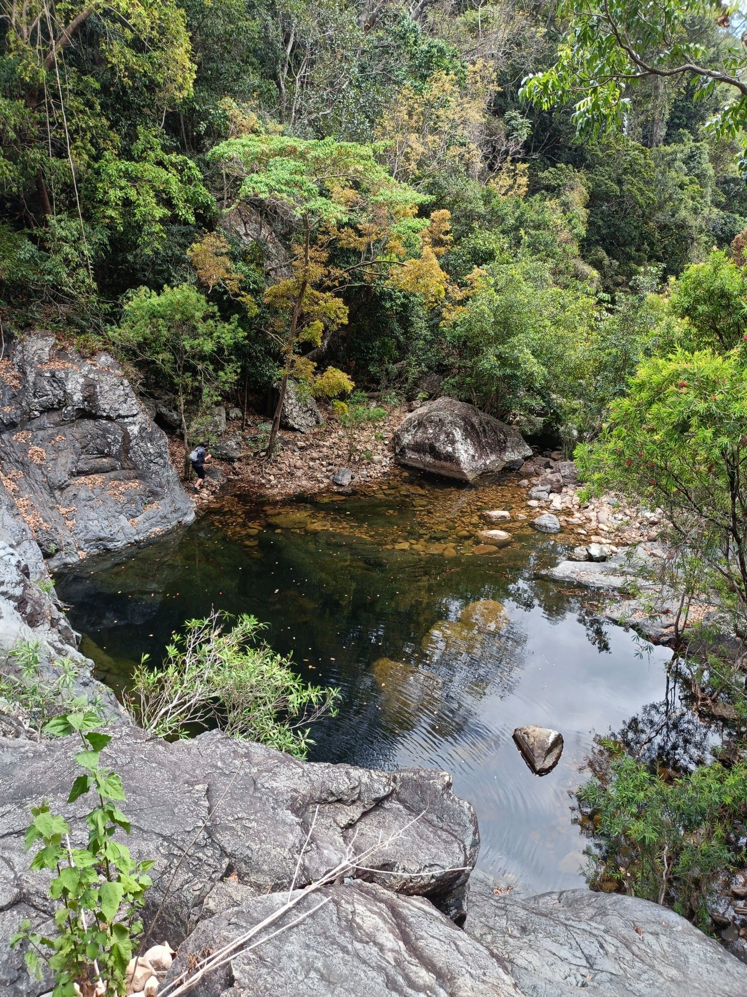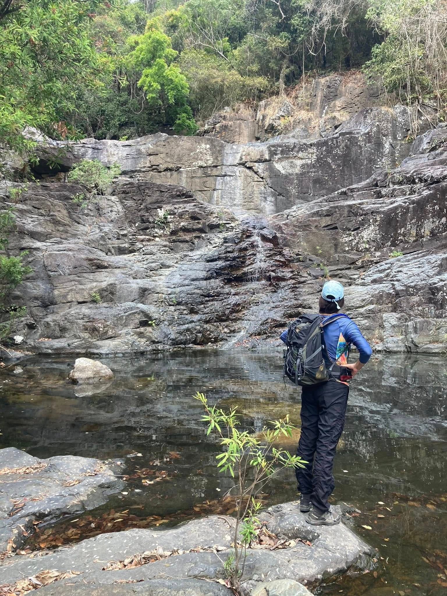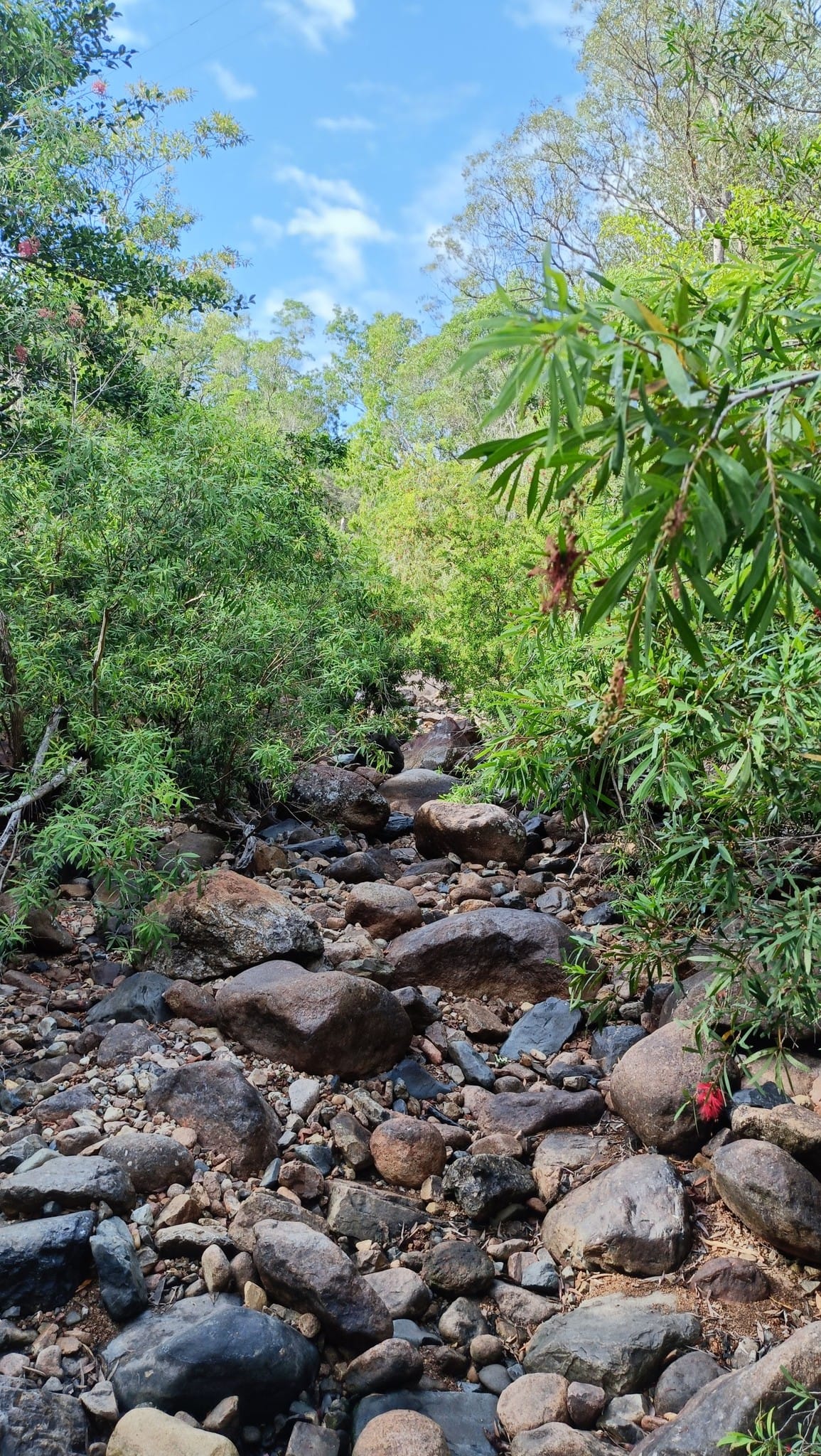The plan was to walk The Terraces, in the Bowling Green Bay National Park, Mount Elliot Section, but due to a miscommunication, we did not have permission from the landowner to access The Terraces Walk through his land. The Townsville Bushwalking Club will never walk on private property without the explicit permission of the owner, and we do not endorse trespassing. With quick thinking, the group switched to North Creek (Sandy Creek) in another part of the Bowling Green Bay National Park. Despite lower-than-usual flow, the creek still carried enough water in the upper sections to liven the waterfalls and provide excellent swimming spots.