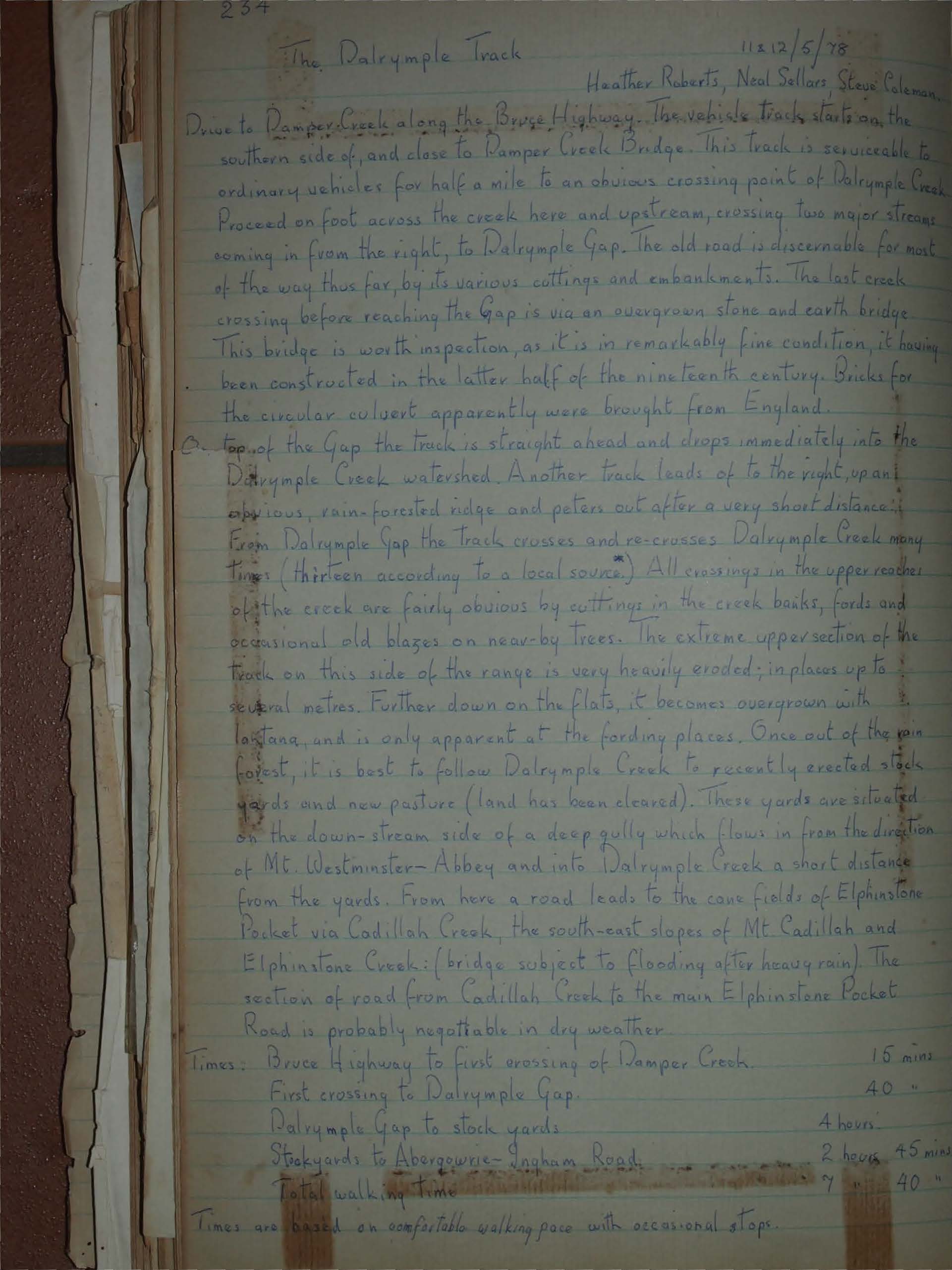 On top of the Gap the track is straight ahead and drops immediately into the Dalrymple Creek watershed. Another track leads of to the right, up an obvious, rain-forested ridge and peters out after a very short distance. From Dalrymple Gap the track crosses and re-crosses Dalrymple Creek many times (thirteen according to a local source *). All crossings in the upper reaches of the creek are fairly obvious by cuttings in the creek banks, fords and occasional old blazes on near-by trees. The extreme upper section of the track on this side of the range is very heavily eroded; in places up to several metres. Further down on the flats, it becomes overgrown with lantana, and is only apparent at the fording places. Once out of the rainforest, it is best to follow Dalrymple Creek to recently erected stock yards and new pasture (land has been cleared). These yards are situated on the down-stream side of a deep gully which flows in from the direction of Mt. Westminster-Abbey and into Dalrymple Creek a short distance from the yards. From here a road leads to the cane fields of Elphinstone Pocket via Cadillah Creek, the south-east slopes of Mt. Cadillah and Elphinstone Creek: (bridge subject to flooding after heavy rain). The section of road from Cadillah Creek to the main Elphinstone Pocket road is probably negotiable in dry weather.
