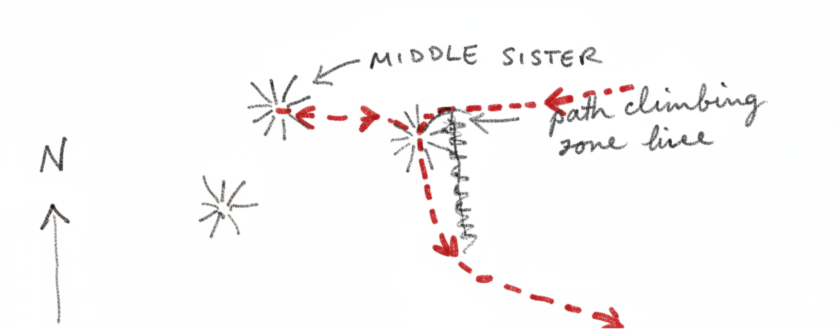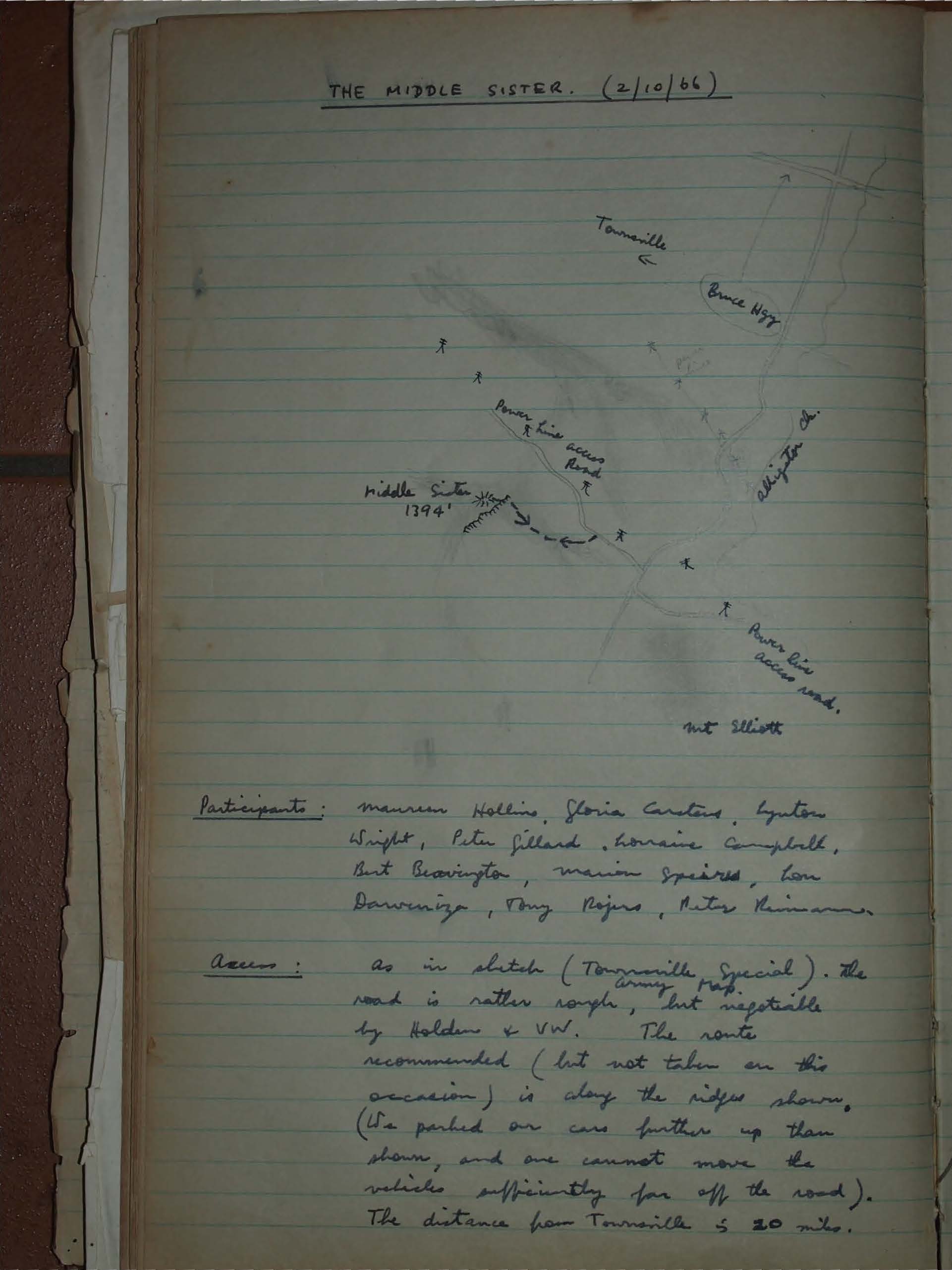 The Club visited the middle Sister in 1967 doing some abseiling practice off a small cliff on its north side - the route taken as shown [on map] was an easy walk...