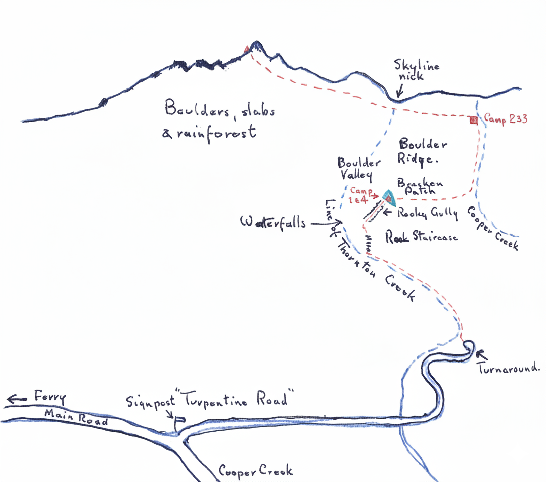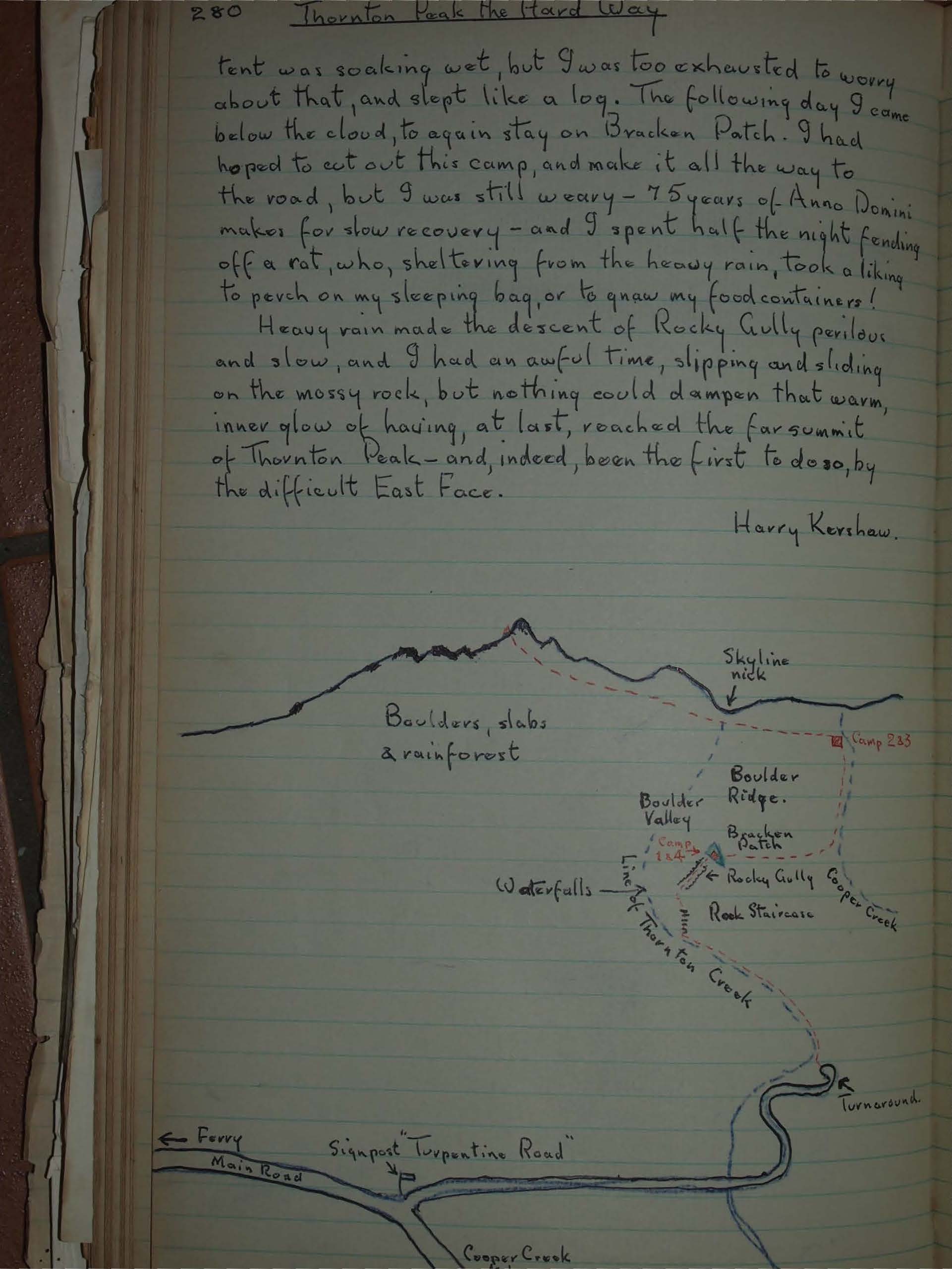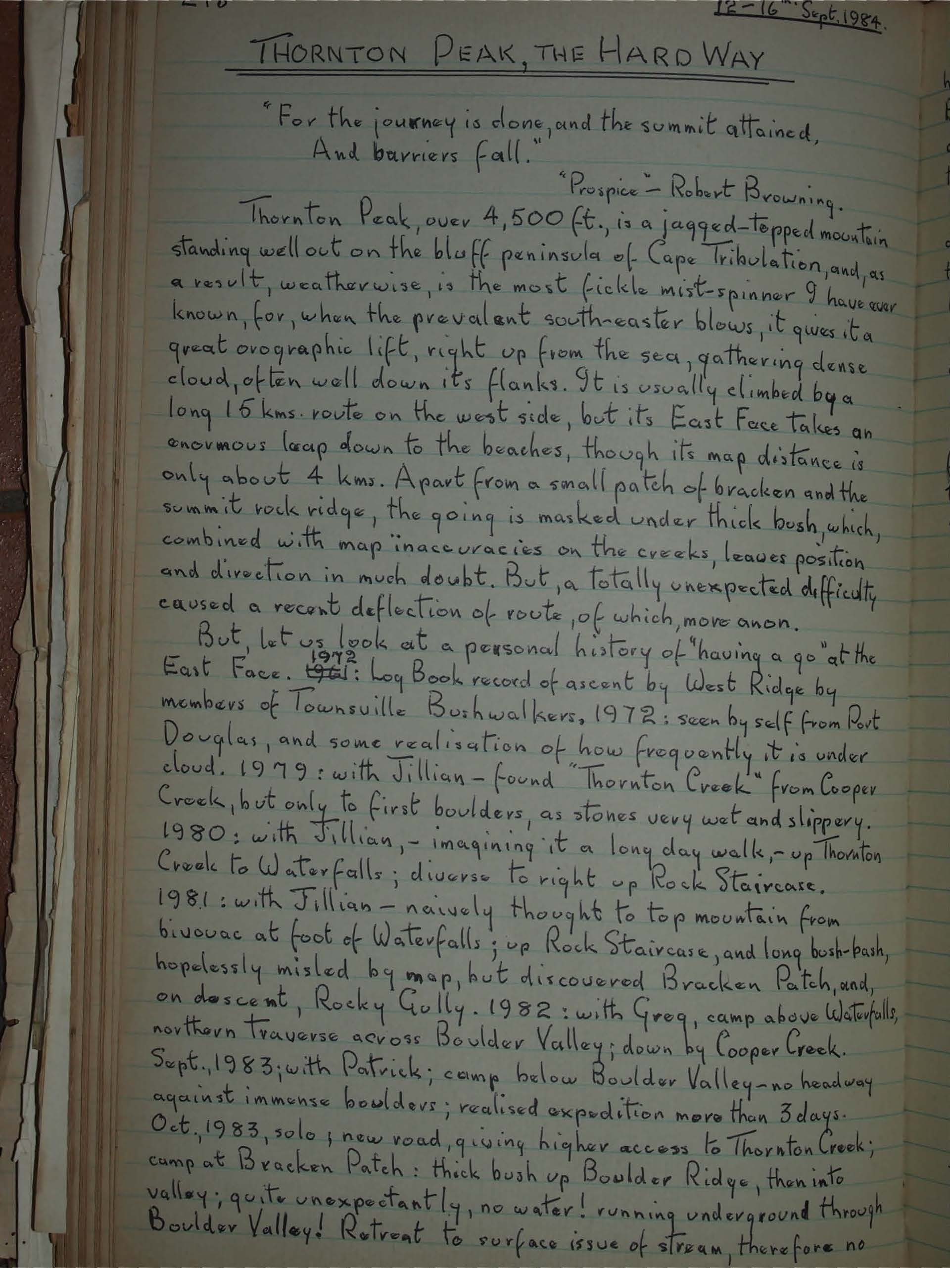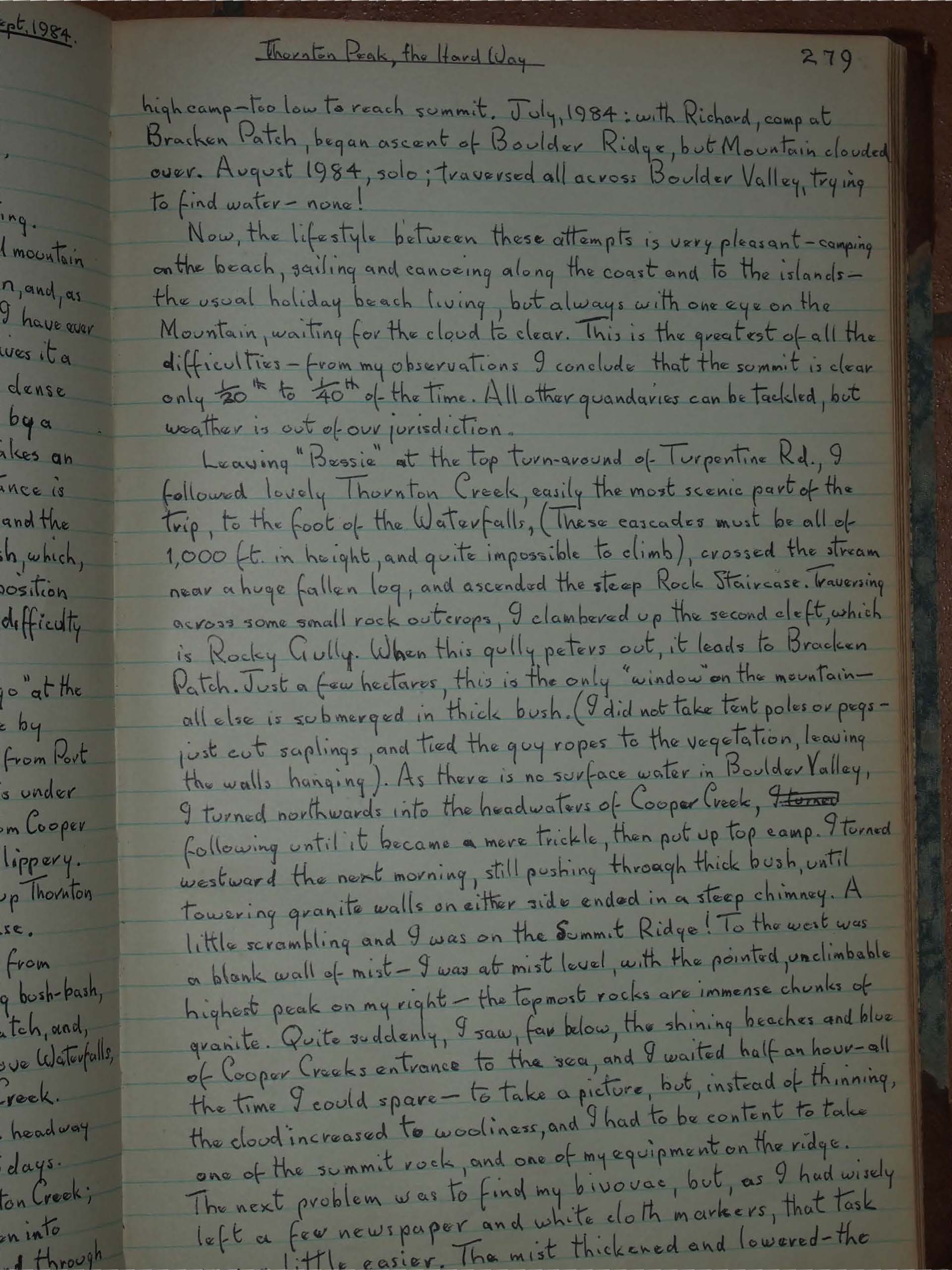 Oct., 1983, solo; new road, giving higher access to Thornton Creek; camp at Bracken Patch: thick bush up Boulder Ridge, then into valley; quite unexpectantly, no water! running underground through Boulder Valley! Retreat to surface issue of stream, therefore no high camp - too low to reach summit. July, 1984: with Richard, camp at Bracken Patch, began ascent of Boulder Ridge, but Mountain clouded over. August 1984, solo; traversed all across Boulder Valley, trying to find water - none!