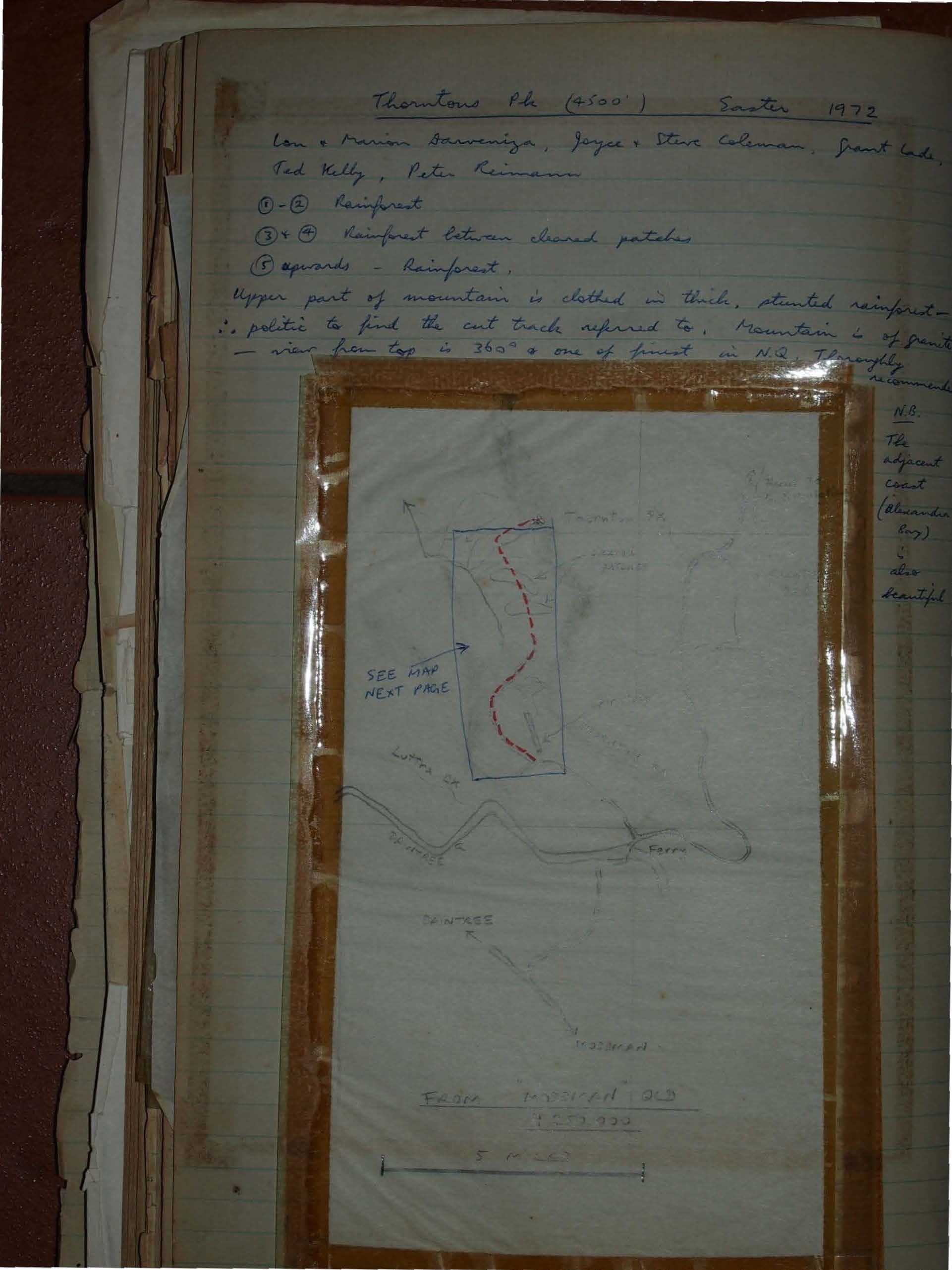 Thorntons Peak (1370 m) Easter 1972: a challenging rainforest climb near Alexandra Bay with tangled tracks, stunted upper forest, and sweeping 360° summit views—among the best in North Queensland. A classic bushwalk to one of the region’s highest and most rewarding peaks.