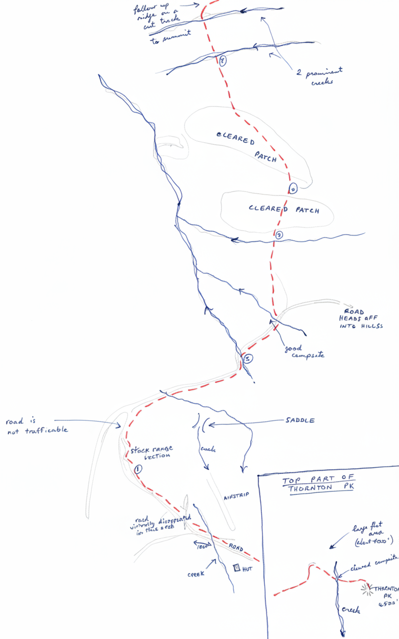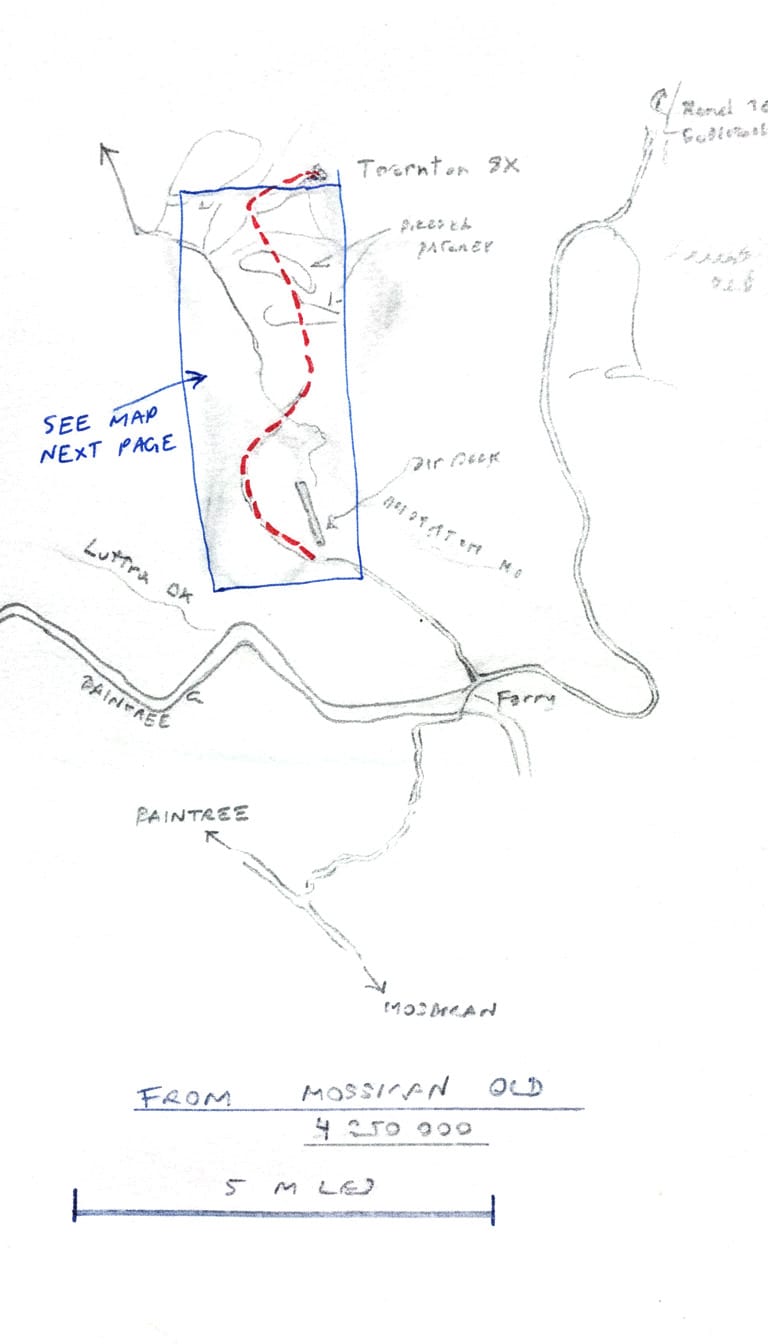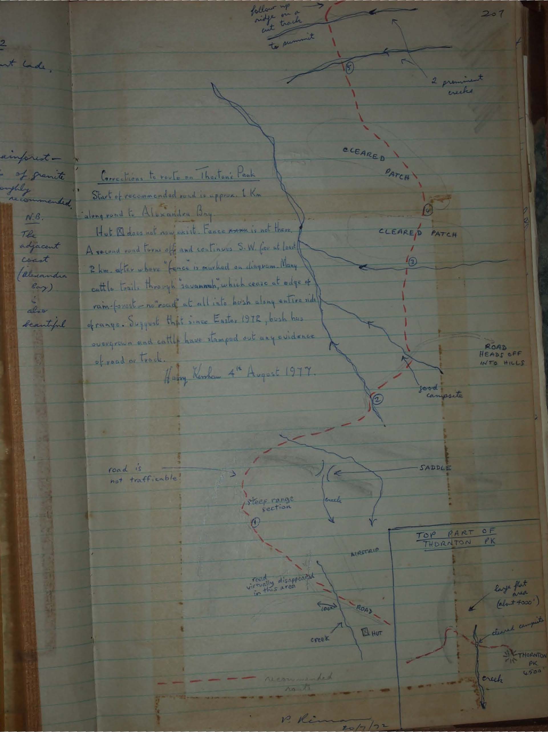 Start of recommended road is approx. 1 Km along road to Alexandra Bay. Hut does not now exist. Fence xxxx is not there. A second road turns off and continues S.W. for at least 2 km. after where 'fence' is marked on diagram. Many cattle trails through savannah, which cease at edge of rain-forest - no road at all into bush along entire side of range. Suggest that since Easter 1972, bush has overgrown and cattle have stamped out any evidence of road or track.
