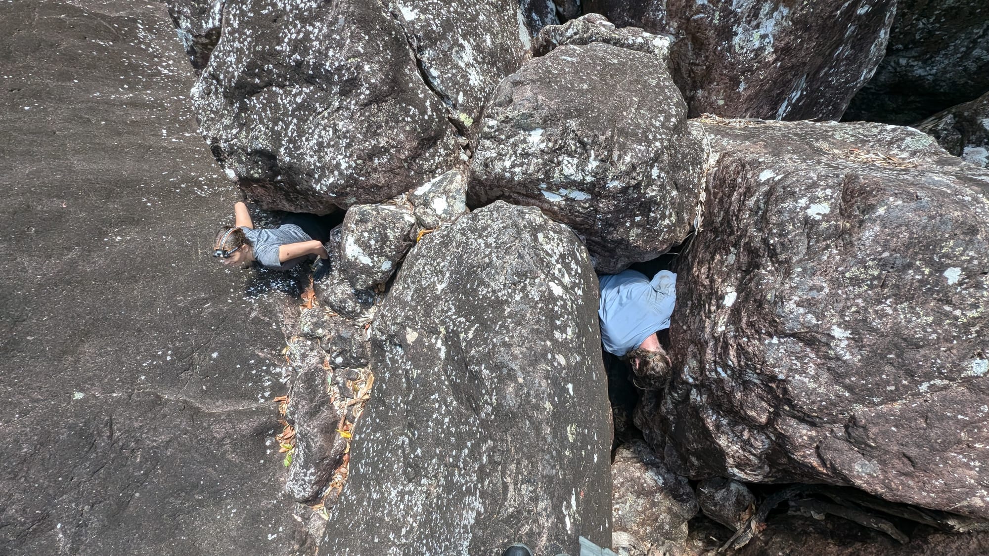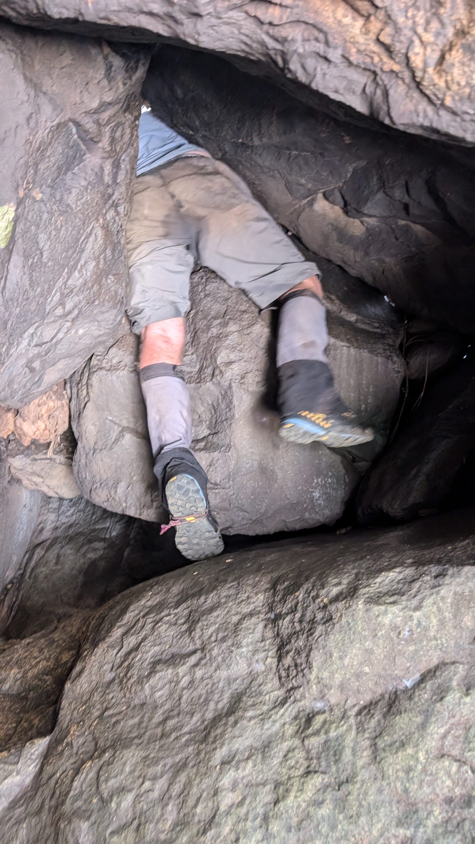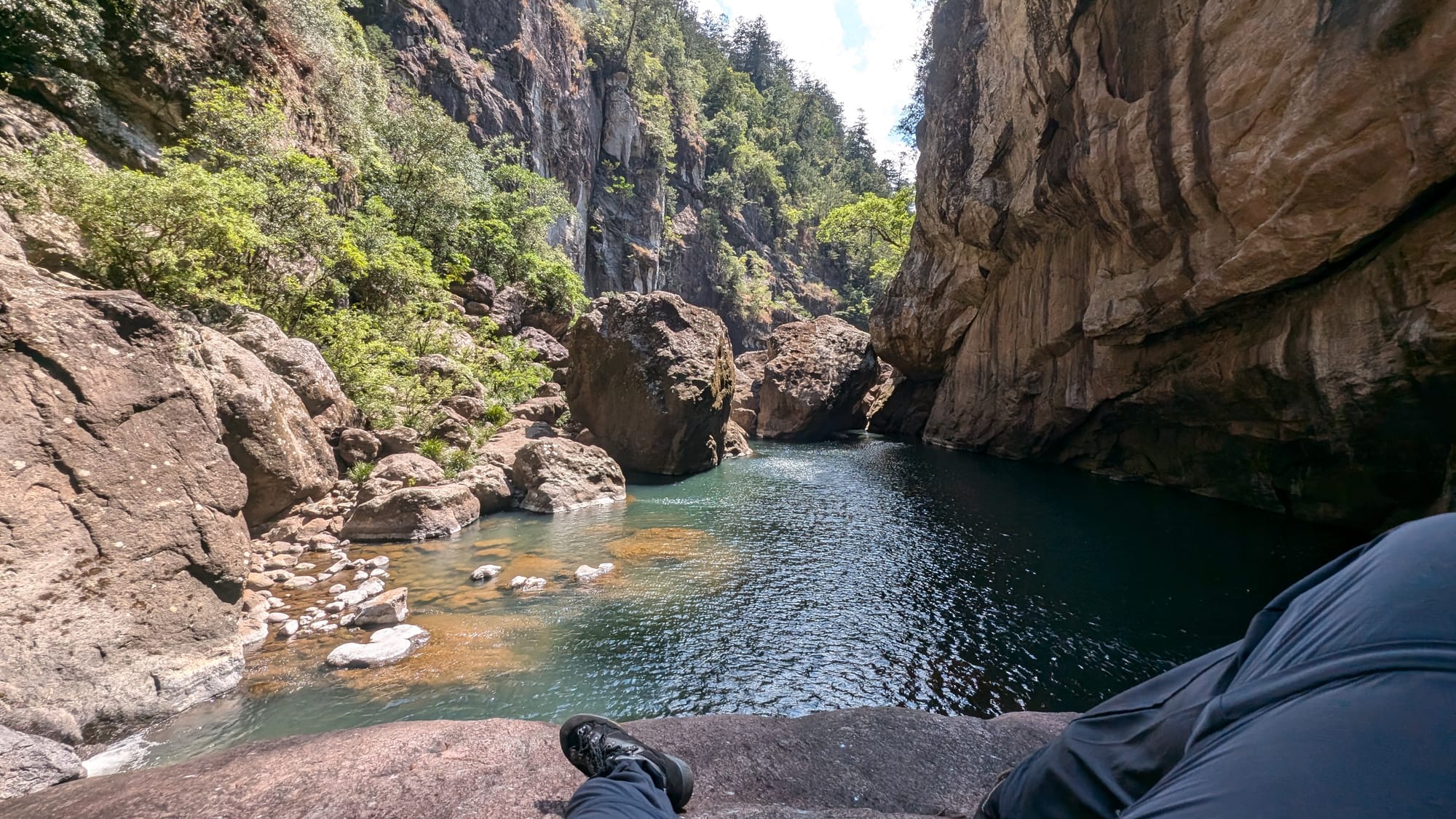 Eventually, we accepted that the loop was not on the cards and shifted gears from "mission mode" to simply enjoying the place for what it was. That turned out to be the right call. We stopped for lunch, explored caves, ducked through tight squeezes between the boulders, and found underground waterfalls hidden inside the maze. There was plenty of swimming, plenty of laughter, and plenty of appreciation for just how unique this gorge is. One of the standout moments was a narrow squeeze through an underground boulder passage with a small waterfall splashing down onto your head as you wriggled through - the sort of feature that makes this place feel more like an adventure playground than a hike. The area is well known for exactly this sort of rugged, cave-like boulder travel, with deep pools, caverns, and hidden scrambles tucked throughout the gorge.