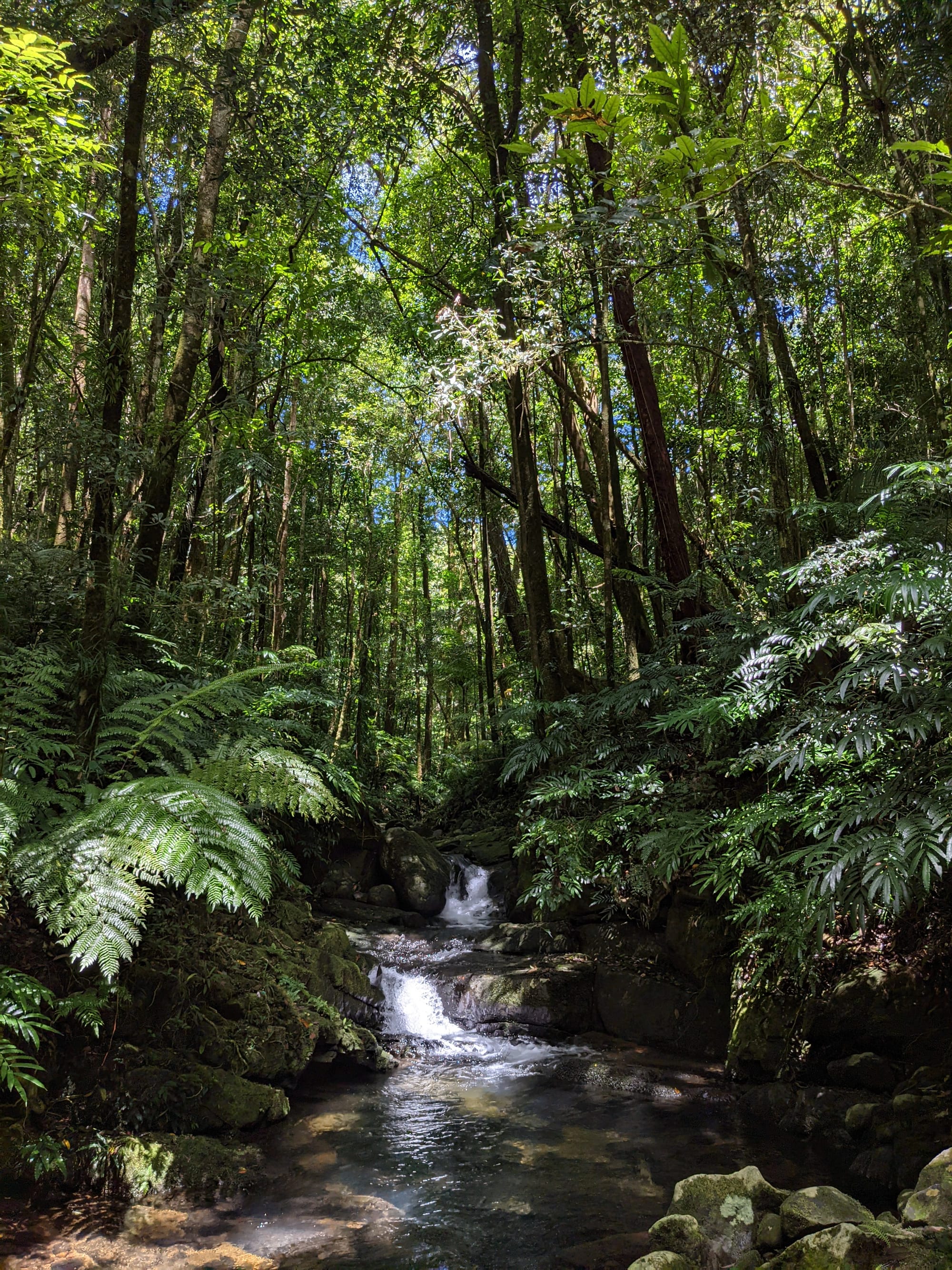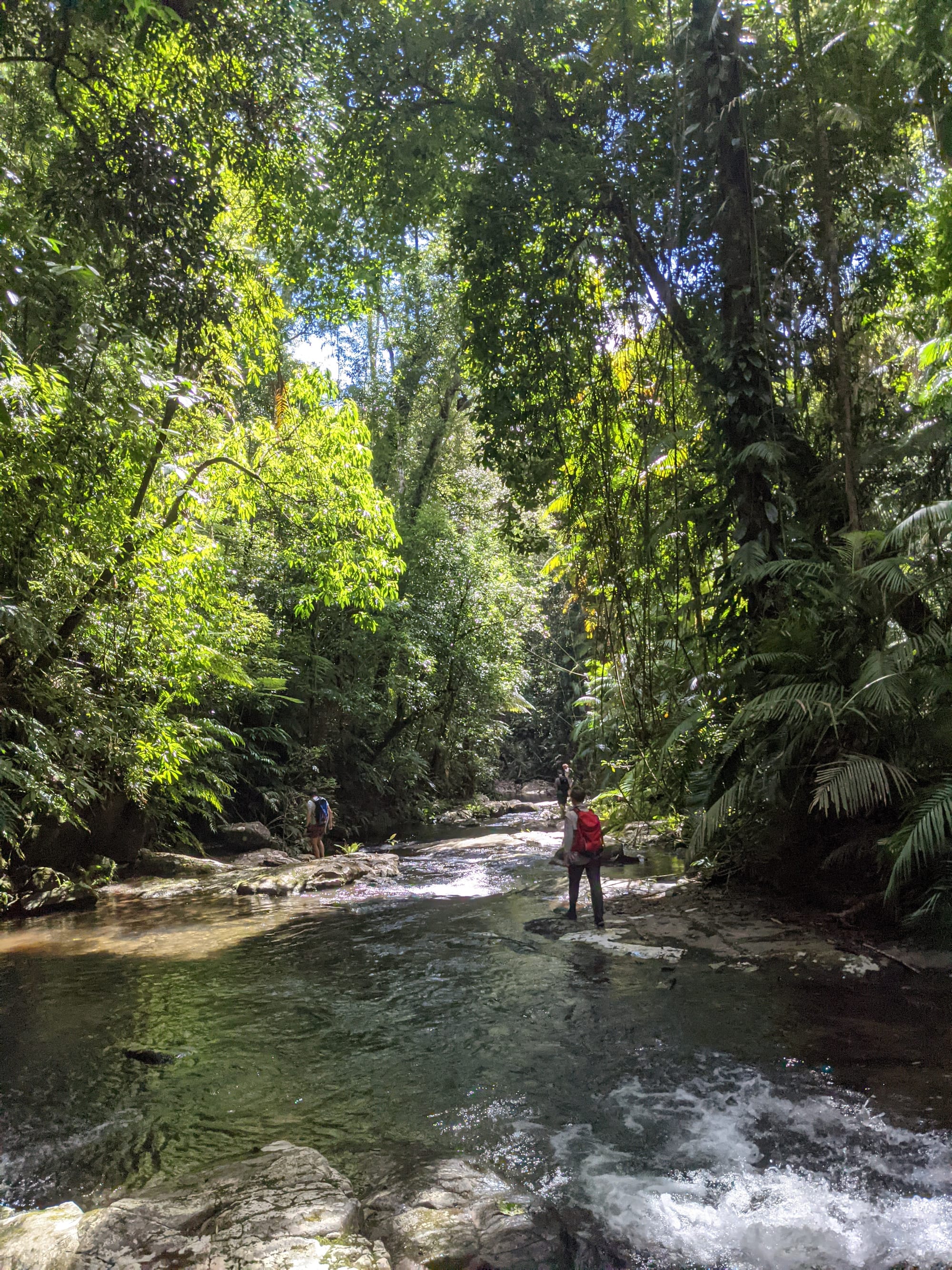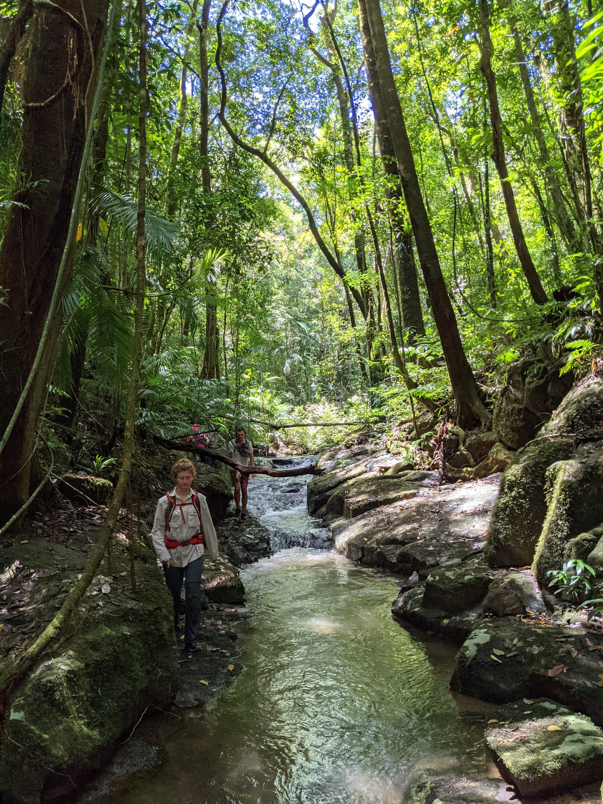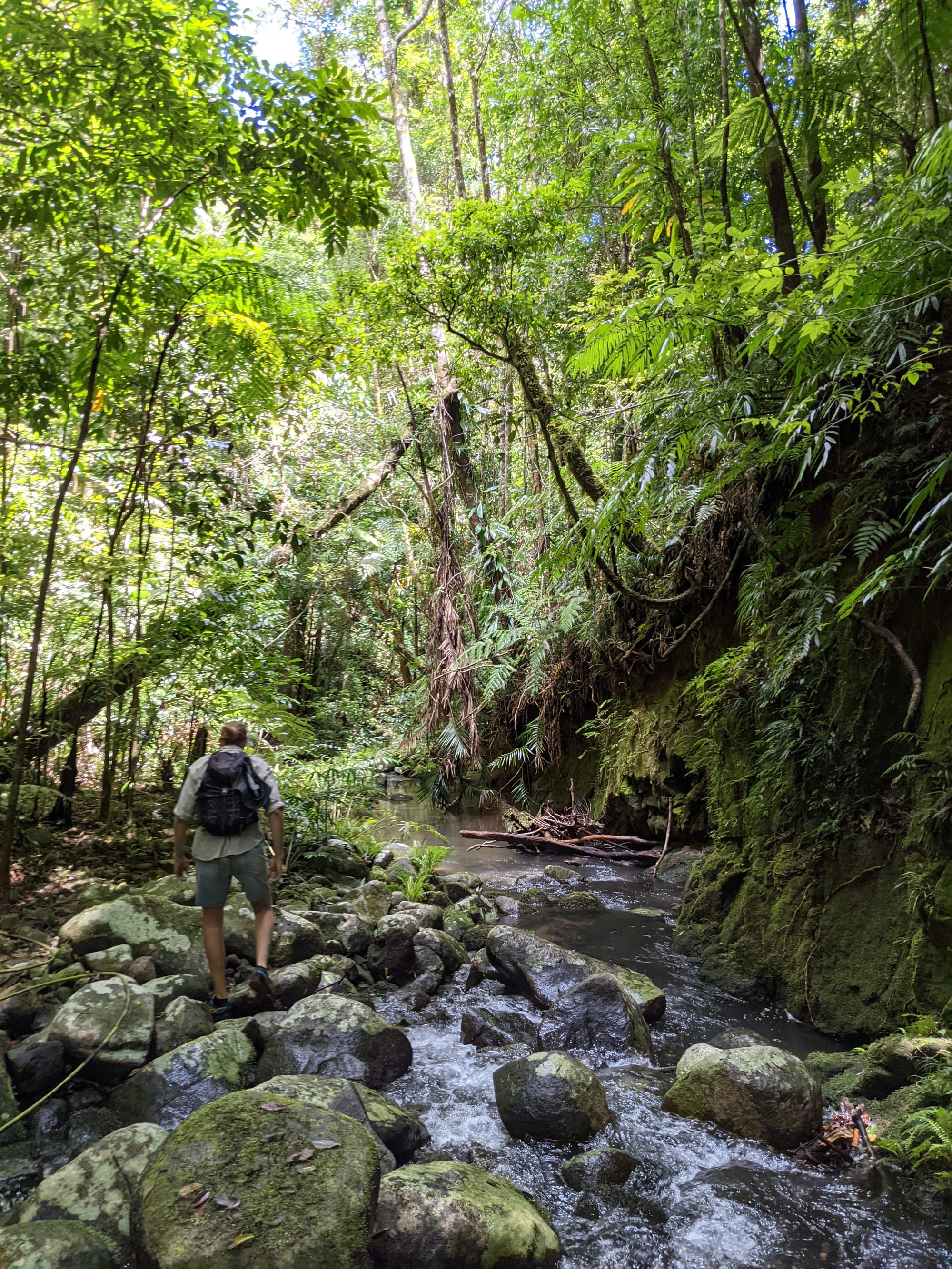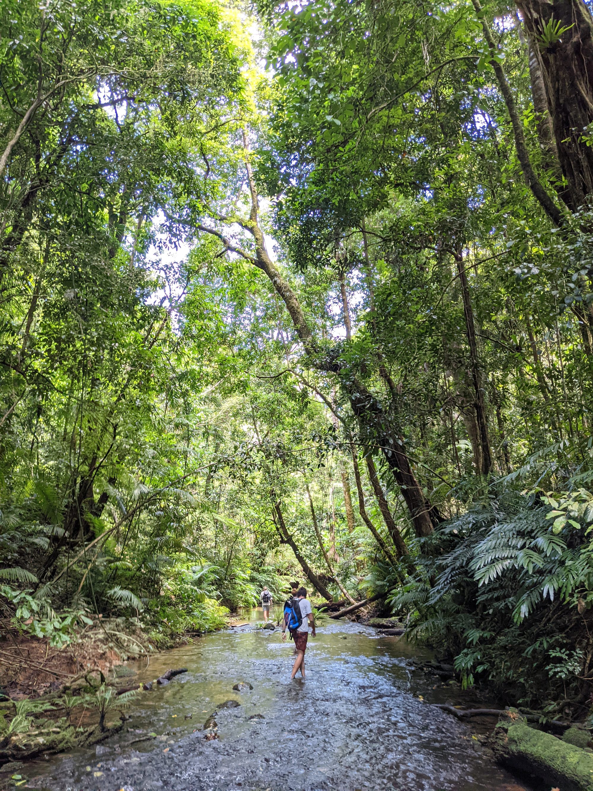 The creek winds its way gently at first. Ferns line the banks. Tree roots clutch at the soil like grasping hands. It feels enclosed and lush, textbook tropical rainforest.