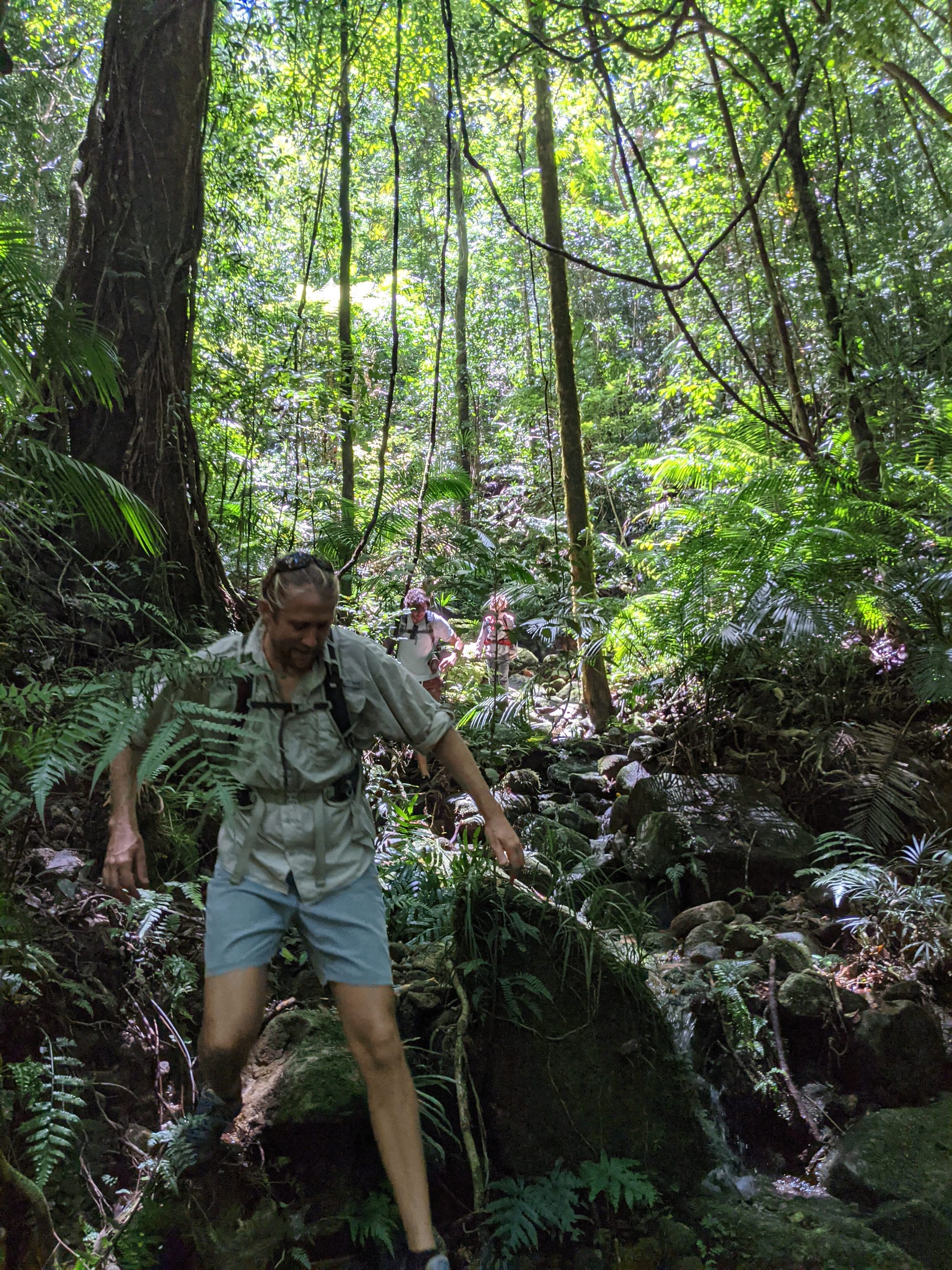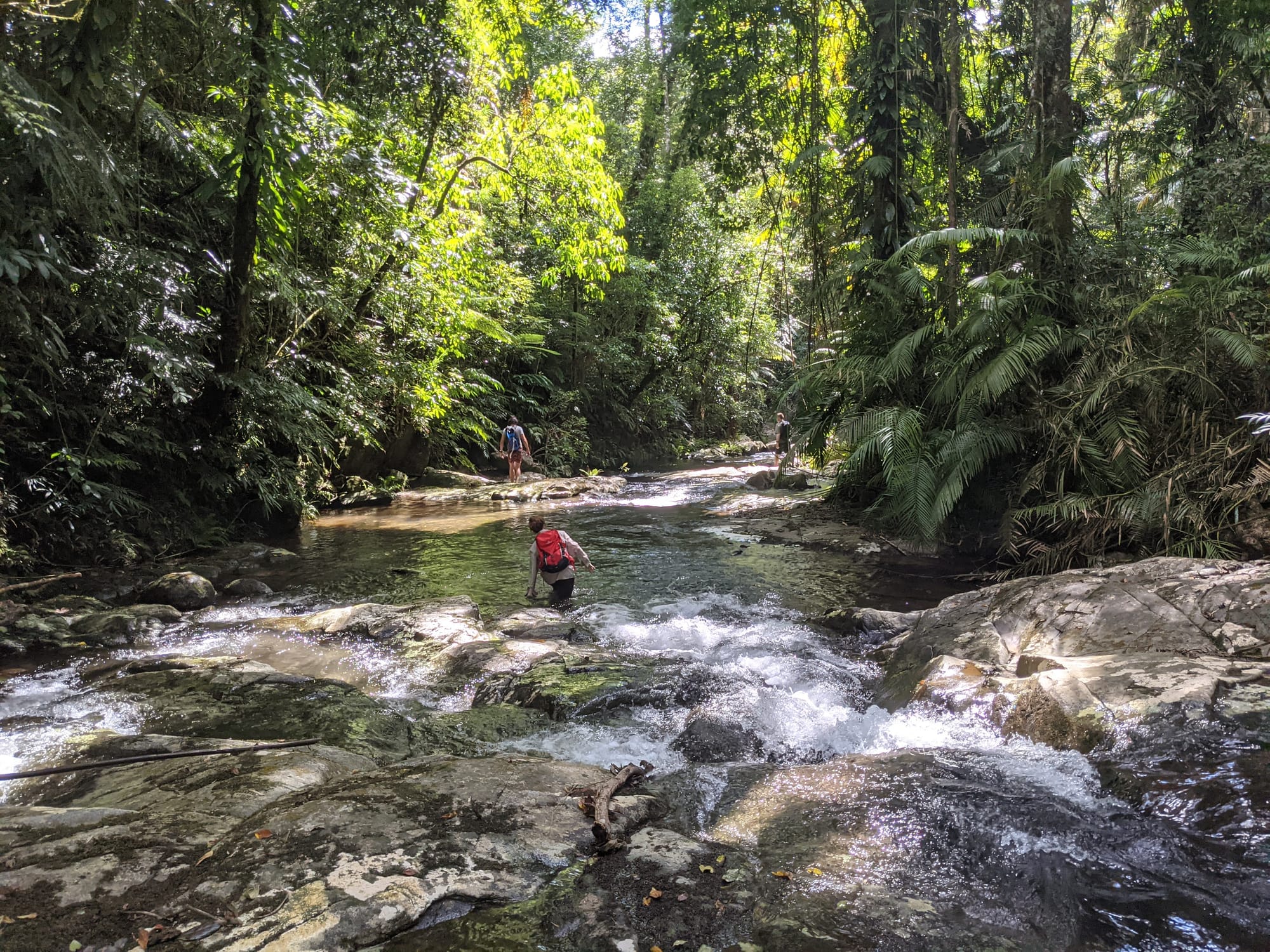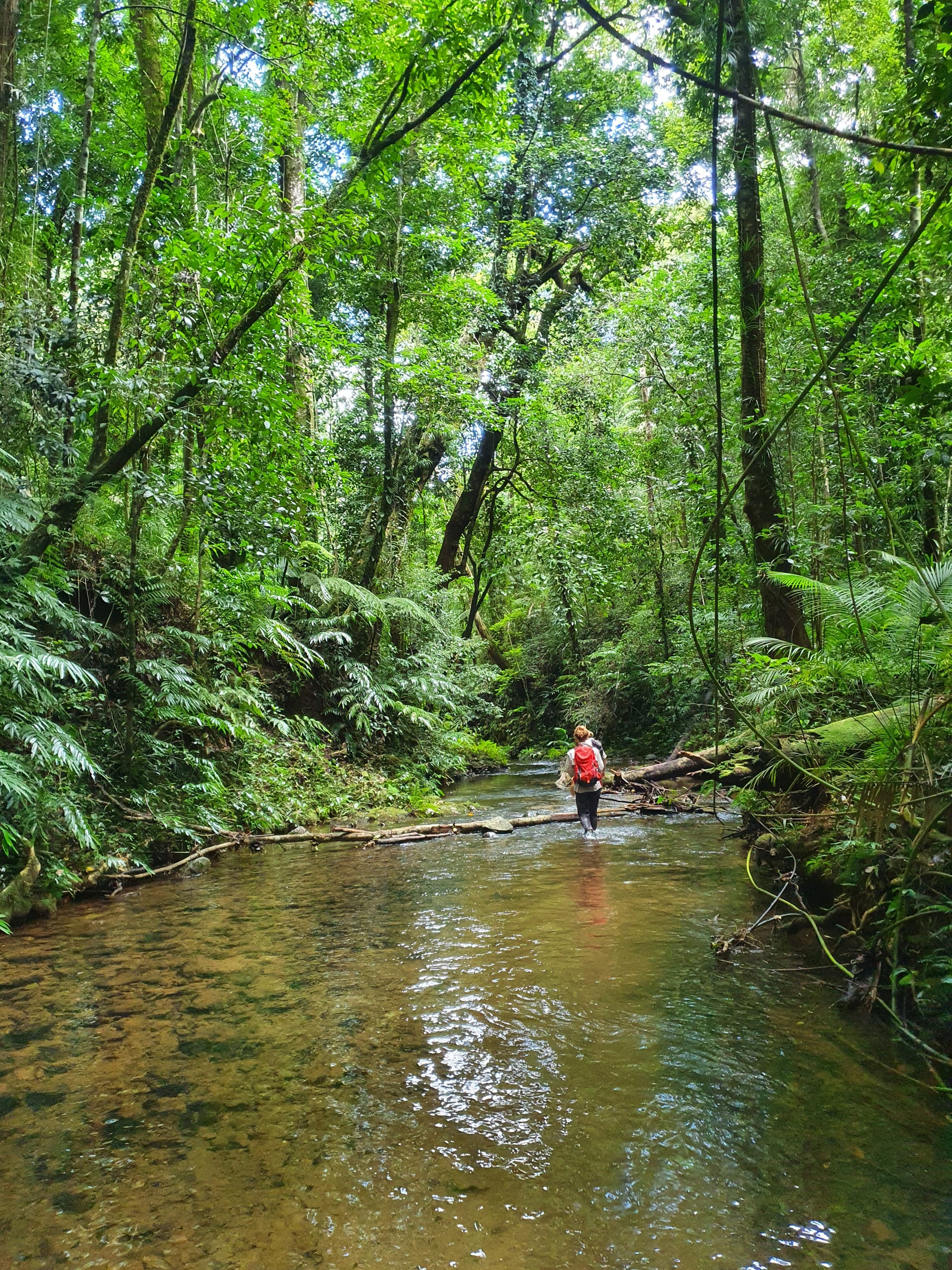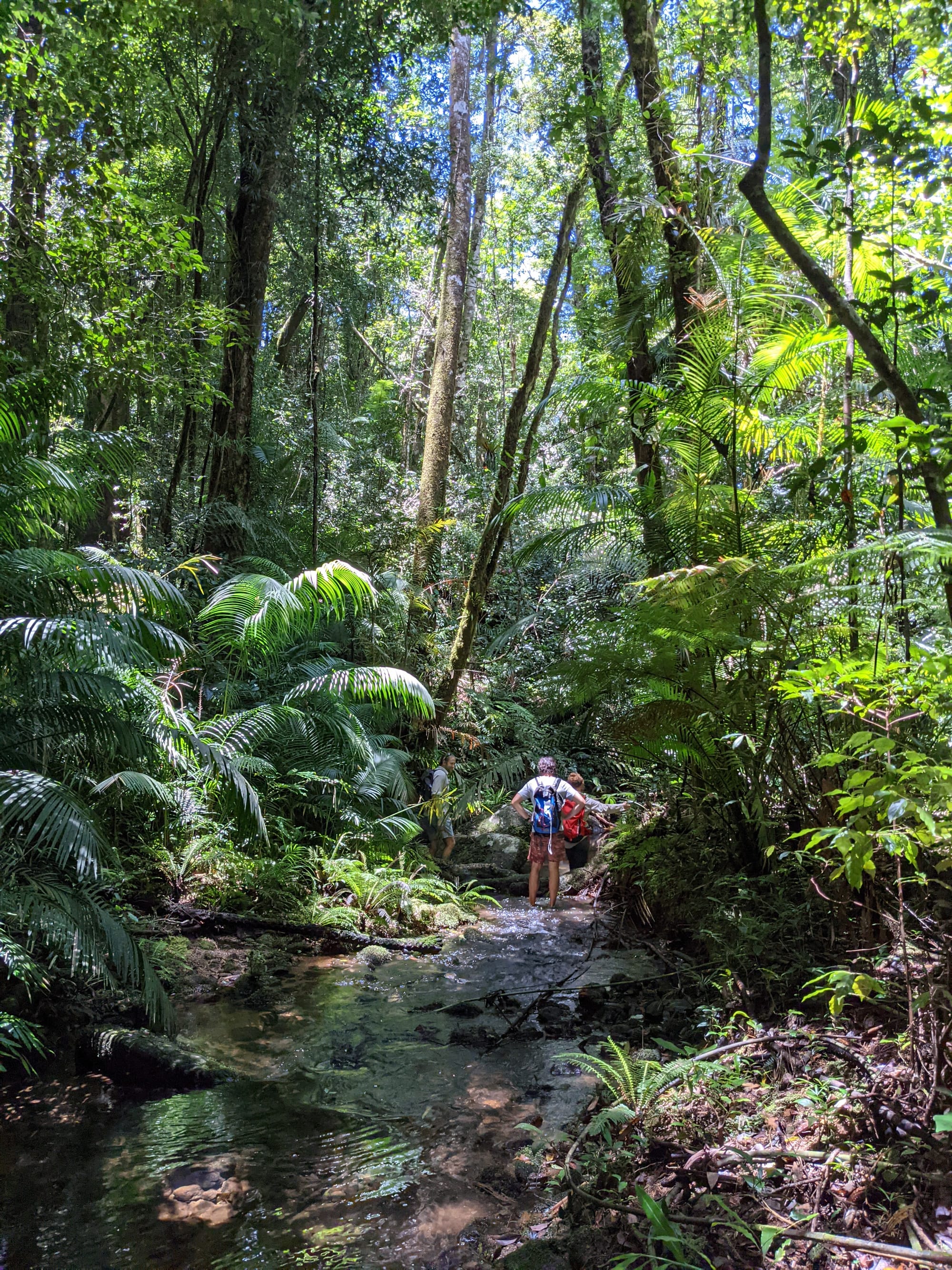 The creek winds its way gently at first. Ferns line the banks. Tree roots clutch at the soil like grasping hands. It feels enclosed and lush, textbook tropical rainforest.