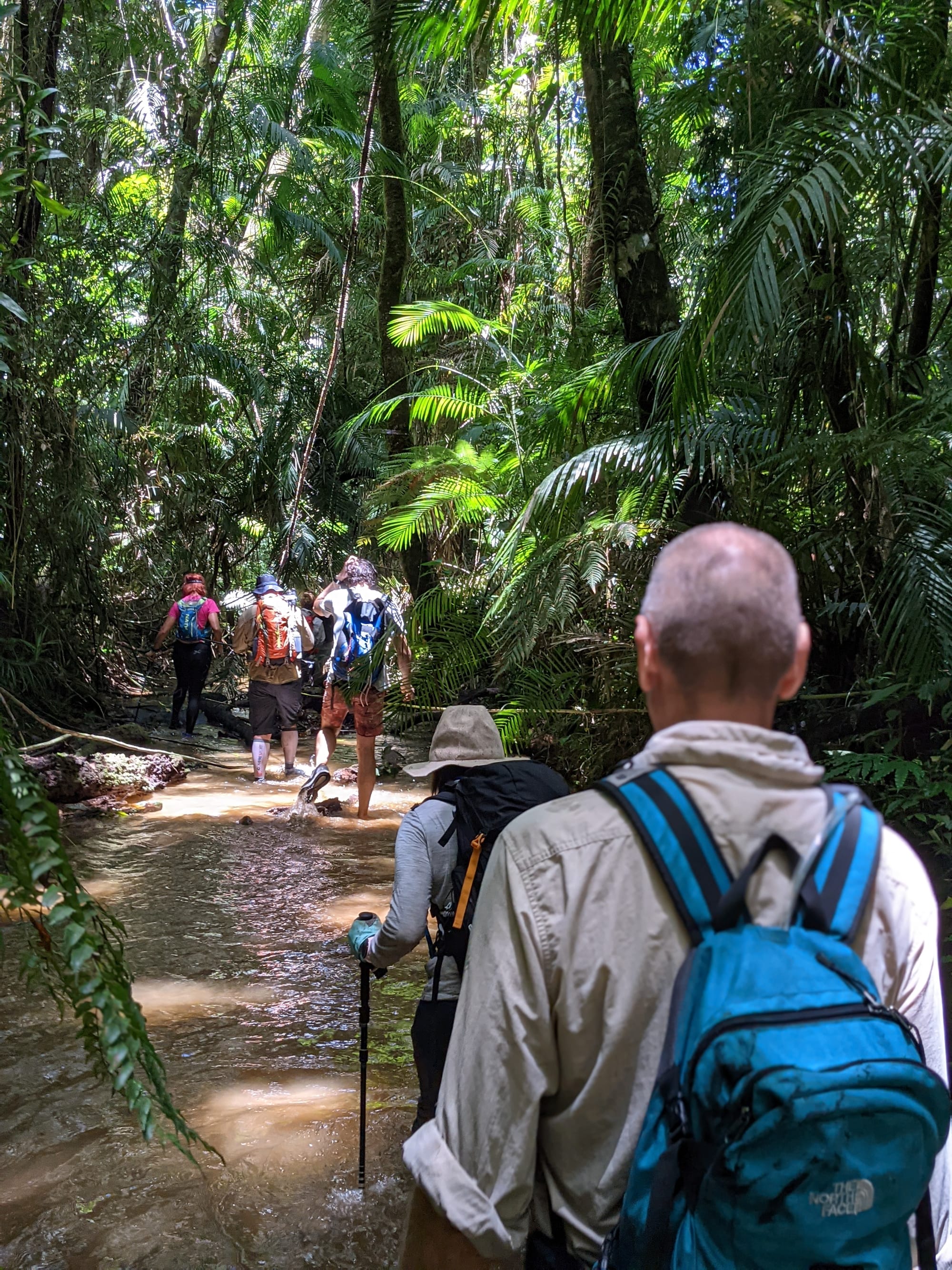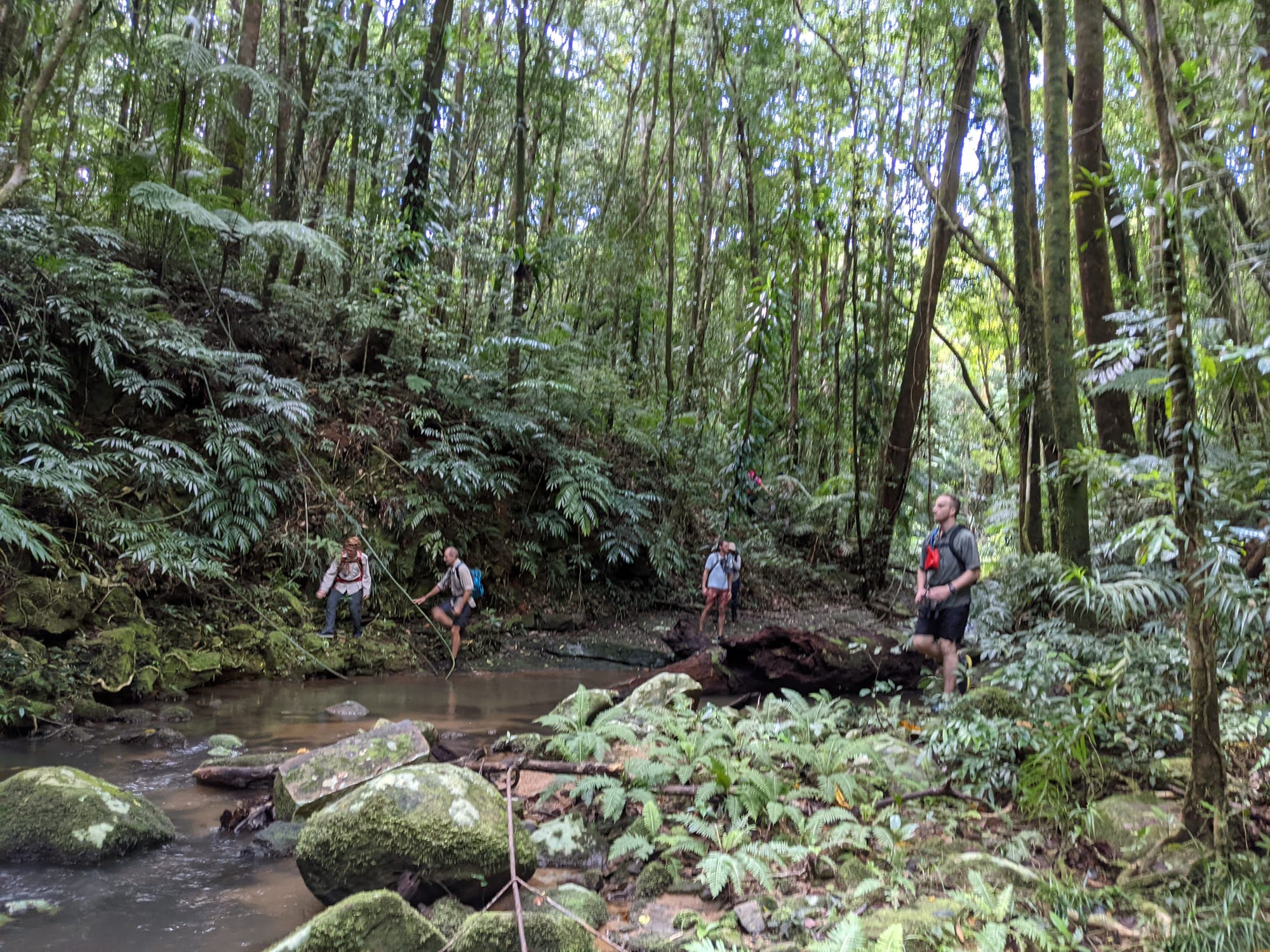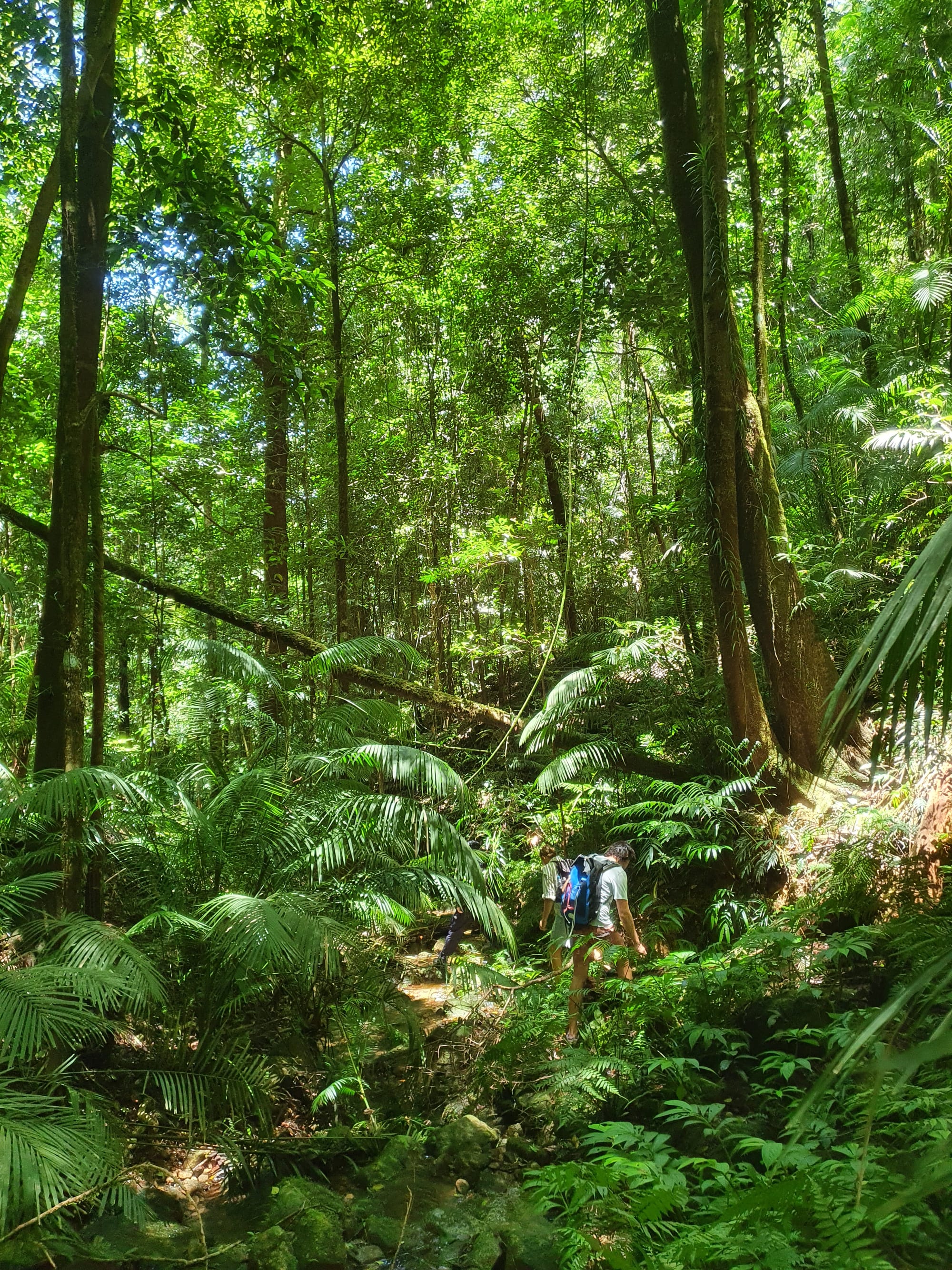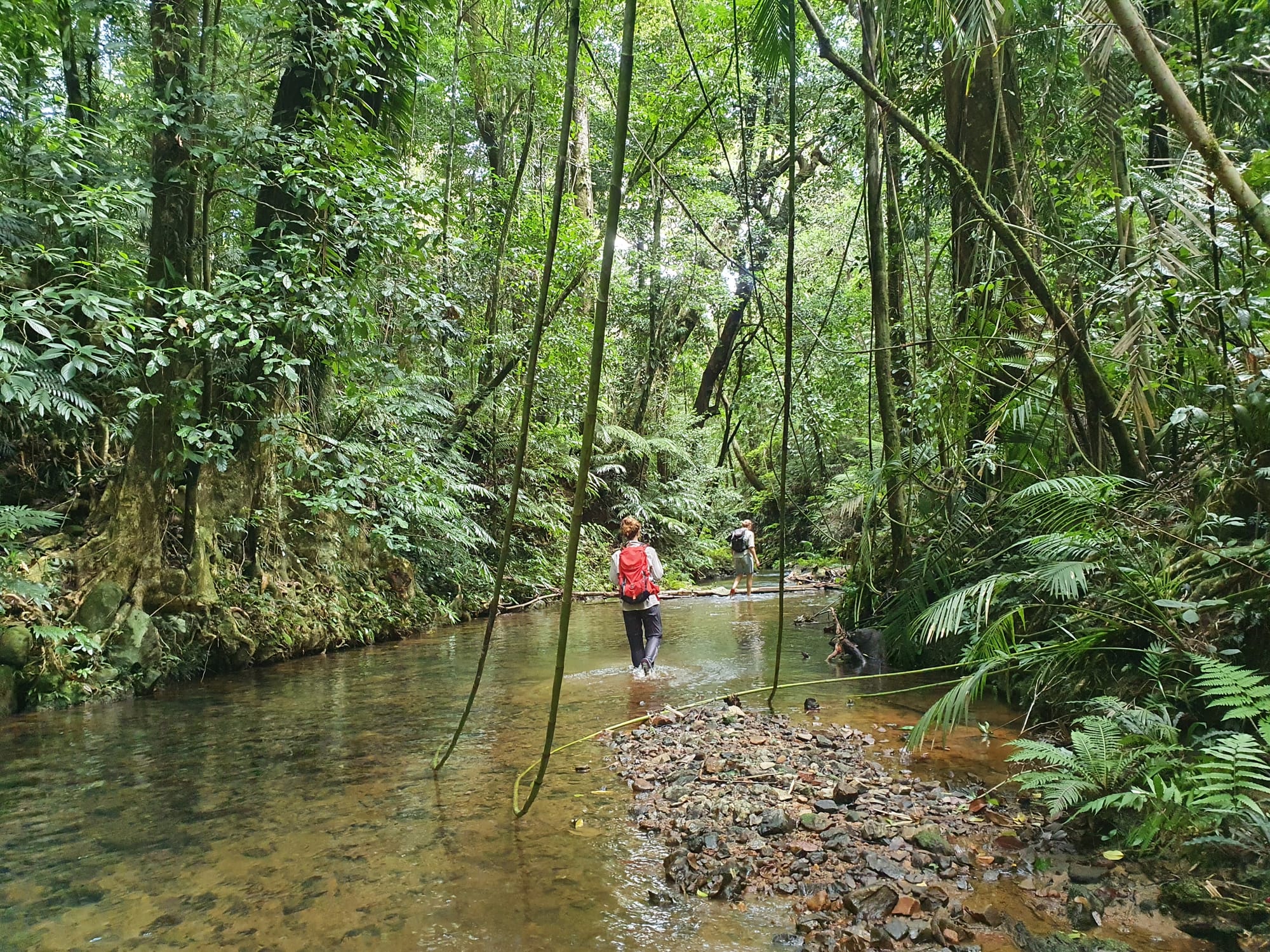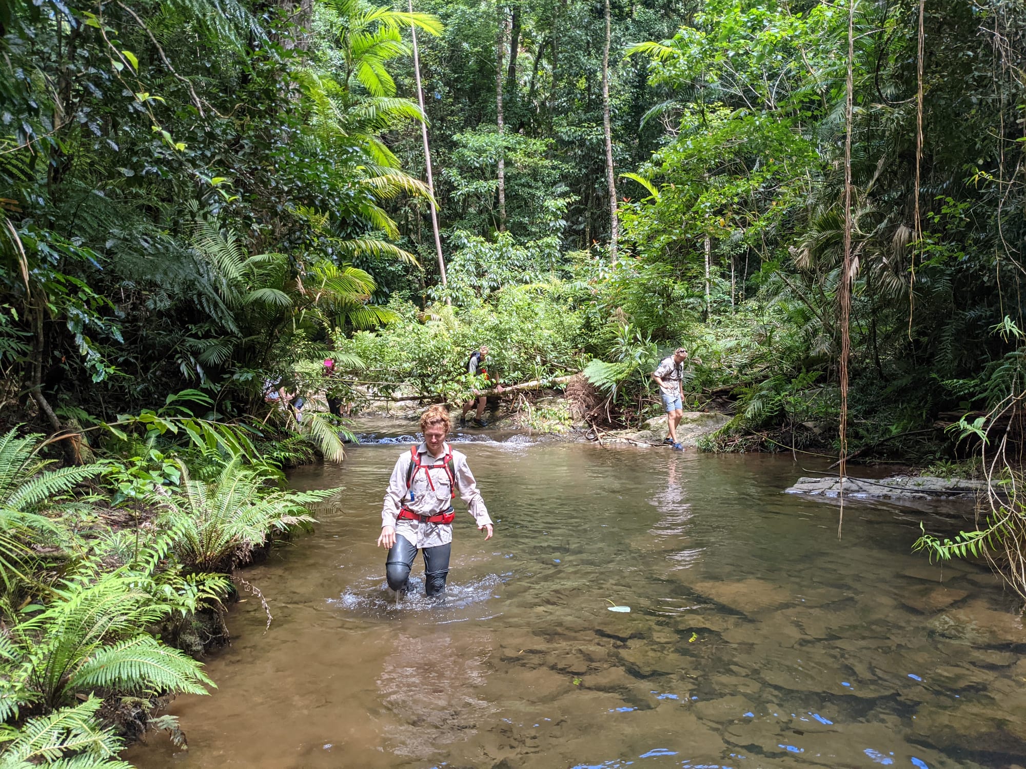 The creek winds its way gently at first. Ferns line the banks. Tree roots clutch at the soil like grasping hands. It feels enclosed and lush, textbook tropical rainforest.