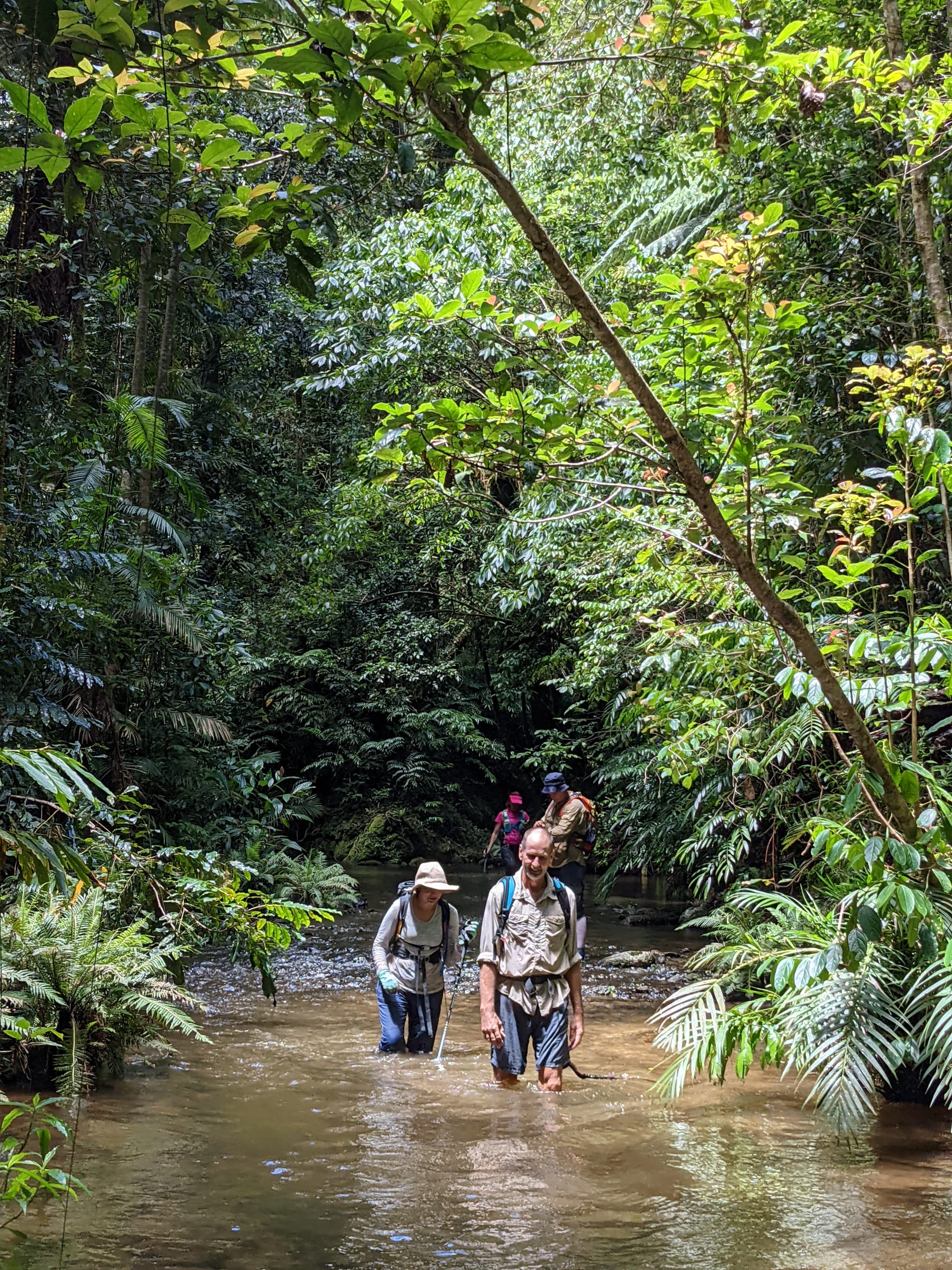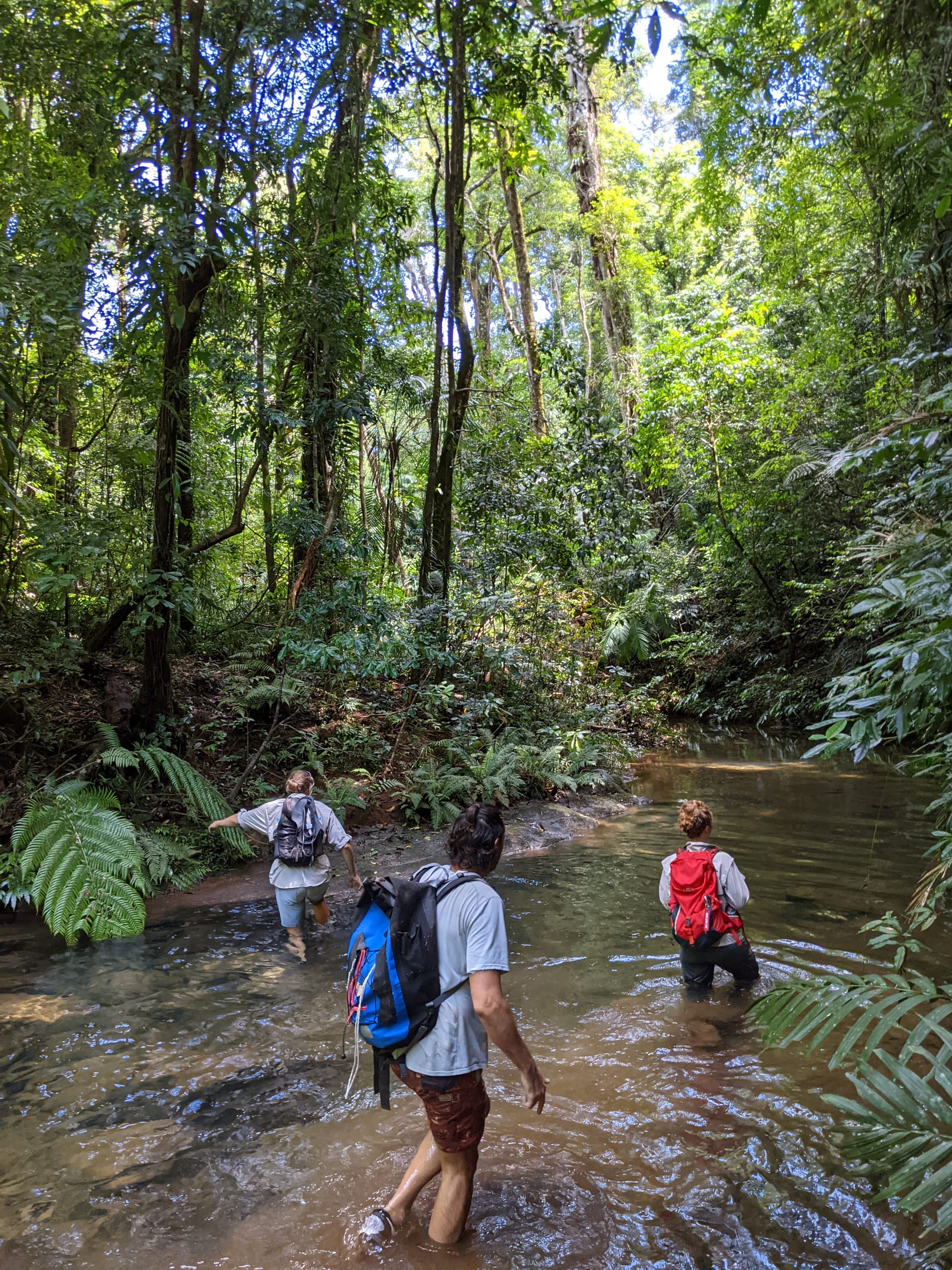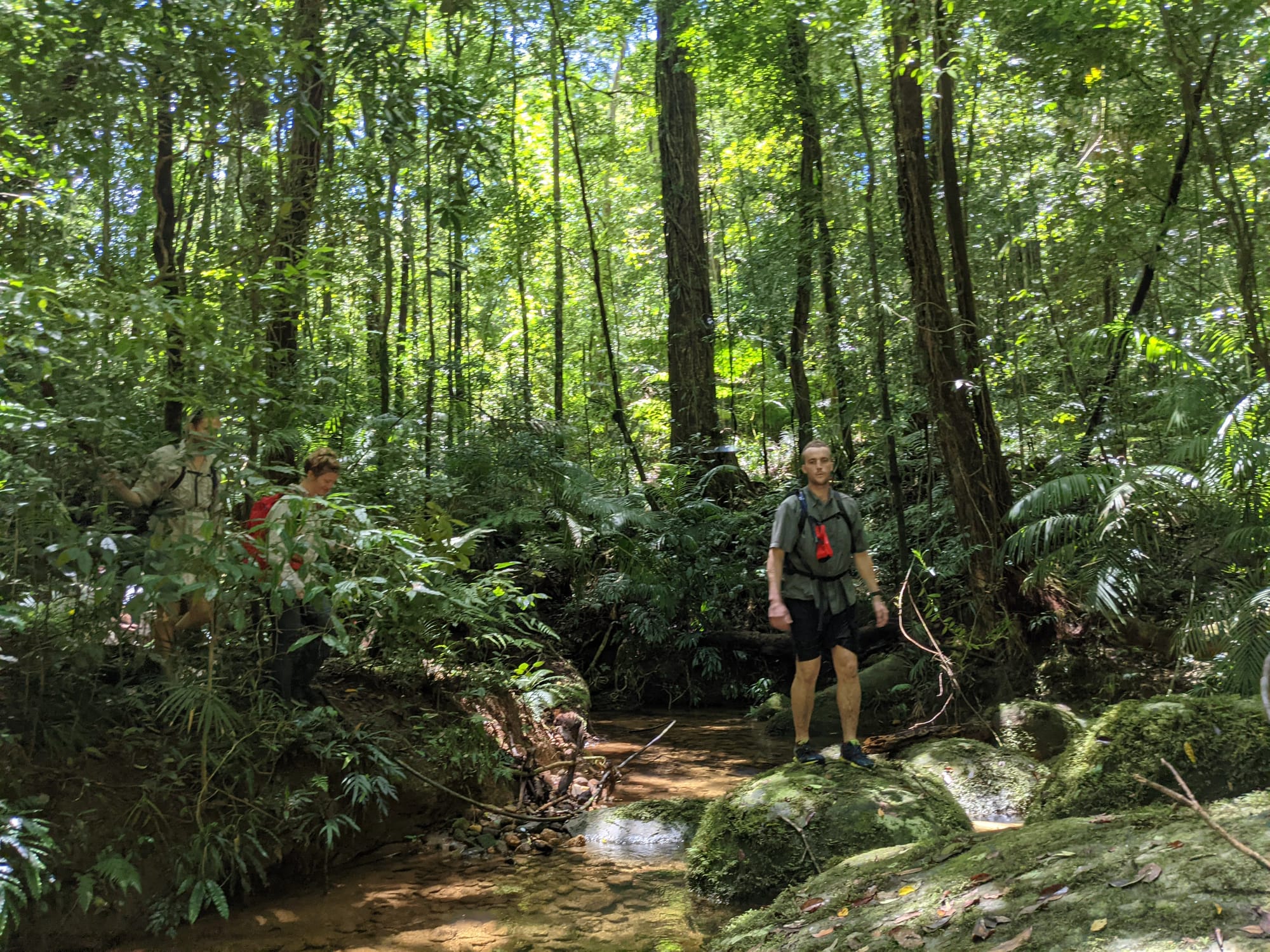 After a bit of thick rainforest, we reached the creek - a flat sandy bed, tea-coloured water, and dense rainforest pressing in on both sides. Upper Gold Creek is a beautiful system. The walking is surprisingly pleasant in sections, sandy and flat, with small cascades and granite features beginning to appear as you move downstream.