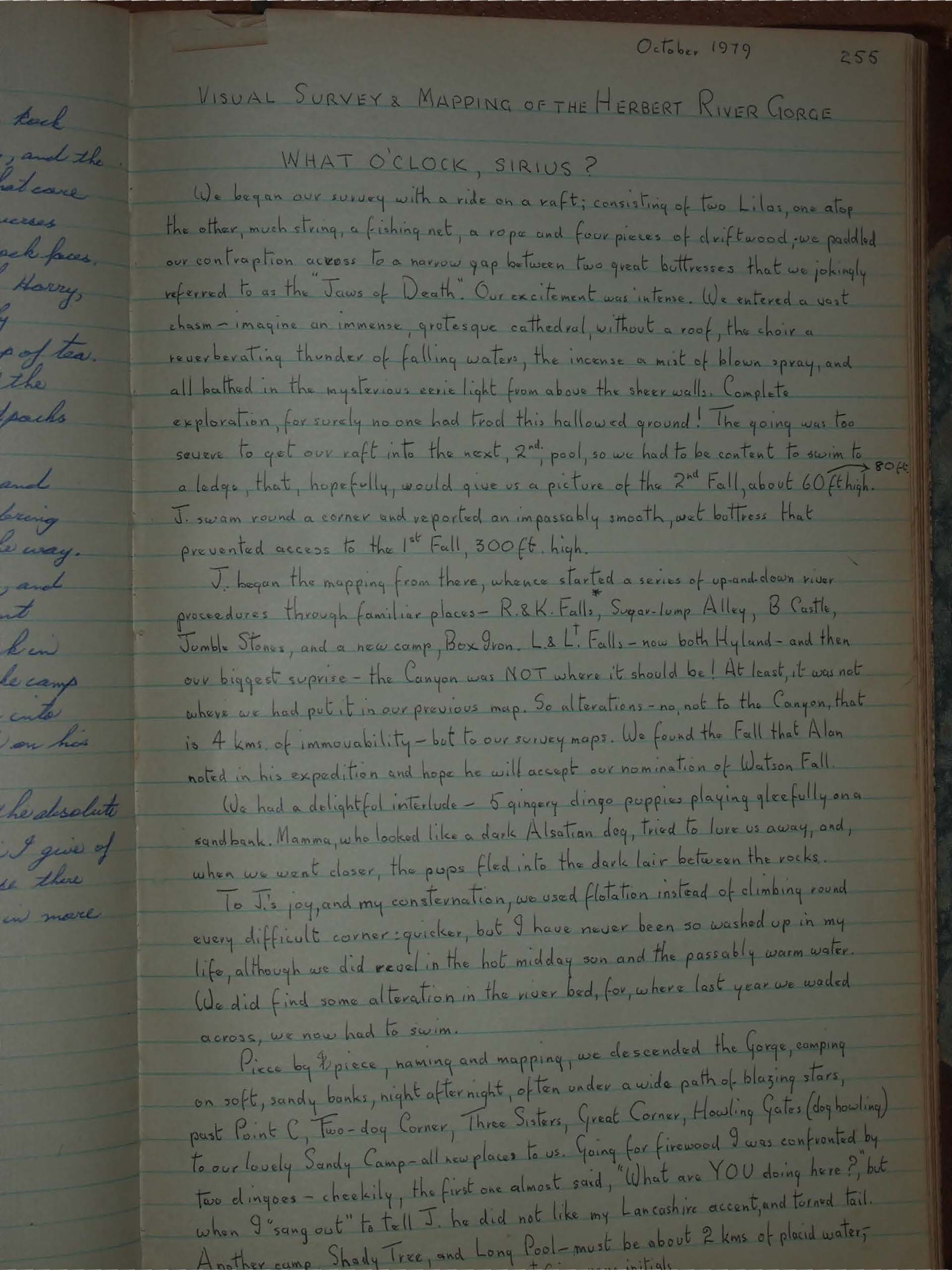 Piece by piece, naming and mapping, we descended the Gorge, camping on soft, sandy banks, night after night, often under a wide path of blazing stars, past Point C, Two-dog Corner, Three Sisters, Great Corner, Howling Gates (dog howling) to our lovely Sandy Camp – all new places to us. Going for firewood I was confronted by two dingoes – cheekily, the first one almost said, "What are YOU doing here?", but when I "sang out" to tell J. he did not like my Lancashire accent, and turned tail. Another camp Shady Tree, and Long Pool – must be about 2 kms of placid water;