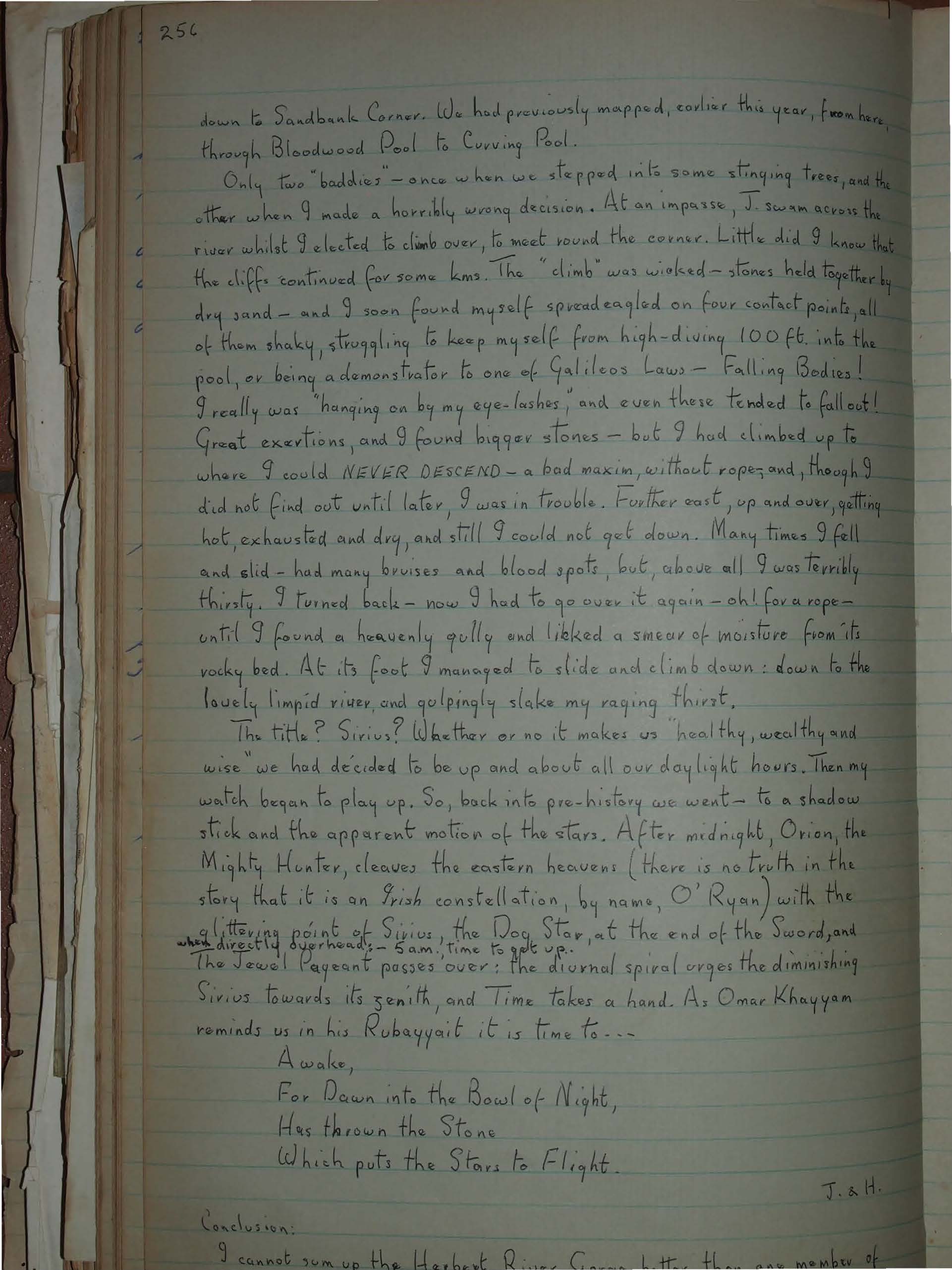 Only two "baddies" – once when we stepped into some stinging trees, and the other when I made a horribly wrong decision. At an impasse, J. swam across the river whilst I elected to climb over, to meet round the corner. Little did I know that the cliffs continued for some kms. The "climb" was wicked – stones held together by dry sand – and I soon found myself spreadeagled on four contact points, all of them shaky, struggling to keep myself from high-diving 100 ft. into the pool, or being a demonstrator to one of Galileo's Laws – Falling Bodies! I really was "hanging on by my eye-lashes," and even these tended to fall out! Great exertions, and I found bigger stones – but I had climbed up to where I could NEVER DESCEND – a bad maxim, without ropes; and, though I did not find out until later, I was in trouble. Further east, up and over, getting hot, exhausted and dry, and still I could not get down. Many times I fell and slid – had many bruises and blood spots, but, above all I was terribly thirsty. I turned back – now I had to go over it again – oh! for a rope – until I found a heavenly gully and licked a smear of moisture from its rocky bed. At its foot I managed to slide and climb down: down to the lovely limpid river, and gulpingly slake my raging thirst.