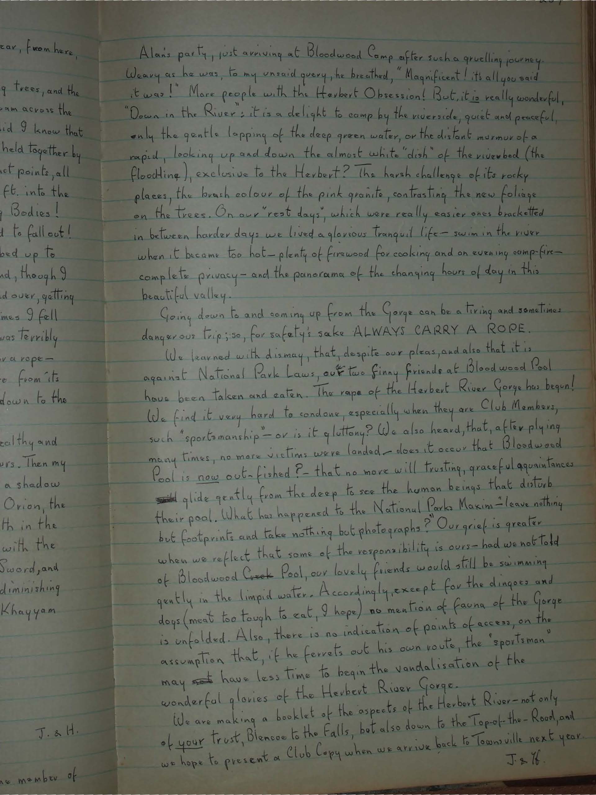 We find it very hard to condone, especially when they are Club Members, such "sportsmanship" - or is it gluttony? We also heard, that, after plying many times, no more victims were landed - does it occur that Bloodwood Pool is now out-fished? - that no more will trusting, graceful acquaintances glide gently from the deep to see the human beings that disturb their pool. What has happened to the National Parks Maxim - "leave nothing but footprints and take nothing but photographs"? Our grief is greater when we reflect that some of the responsibility is ours - had we not told of Bloodwood Creek Pool, our lovely friends would still be swimming gently in the limpid water. Accordingly, except for the dingoes and dogs (meat too tough to eat, I hope) no mention of fauna of the Gorge is unfolded. Also, there is no indication of points of access, on the assumption that, if he ferrets out his own route, the "sportsman" may have less time to begin the vandalisation of the wonderful glories of the Herbert River Gorge.