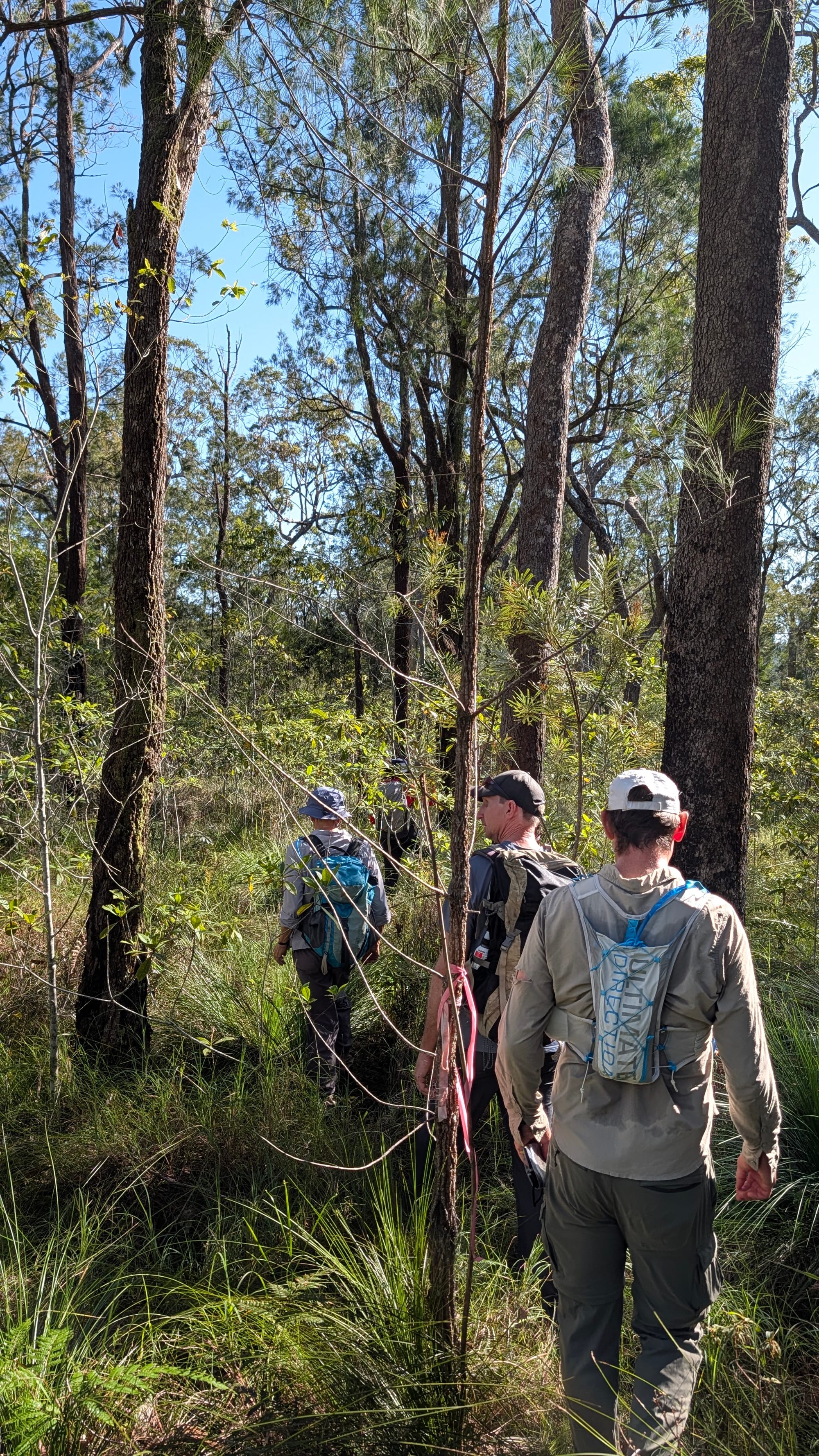 The day was split into three parts. The first section involved following a GPX track, a rough footpad, and pink tape. This proved straightforward enough and gave everyone a chance to settle in, compare what they could see on the ground with what appeared on their devices, and start thinking about route choice in a practical setting.