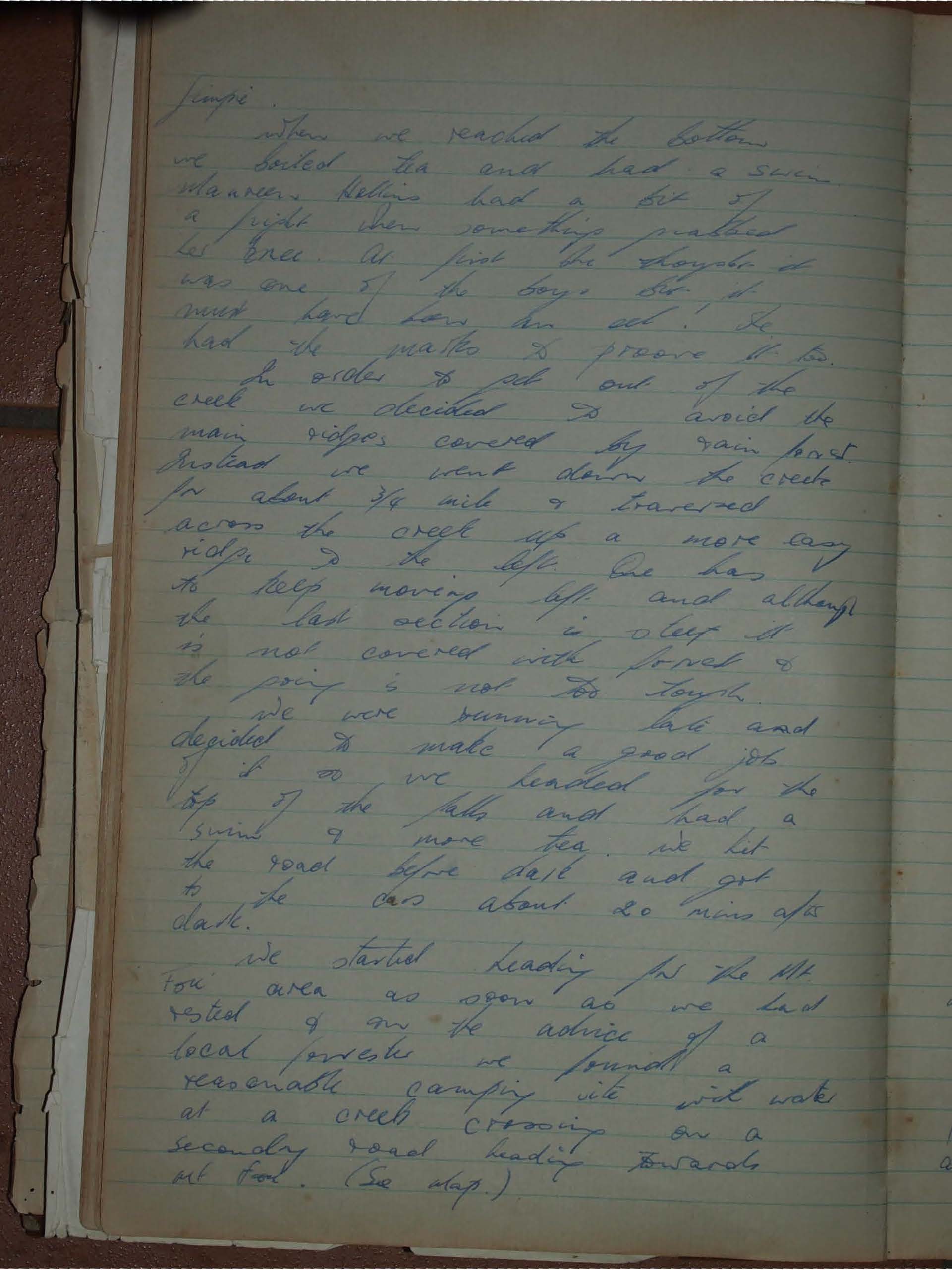 When we reached the bottom we boiled tea and had a swim. manners. Robins had a bit of a fight. Then something pricked Les' knee. At first he thought it was one of the boys' but it must have been an ant. He had the marks to prove it.