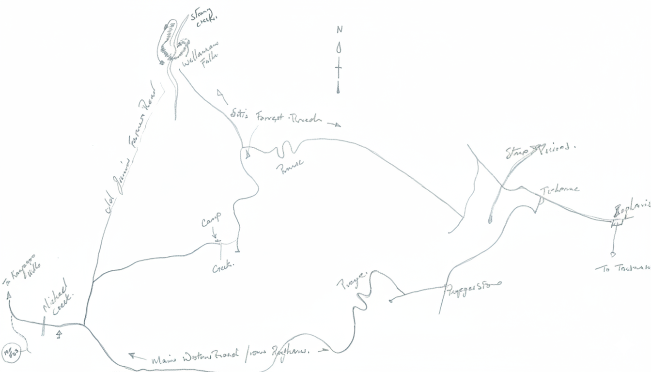 We entered the Seaview Range area via the forestry road which is still under construction at the end but is an excellent road except for the real crazy sections. We had to leave our cars about 2 miles from the jeep track because of road construction. When following the road one must be careful not to miss the turnoff to the falls. (It's not signposted.)