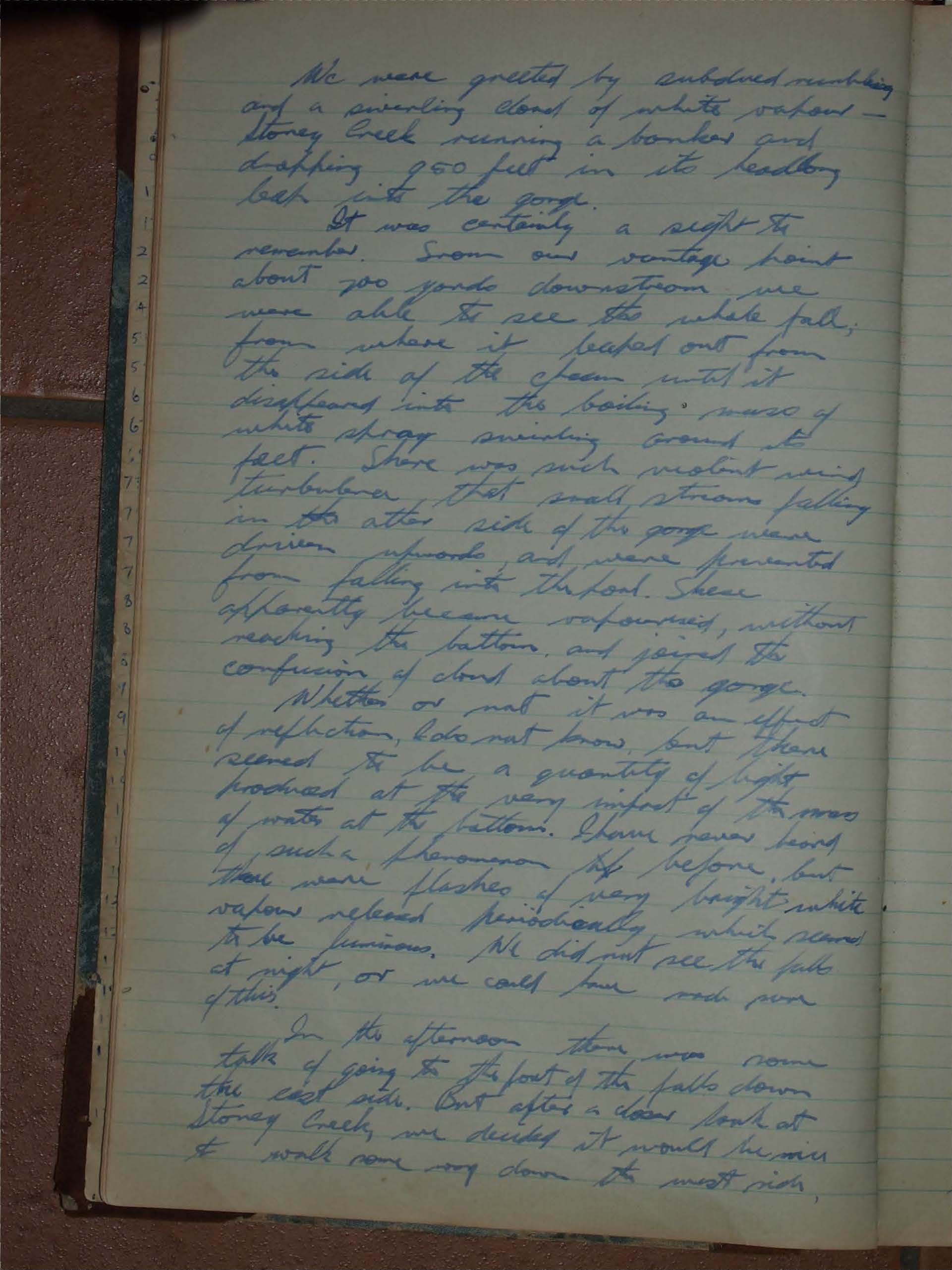 It was certainly a sight to remember. From our vantage point about 700 yards downstream we were able to see the whole fall; from where it leaped out from the side of the chasm until it disappeared into the boiling mass of white spray swirling around its feet. There was such violent wild turbulence, that small streams falling in the other side of the gorge were driven upwards, and were prevented from falling with the pool. These apparently became vapourized, without reaching the bottom, and joined the confusion of cloud about the gorge.