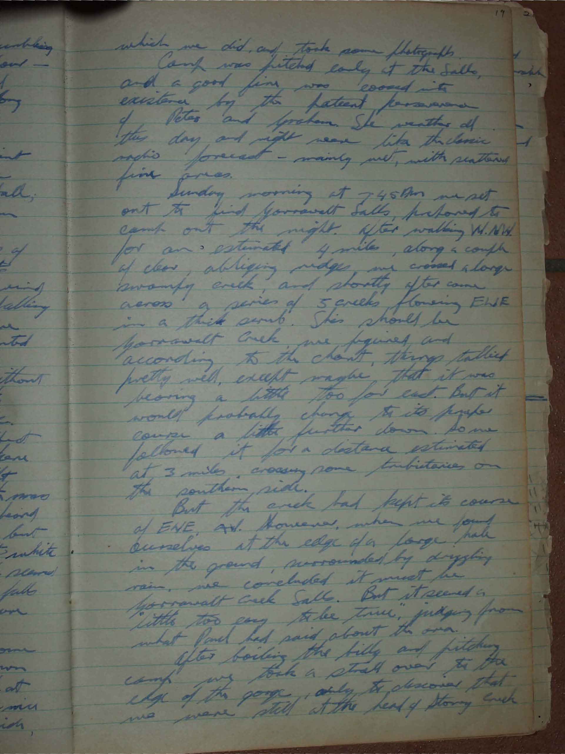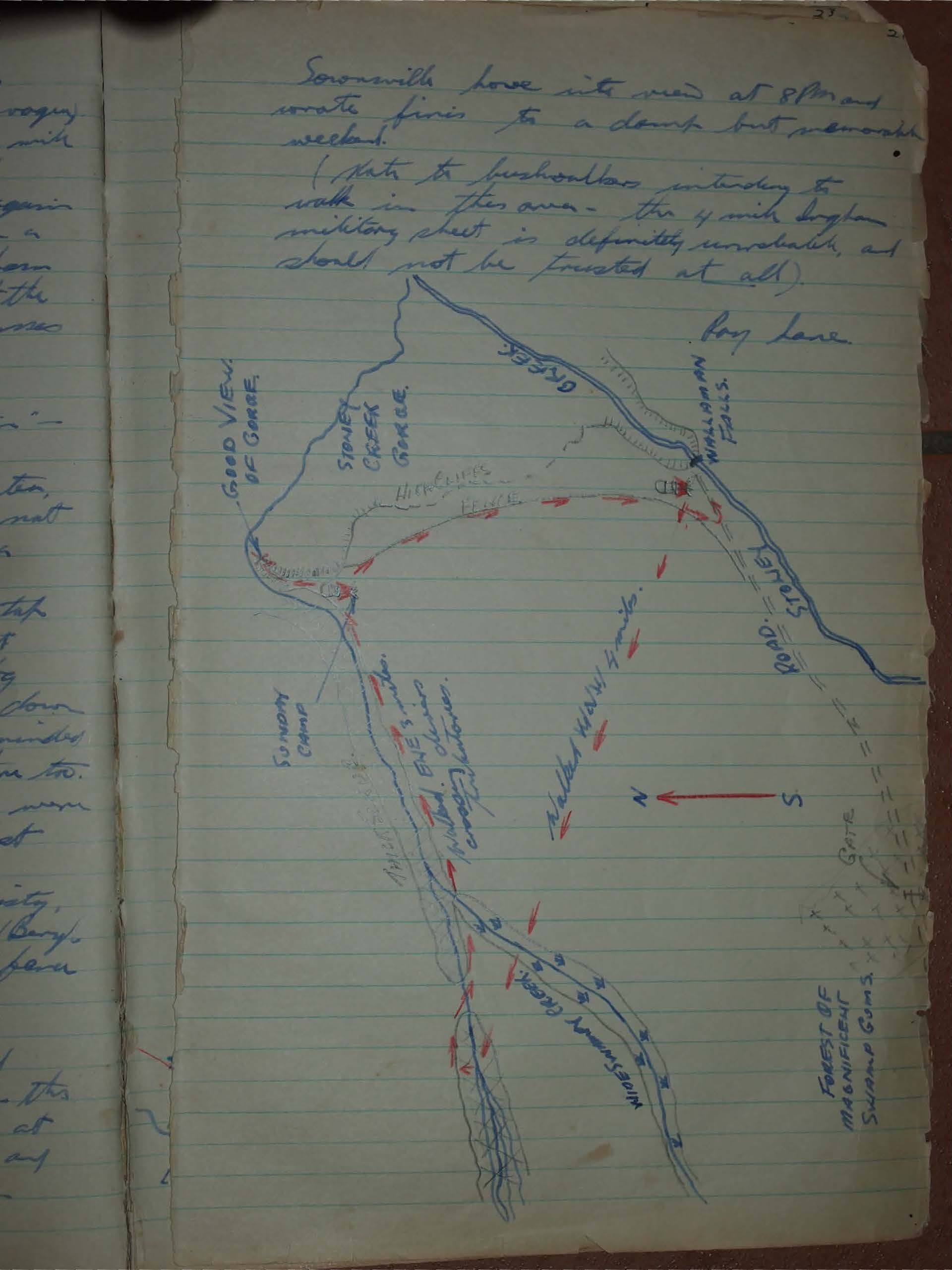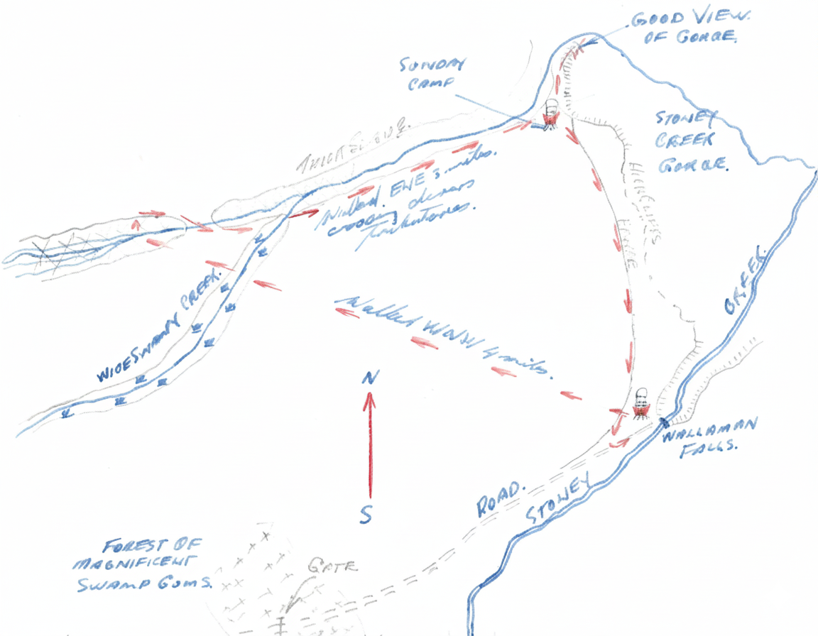 Sunday morning at 7.45 AM we set out to find Garrawalt Falls, purposed to camp out the night. After walking W.N.W. for an estimated 4 miles, along a couple of clear, obliging ridges, we crossed a larger swampy creek, and shortly after came across a series of 5 creeks flowing E to S.E. in a thick scrub. This should be Garrawalt Creek we figured, and according to the chart, things tallied pretty well, except maybe that it was bearing a little too far east. But it would probably change to its proper course a little further down. So we followed it for a distance estimated at 3 miles, crossing some tributaries on the southern side.
